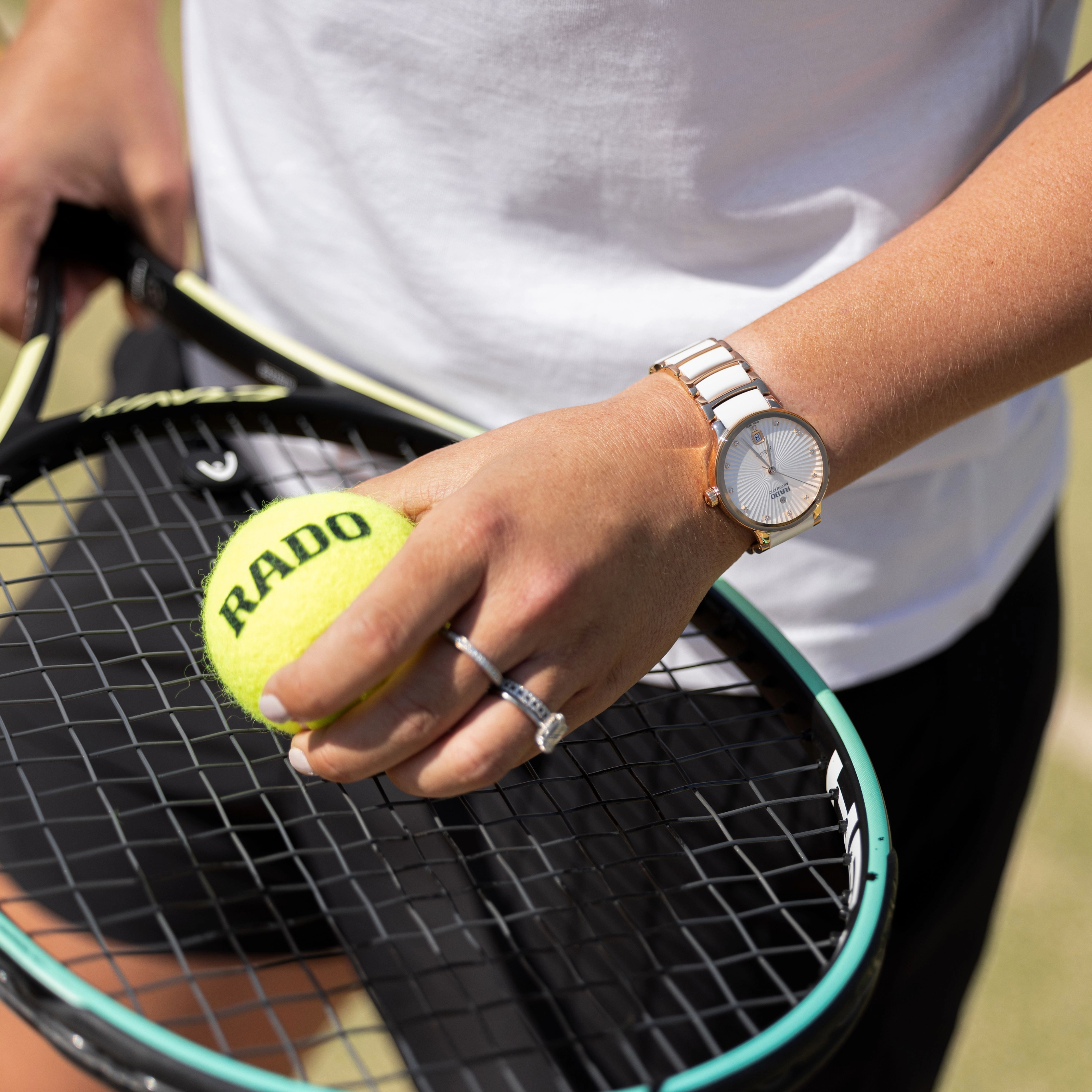 Strictly limited to 996 numbered pieces (Ash was born in 1996), the new watch is a three-hand quartz model. A curved sapphire crystal, anti-reflective on both faces, offers a clear view of an enchanting blue mother-of-pearl dial with three jubilé diamonds at 12 o’clock, rhodium-coloured dauphine hands and applied indexes, a date window at 3 o’clock and a moving rhodium-coloured tennis ball centred in the lower half at 6 o’clock. Both the monobloc case and 3-row bracelet are fashioned in Rado’s signature polished plasma high-tech ceramic.
