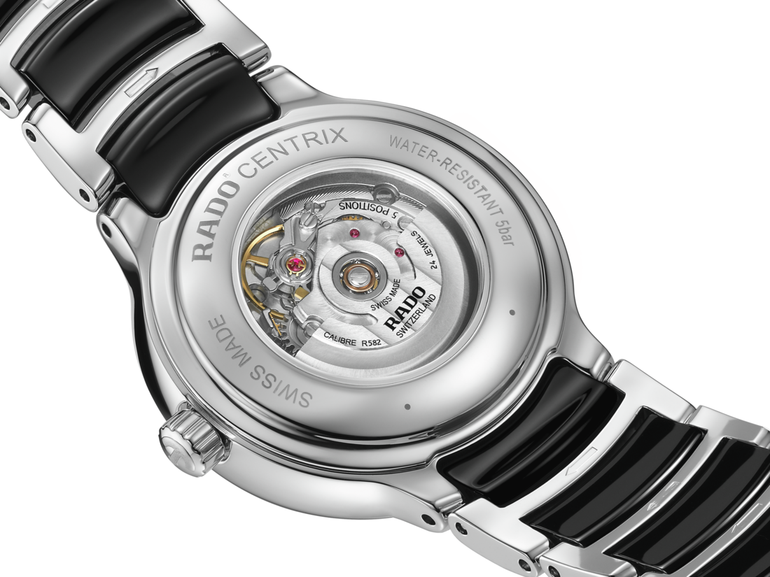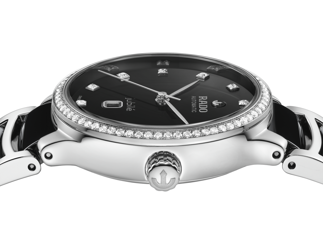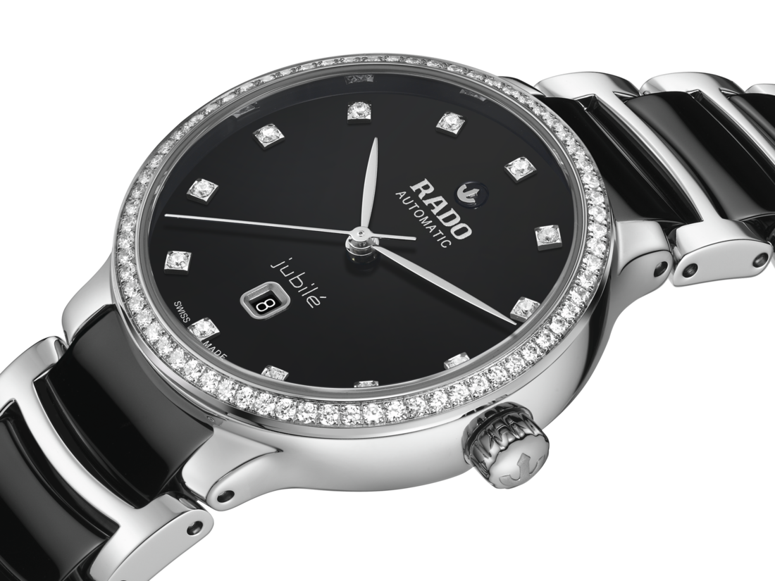 Experience the Centrix Super Jubilé – a blend of artistic expression and refined design. Crafted in stainless steel, the 30.5 mm case is refined with a luxurious bezel set with 68 Top Wesselton, VS-SI, brilliant cut diamonds. In addition, the curved sapphire crystal features an anti-reflective coating on both sides, ensuring unmatched readability. At the heart of this watch beats the R582 automatic calibre, which is visible through the sapphire crystal case back. The movement is equipped with an antimagnetic Nivachron™ hairspring, delivering exceptional accuracy and a 48-hour power reserve. The black lacquered dial is adorned with 12 Top Wesselton, VS-SI, brilliant cut diamond indexes and a date window at 6 o’clock. The neat look is completed with a stainless-steel bracelet with black high-tech ceramic middle links. Finally, the bracelet features a triple-fold stainless steel clasp.