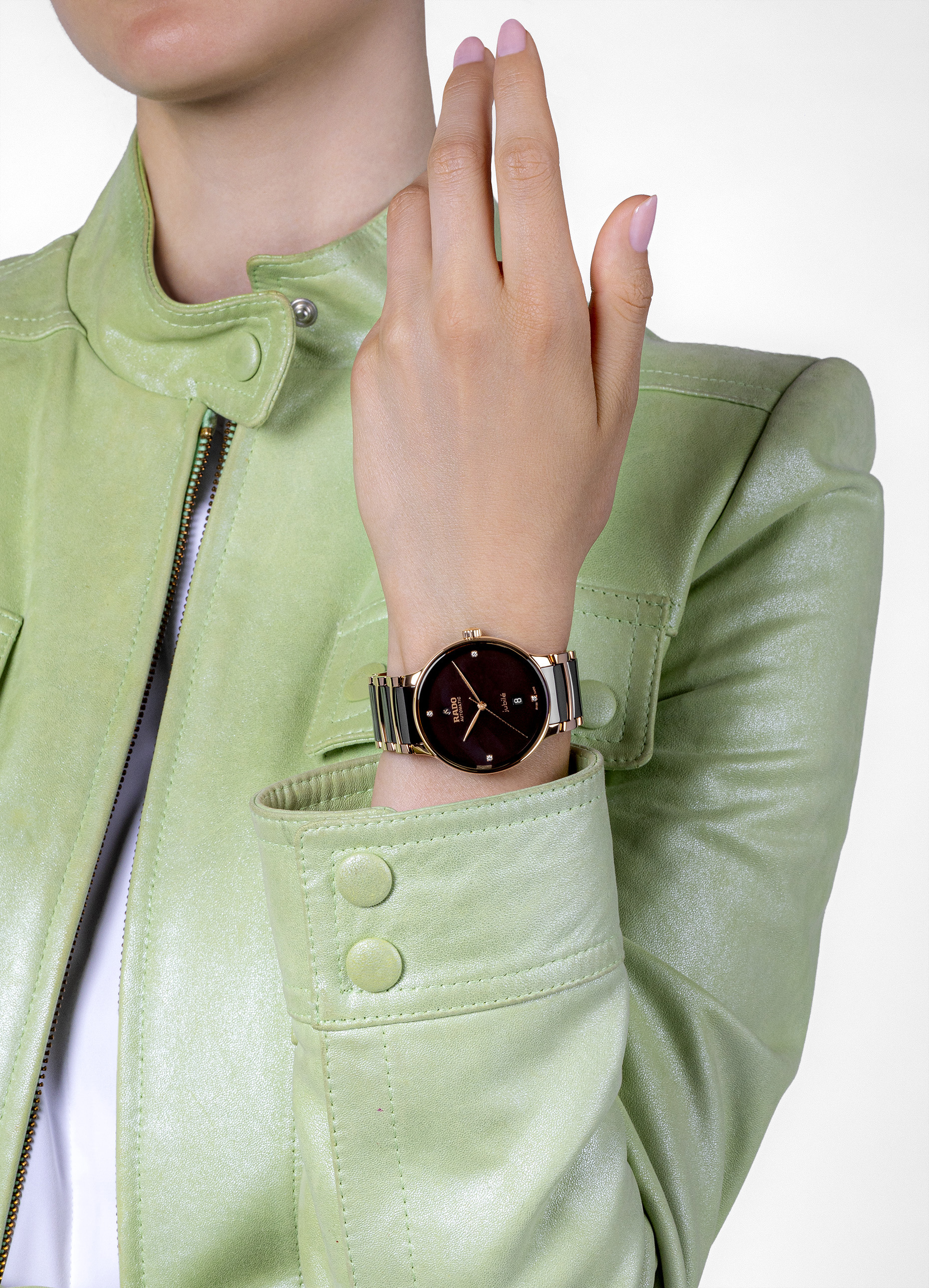 The classic Centrix Automatic Diamonds watch has been reworked not only technically, but also aesthetically. The modified model has a rounded sapphire crystal that extends all the way to the edge, as well as a curved case blending with the curved crystal edge. The overall appearance of this iconic timepiece is completed with adjusted case lugs and a bracelet made of polished rose-gold-coloured PVD-coated stainless steel with brown high-tech ceramic middle links. The brown lacquered dial with 4 diamonds, emphasised with the printed “jubilé” logo, matches perfectly with the rose-gold-coloured hands. Inside, the three-hand calibre R763 movement exceeds standard accuracy test requirements from 3 to 5 positions, thanks to its antimagnetic Nivachron™ hairspring for increased reliability and accuracy. The watch is water resistant down to 50 m and offers 80 hours of power reserve.