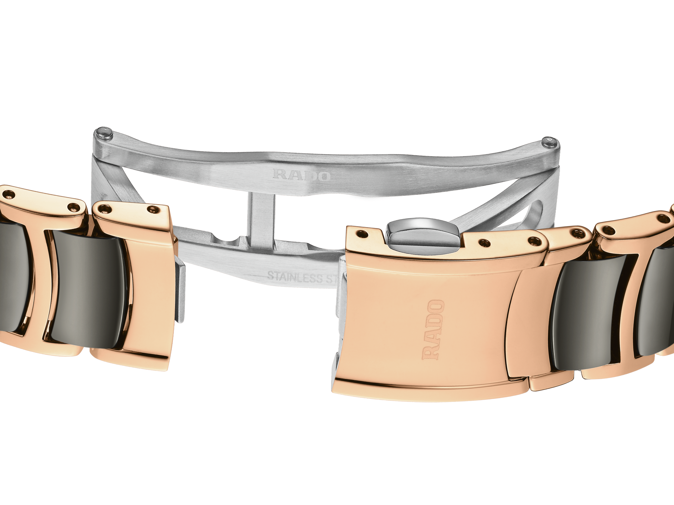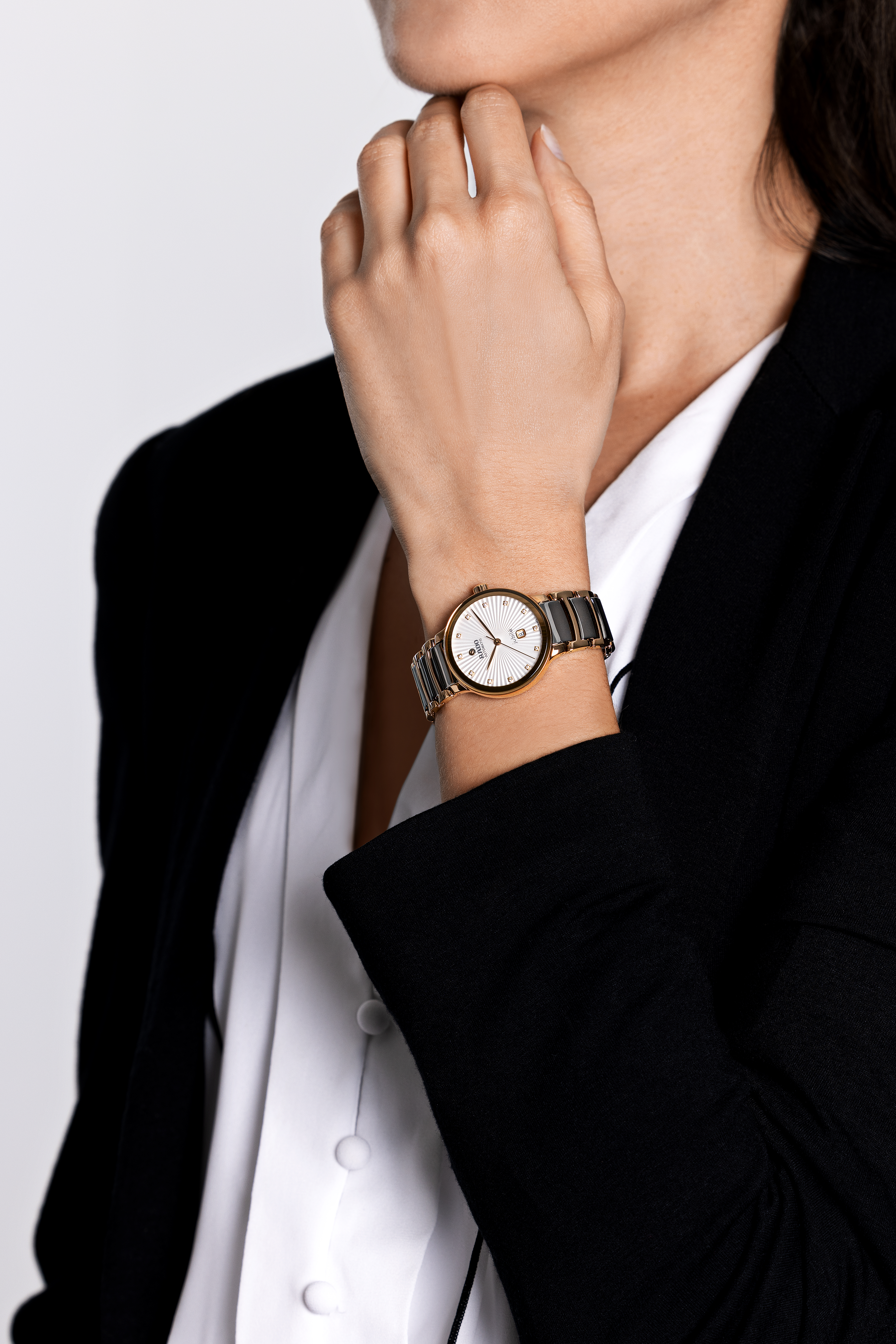 The classic Centrix Automatic Diamonds watch has been reworked not only technically, but also aesthetically. The modified model has a rounded sapphire crystal that extends all the way to the edge and a curved case blending with the curved crystal edge. The overall appearance of this iconic timepiece is completed with adjusted case lugs and a bracelet made of polished rose-gold-coloured PVD-coated stainless steel with plasma high-tech ceramic middle links. The silver-white facetted dial has an opulent 3D effect created by stamping a shaped dial and then filling it with lacquer. Inside, the three-hand calibre R582 movement exceeds standard accuracy test requirements from 3 to 5 positions, thanks to its antimagnetic Nivachron™ hairspring for increased reliability and accuracy. The watch is water resistant down to 50 m and offers 48 hours of power reserve.