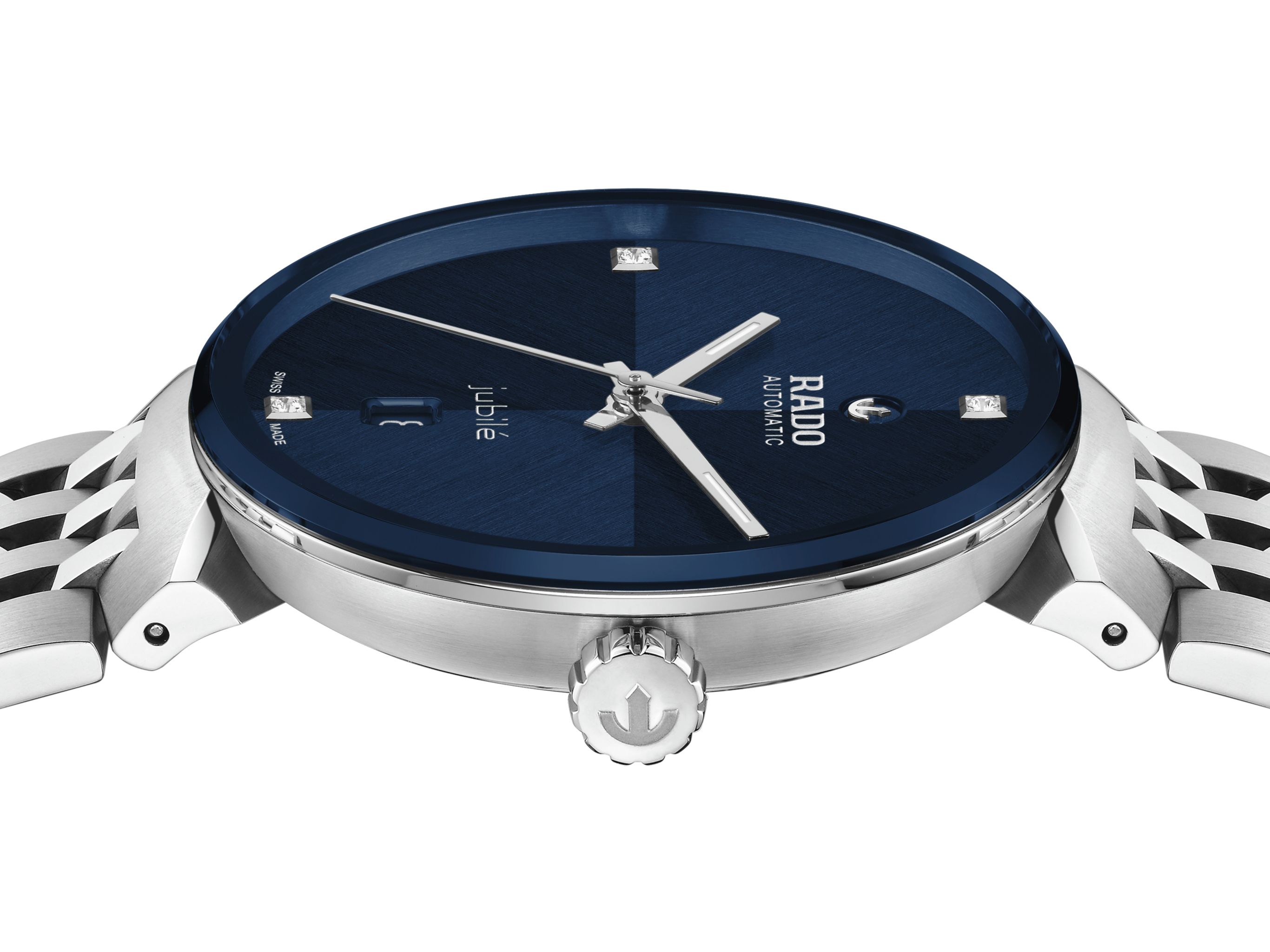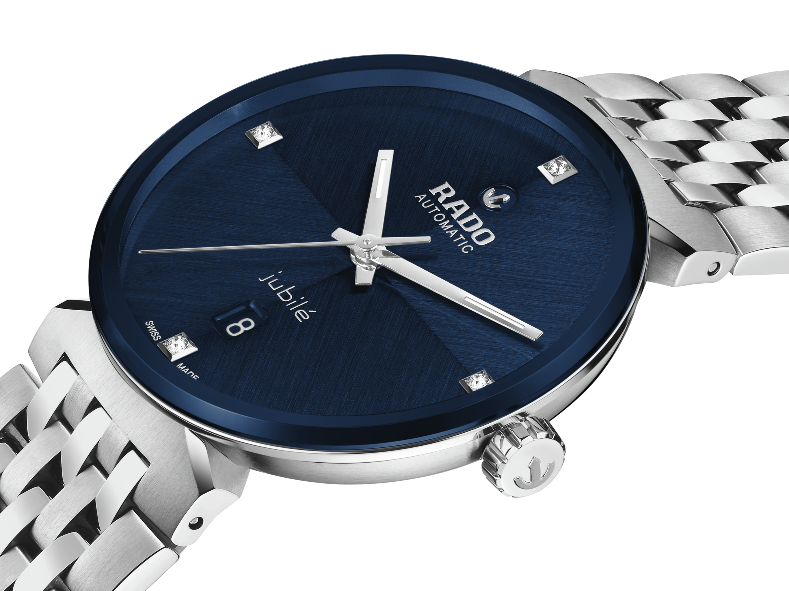 Inspired by the arts of the Italian Renaissance, Rado Florence blends excellence in design with Swiss made precision. The slim profile and premium seven-link bracelet guarantee comfort, and the edge-to-edge sapphire crystal glass covers the face of the watch, ensuring robust durability. Rhodium-coloured hands with white Super-LumiNova® highlights glide over the blue dial with four diamonds at 3, 6, 9 and 12 o’clock, and a bi-directional brushed surface. The blue metallisation and the blue background on the date display match the colour of the dial. Thanks to the box-shaped sapphire crystal exhibition case back, the designers could retain the iconic slim profile. The watch is powered by Rado calibre R763, an automatic 3-hand, 25-jewel movement with an 80-hour power reserve and an anti-magnetic NivachronTM hairspring for enhanced reliability and precision. This model’s refined aesthetic contrasts the sandblasted stainless steel case with the polished bezel and case back, taken up by the bracelet’s high-contrast sandblasted and polished links.