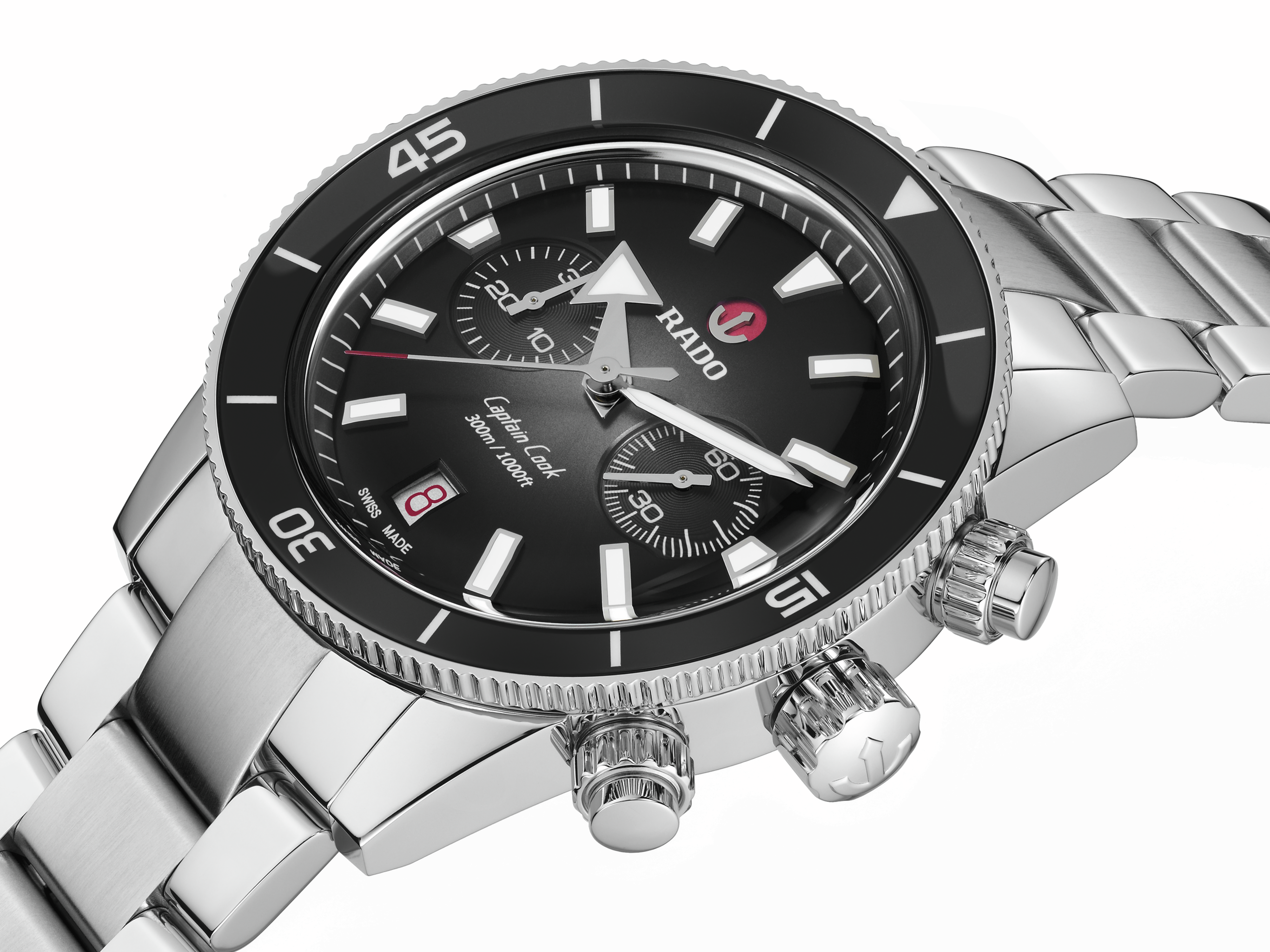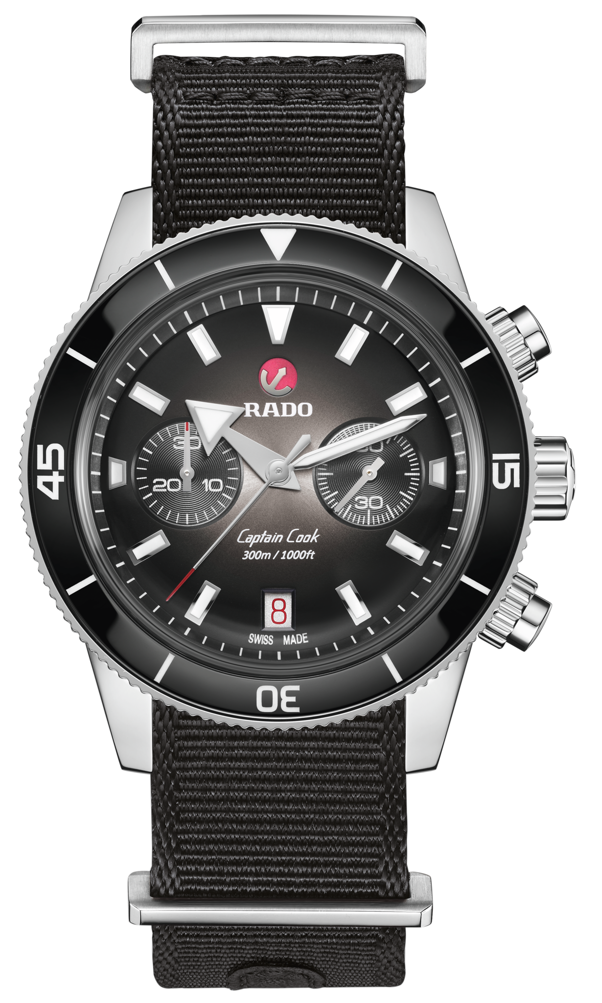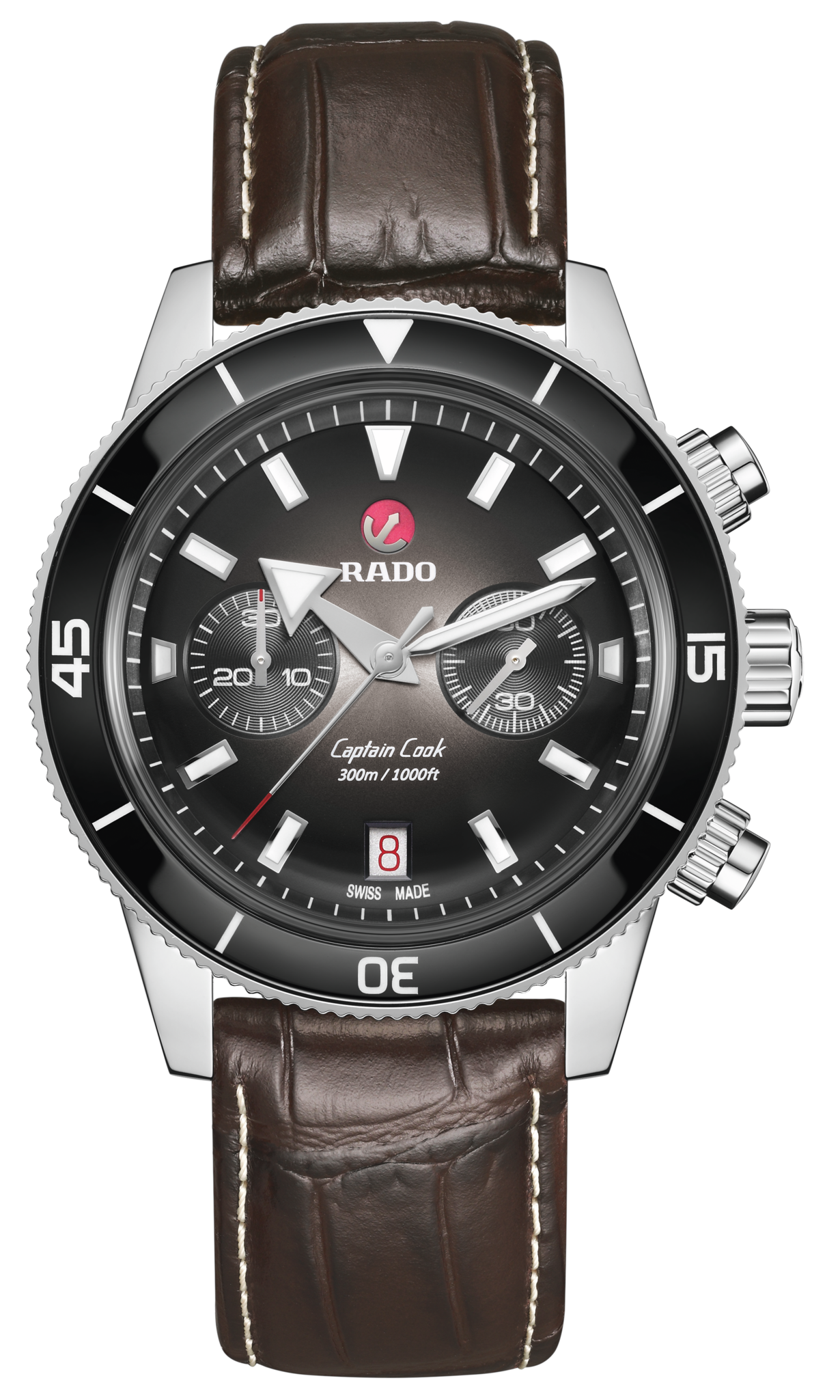The Captain Cook Chronograph wears a characteristic box-shaped, scratch-resistant sapphire crystal with anti-reflective treatment on both faces. The thin, stylish 43 mm stainless steel case features a polished black high-tech ceramic inlay on the bezel, complementing the silver-to-black gradient dial. The numbers, markers and triangles are treated with Super-LumiNova®. Inside, the new, thinner R801 automatic movement, with 37 jewels, five hands and 59 hours of power reserve thanks to an antimagnetic Nivachron™ hairspring, exceeds standard test requirements from 3 to 5 positions for higher accuracy. The model comes with a polished and brushed stainless steel bracelet, as well as a brown leather strap and an additional black fabric strap.