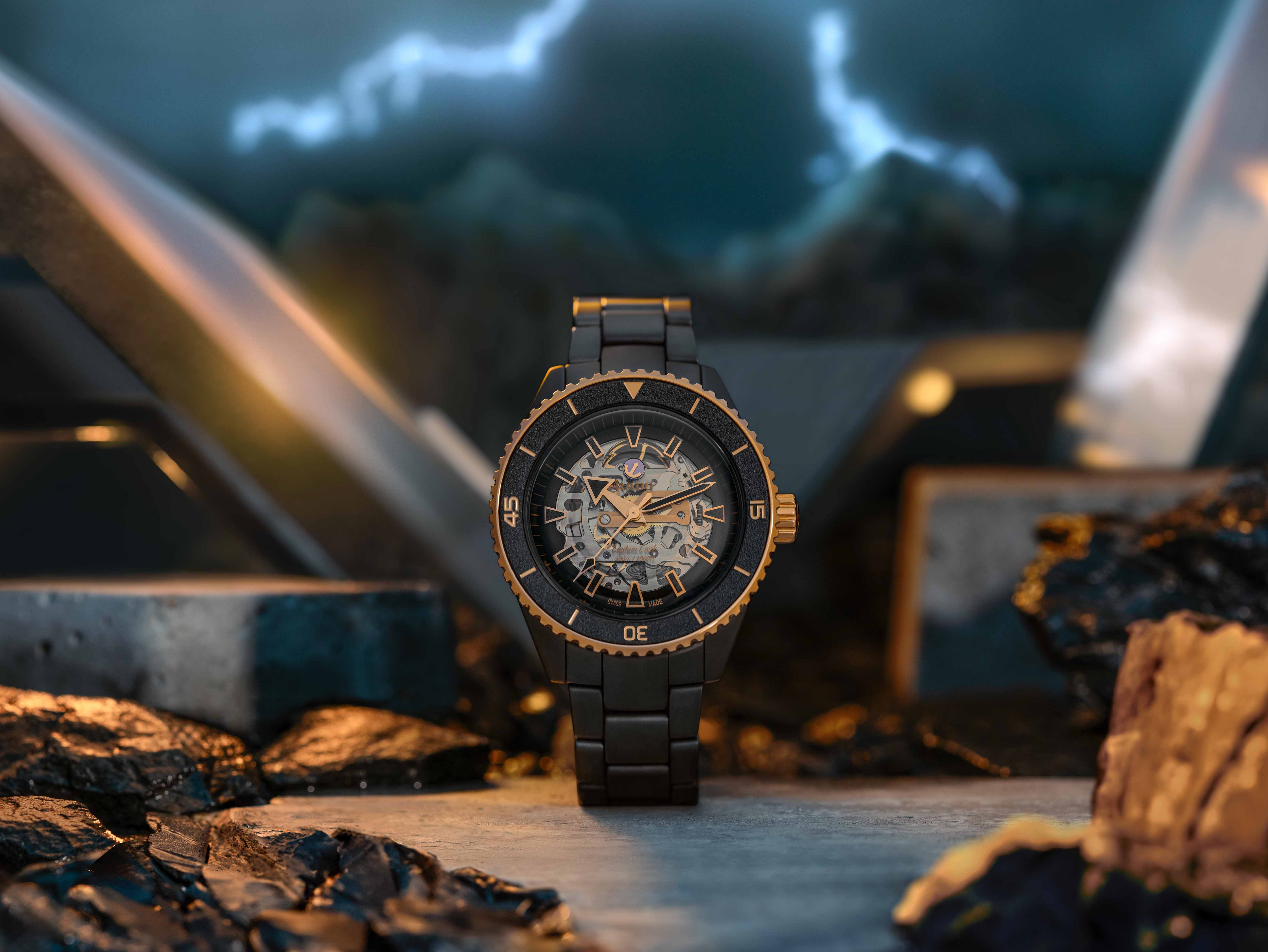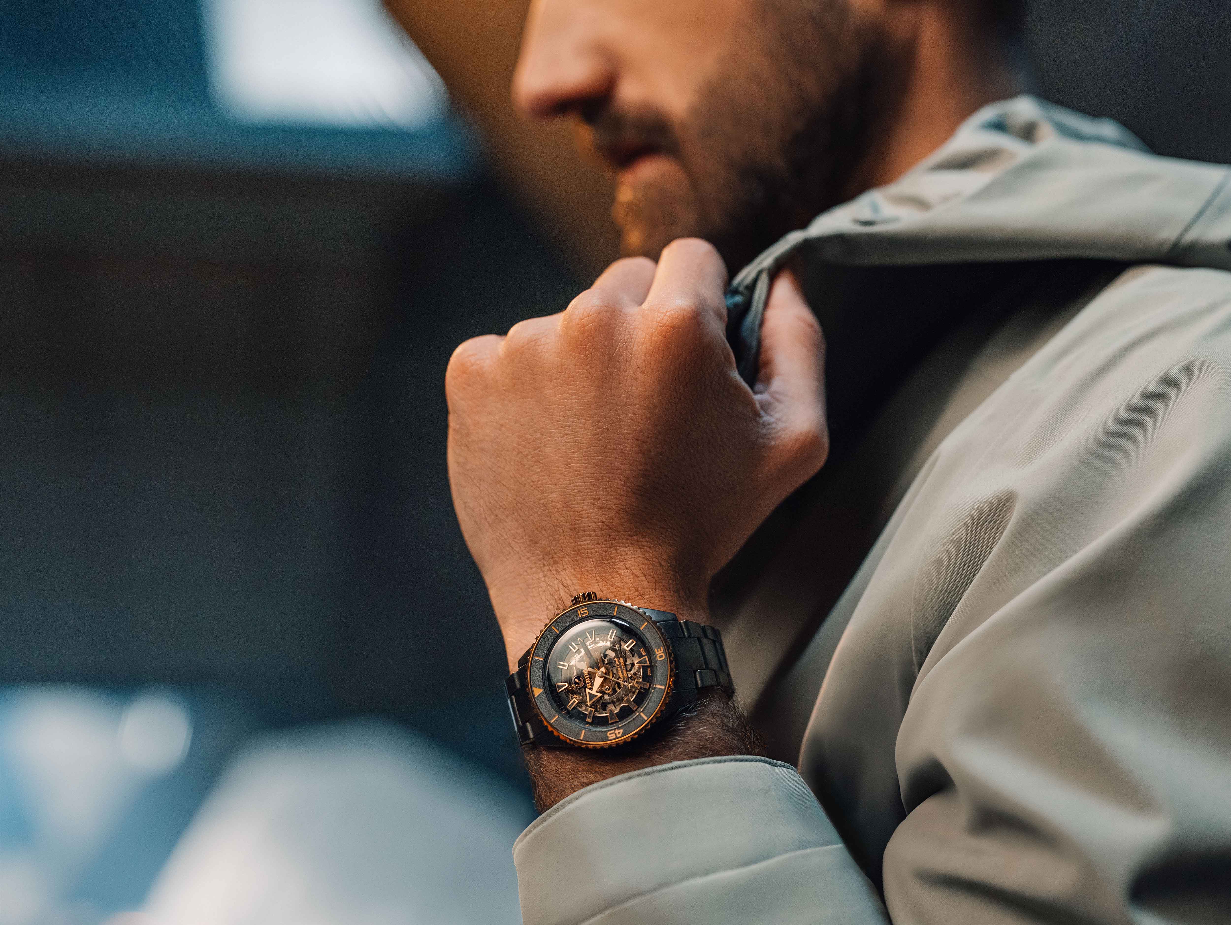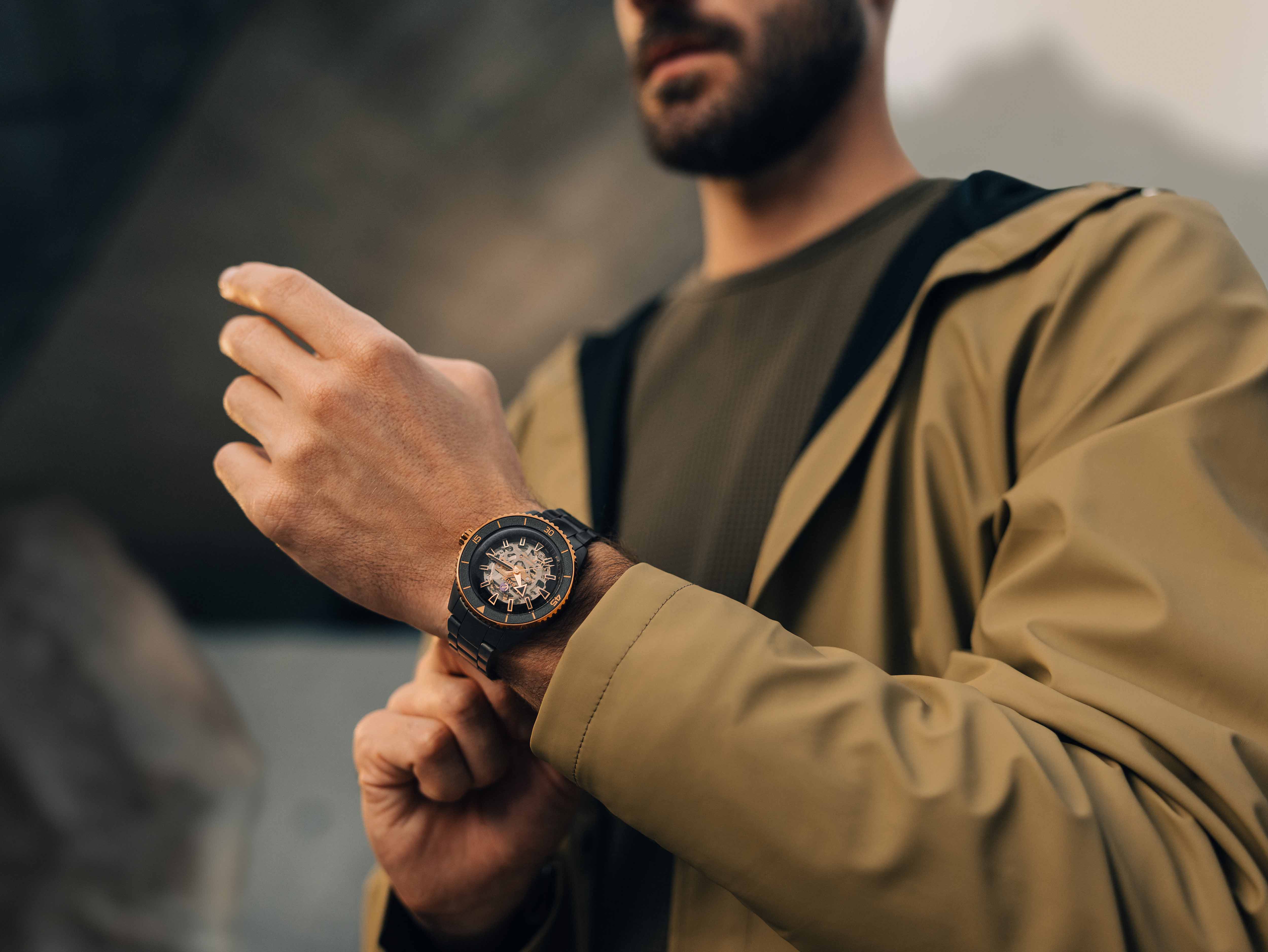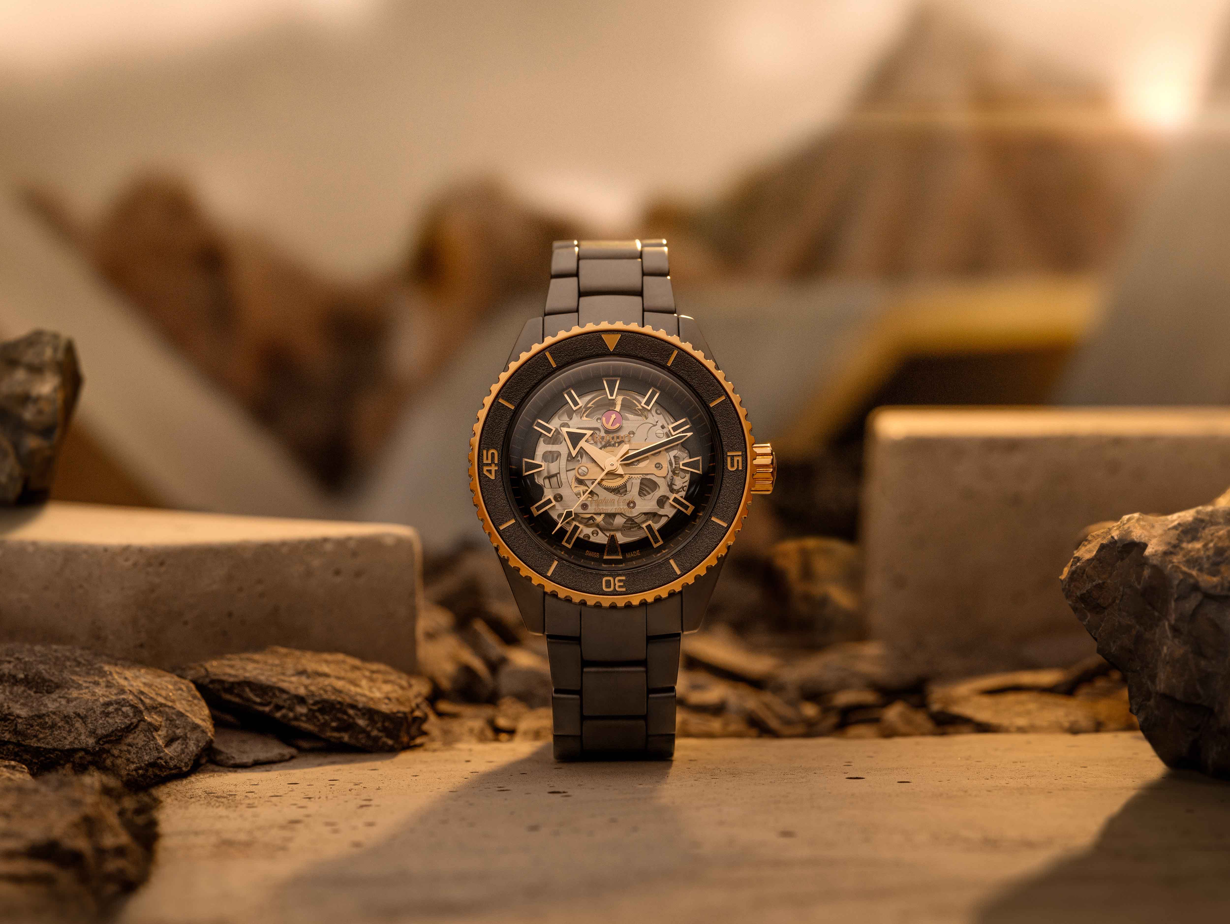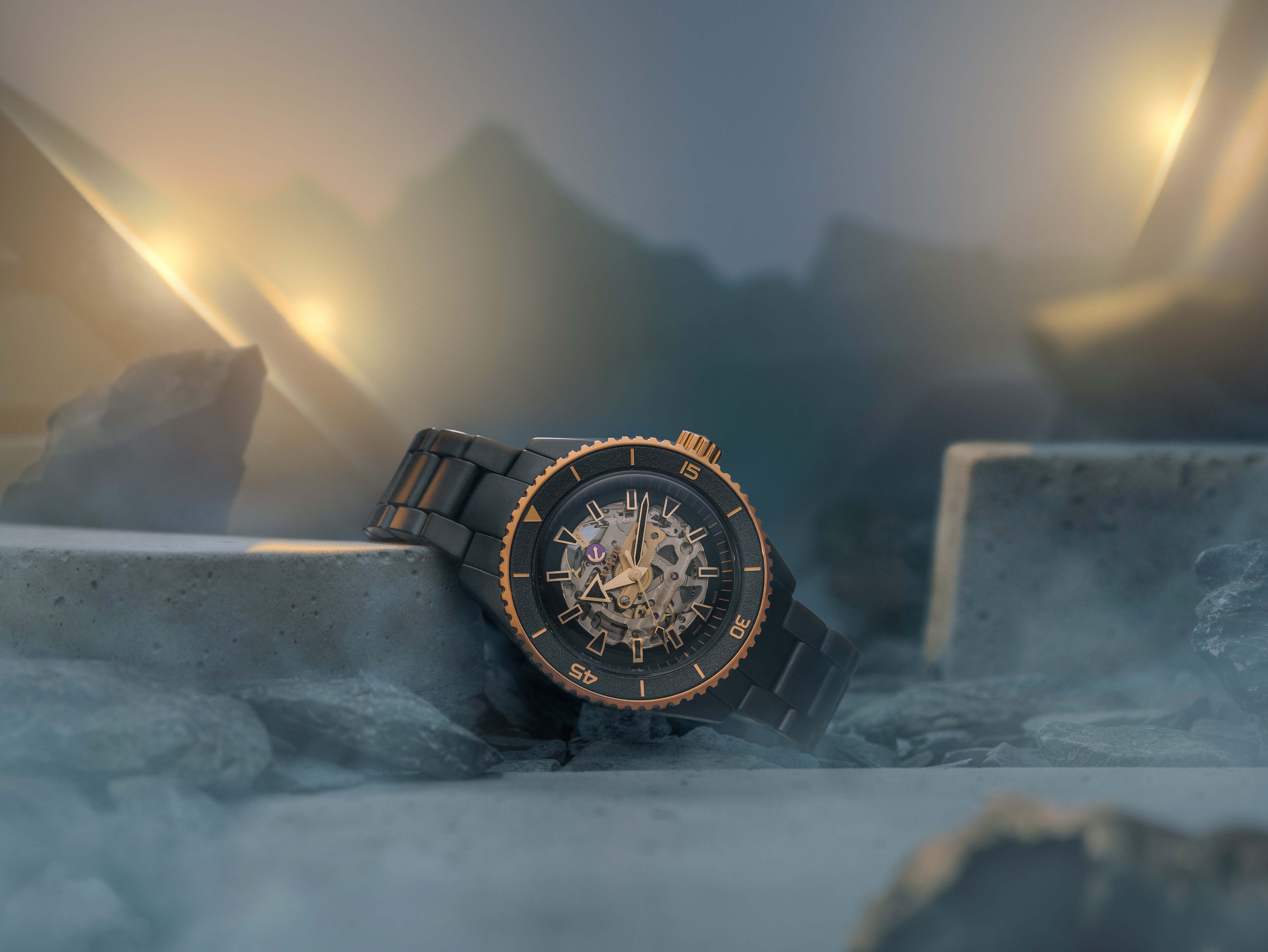 The Captain Cook Skeleton is built from matte black high-tech ceramic, engineered at molecular level and sintered at 1450°C to reach 1250 Vickers in surface hardness. The result is a monobloc case that defies scratches, resists time, and wears like a second skin. This is a material born for extremes. Its thermal stability and hypoallergenic nature make it the ideal companion for long hours on the wrist, under any conditions. It doesn’t age. It doesn’t fade. It remains exactly as it was designed to be — uncompromising in every environment. Framing the architecture, the rose-gold PVD bezel features a laser-structured ceramic insert, treated to resist fingerprints and engraved with lacquered markers. The lines flow seamlessly into the integrated three-link ceramic bracelet, secured by a titanium clasp with ceramic pushers.