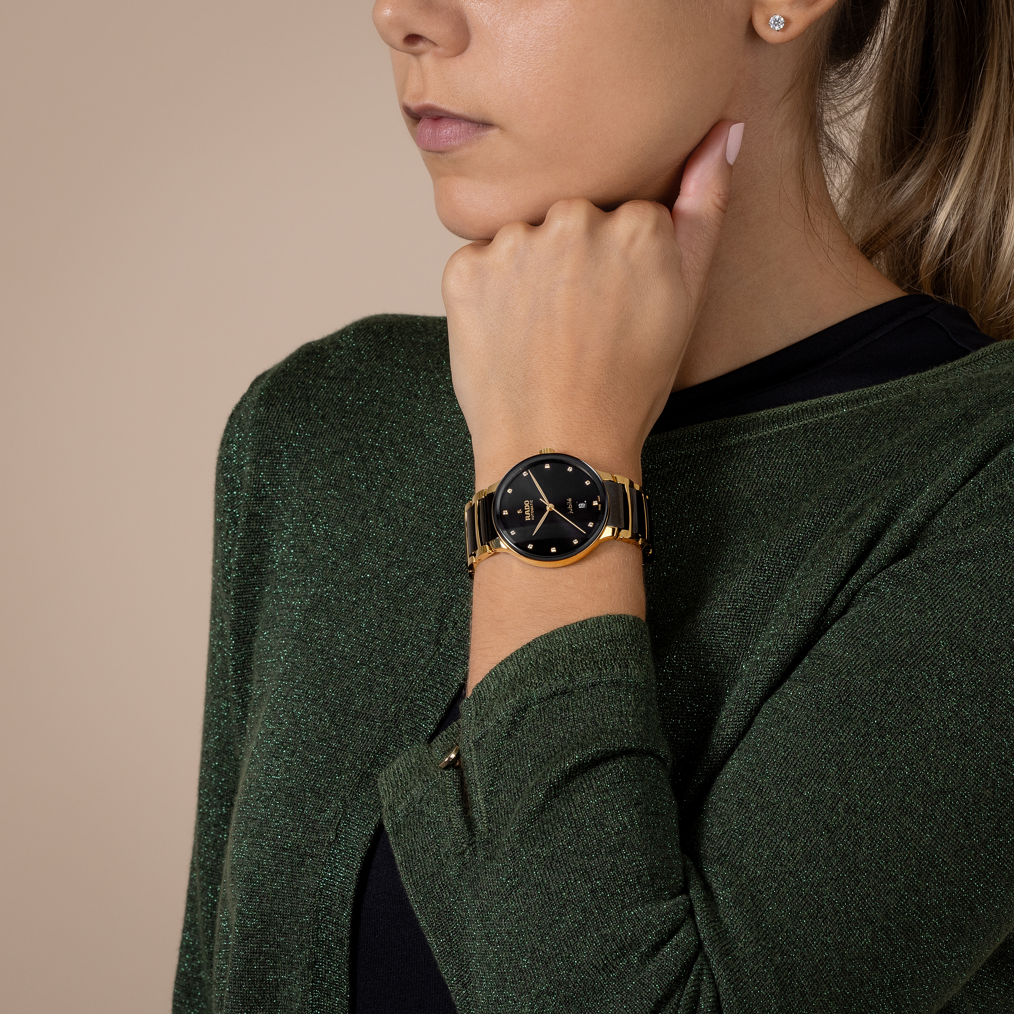 The classic Centrix Automatic Diamonds watch has been reworked not only technically, but also aesthetically. The modified model has a rounded sapphire crystal that extends all the way to the edge, as well as a curved case blending with the curved crystal edge. The adjusted case lugs and the bracelet made of polished yellow gold-coloured stainless steel with black high-tech ceramic middle links complete the overall appearance of this iconic timepiece. The black sunray dial with 12 diamonds, emphasised with the printed “jubilé” logo, matches perfectly with the yellow gold-coloured hands. Inside, the three-hand calibre R763 movement exceeds standard accuracy test requirements from 3 to 5 positions, thanks to its antimagnetic NivachronTM hairspring for increased reliability and accuracy. The watch is water resistant down to 50 m and offers 80 hours of power reserve.