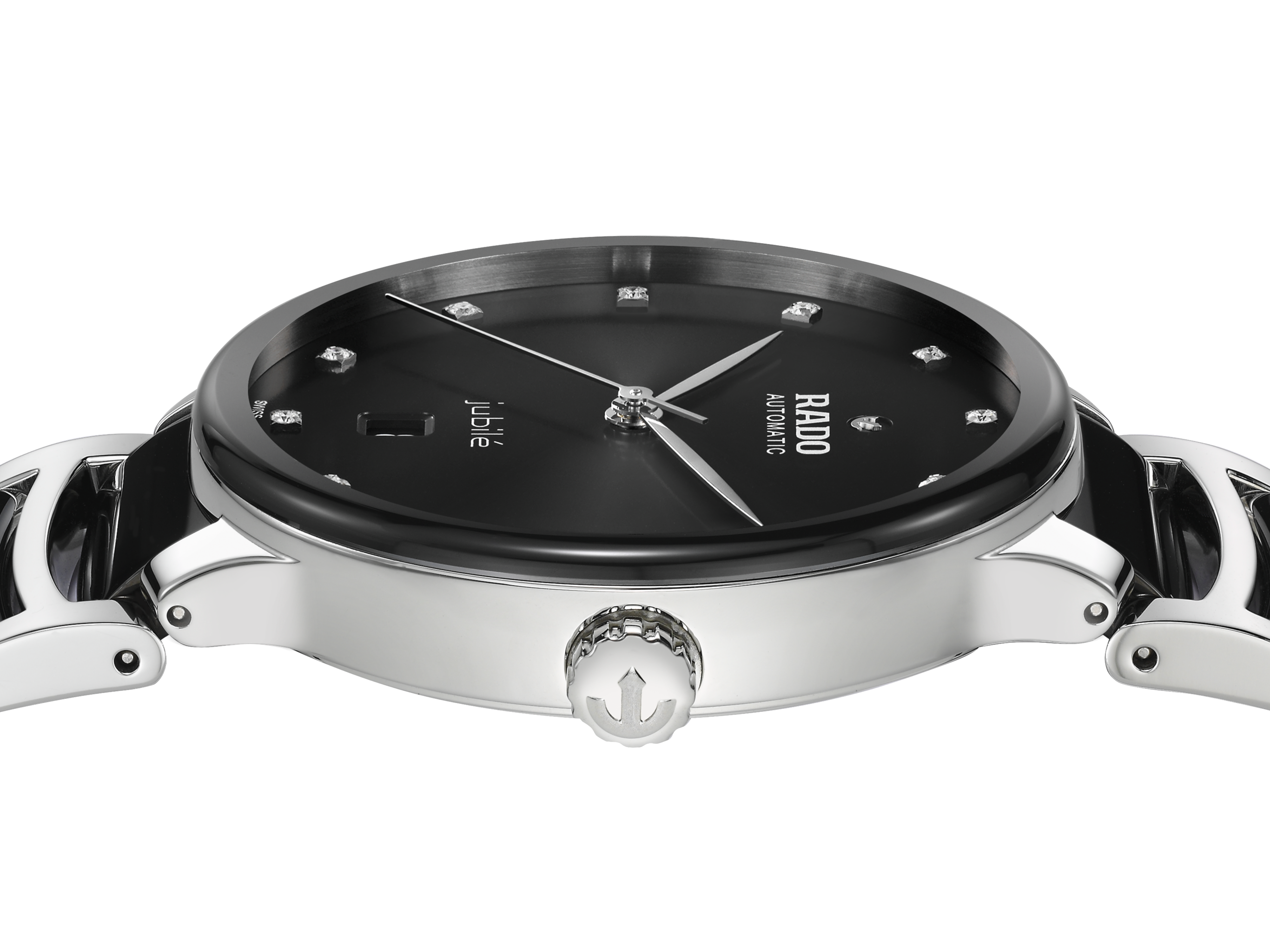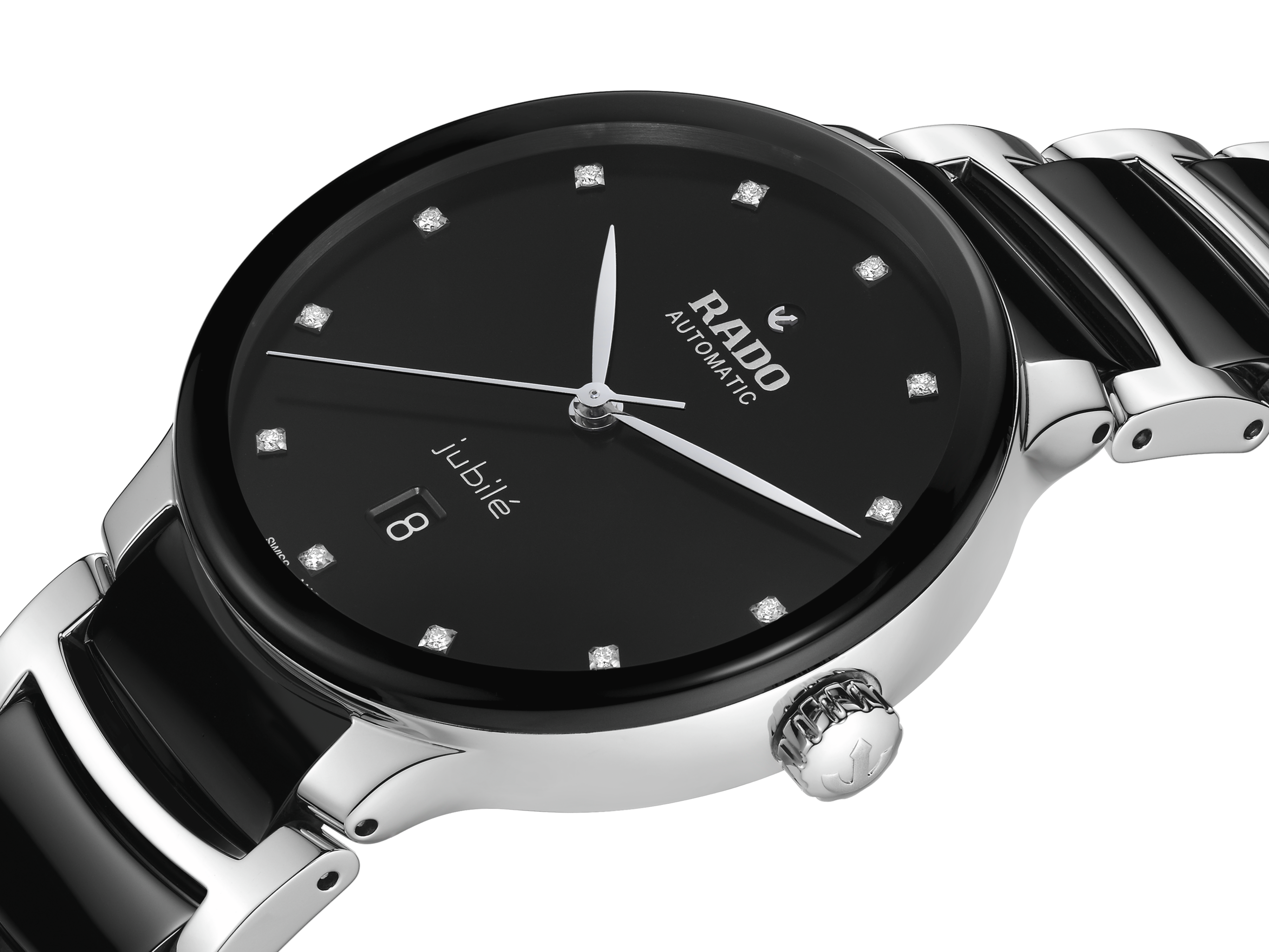 The classic Centrix Automatic Diamonds watch has been reworked not only technically, but also aesthetically. The modified model has a rounded sapphire crystal that extends all the way to the edge, as well as a curved case blending with the curved crystal edge. The adjusted case lugs and the bracelet made of polished stainless steel with black high-tech ceramic middle links complete the overall appearance of this iconic timepiece. The black sunray dial with 12 diamonds, emphasised with the printed “jubilé” logo, matches perfectly with the rhodium-coloured hands. Inside, the three-hand calibre R763 movement exceeds standard accuracy test requirements from 3 to 5 positions, thanks to its antimagnetic Nivachron™ hairspring for increased reliability and accuracy. The watch is water resistant down to 50 m and offers 80 hours of power reserve.