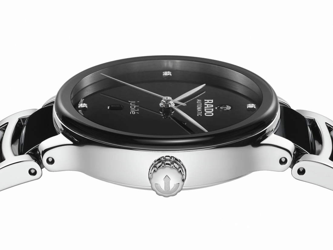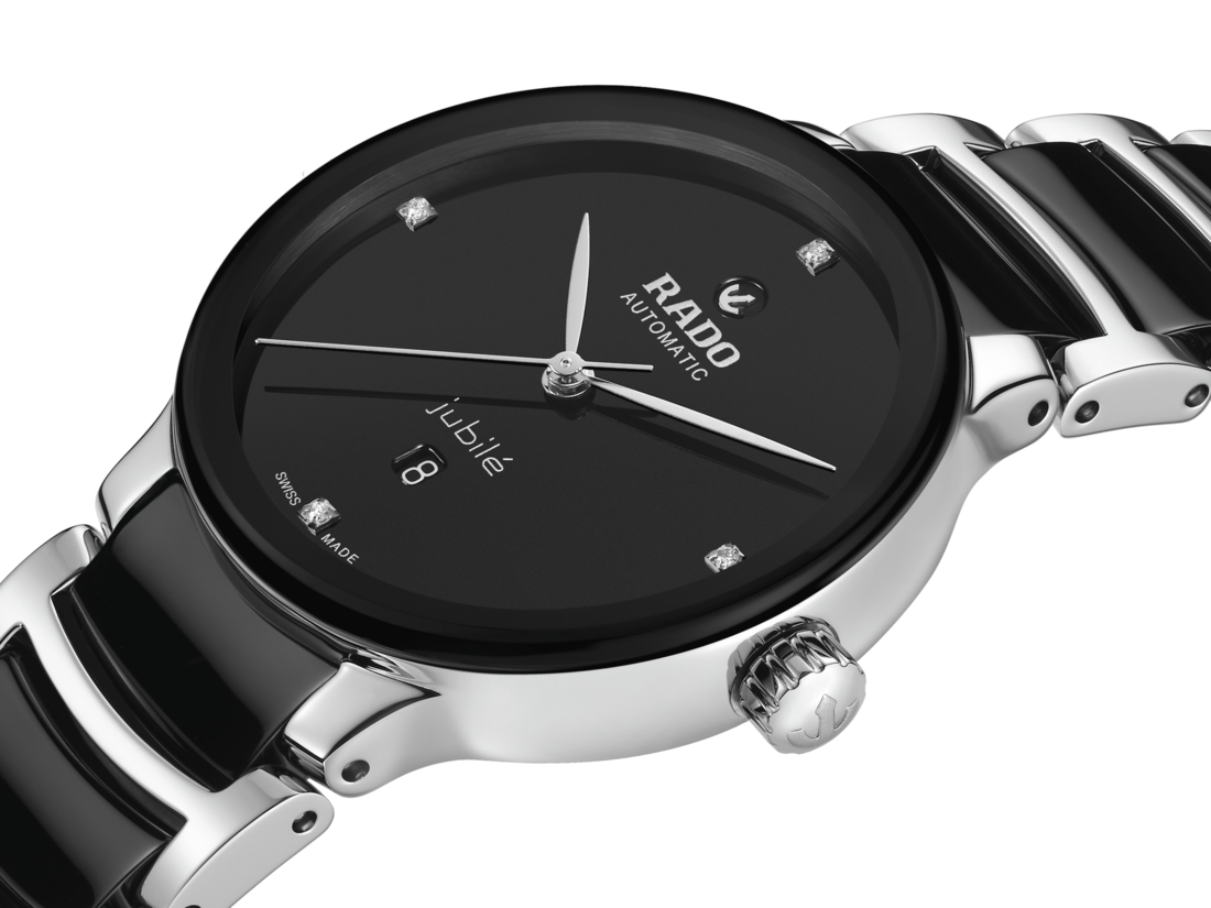 The classic Centrix Automatic Diamonds watch has been reworked not only technically, but also aesthetically. The modified model has a rounded sapphire crystal that extends all the way to the edge, as well as a curved case blending with the curved crystal edge. The adjusted case lugs and the bracelet made of polished stainless steel with black high-tech ceramic middle links complete the overall appearance of this iconic timepiece. The black lacquered dial with 4 diamonds, emphasised with the printed “jubilé” logo, matches perfectly with the rhodium-coloured hands. Inside, the three-hand calibre R582 movement exceeds standard accuracy test requirements from 3 to 5 positions, thanks to its antimagnetic Nivachron™ hairspring for increased reliability and accuracy. The watch is water resistant down to 50 m and offers 48 hours of power reserve.