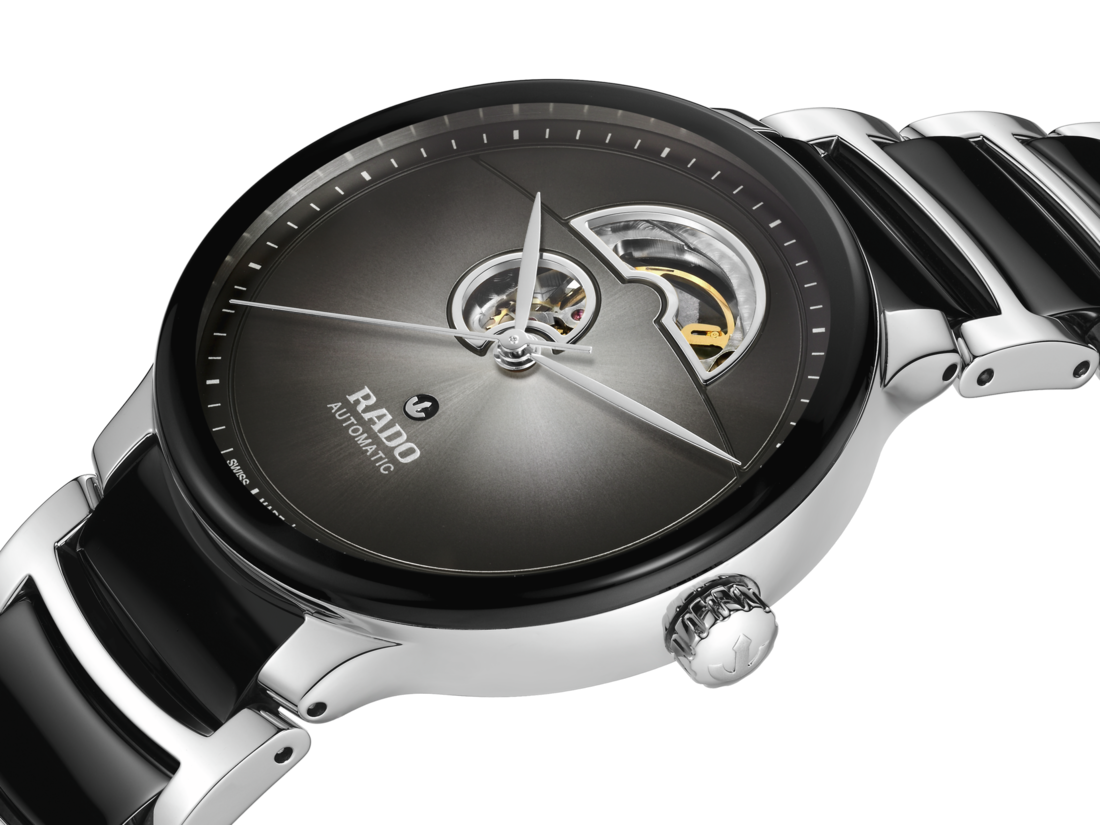 Discover the perfect harmony of innovation and aesthetics with the Rado Centrix Automatic Open Heart. At the heart of this masterpiece beats the Automatic Rado calibre R734 movement, producing impeccable precision and reliability. With an impressive 80-hour power reserve, this watch ensures uninterrupted performance. The antimagnetic Nivachron™ hairspring and adjustment in five positions further enhance its accuracy. Encased in a polished stainless steel case, measuring a refined 39.5 mm, the Centrix Automatic Open Heart showcases meticulous craftsmanship. The polished stainless steel case back, fitted with a sapphire crystal, offers a glimpse into the mesmerizing inner workings of the watch. The dial exhibits a captivating silver to black gradient, adding depth and allure to the watch's design. Complemented by rhodium coloured hands, the dial ensures excellent legibility and a touch of elegance. The bracelet features polished stainless steel and black high-tech ceramic middle links, creating a striking contrast.