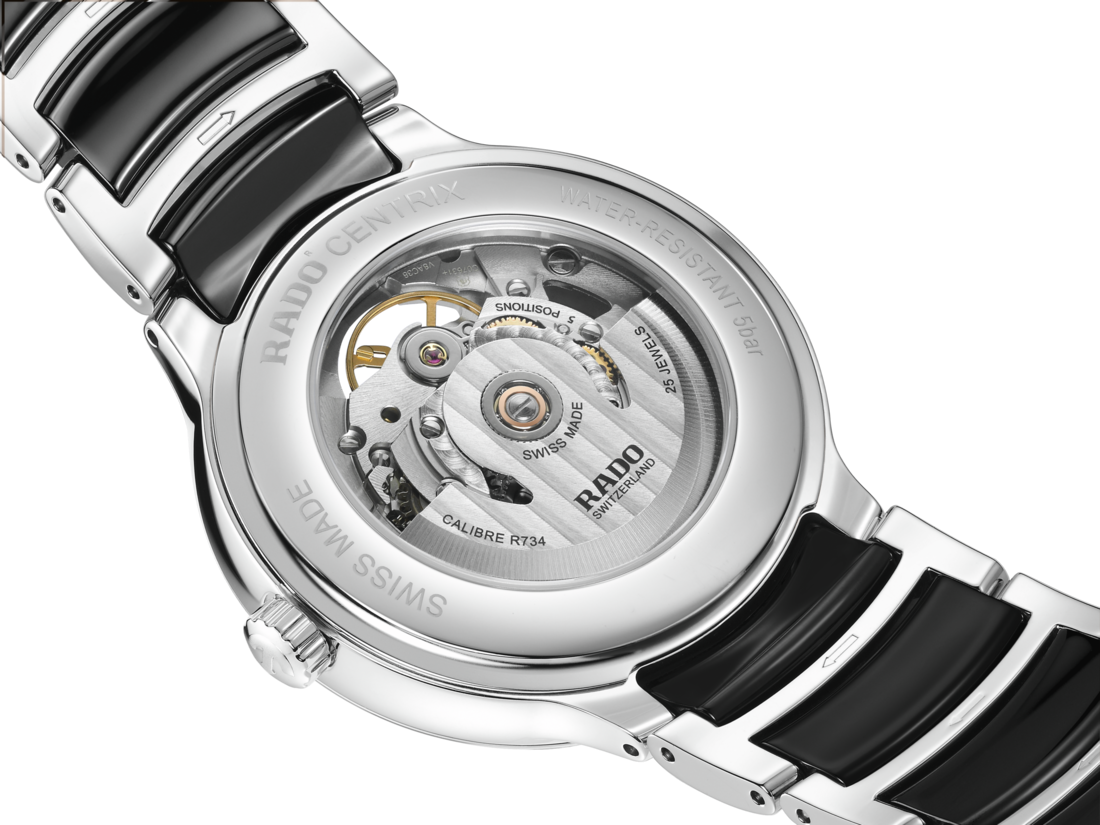 Discover the perfect harmony of innovation and aesthetics with the Rado Centrix Automatic Open Heart. At the heart of this masterpiece beats the Automatic Rado calibre R734 movement, producing impeccable precision and reliability. With an impressive 80-hour power reserve, this watch ensures uninterrupted performance. The antimagnetic Nivachron™ hairspring and adjustment in five positions further enhance its accuracy. Encased in a polished stainless steel case, measuring a refined 39.5 mm, the Centrix Automatic Open Heart showcases meticulous craftsmanship. The polished stainless steel case back, fitted with a sapphire crystal, offers a glimpse into the mesmerizing inner workings of the watch. The dial exhibits a captivating blue to black gradient, adding depth and allure to the watch's design. Complemented by rhodium coloured hands, the dial ensures excellent legibility and a touch of elegance. The bracelet features polished stainless steel and black high-tech ceramic middle links, creating a striking contrast.