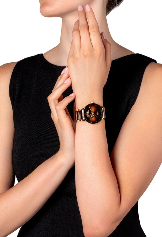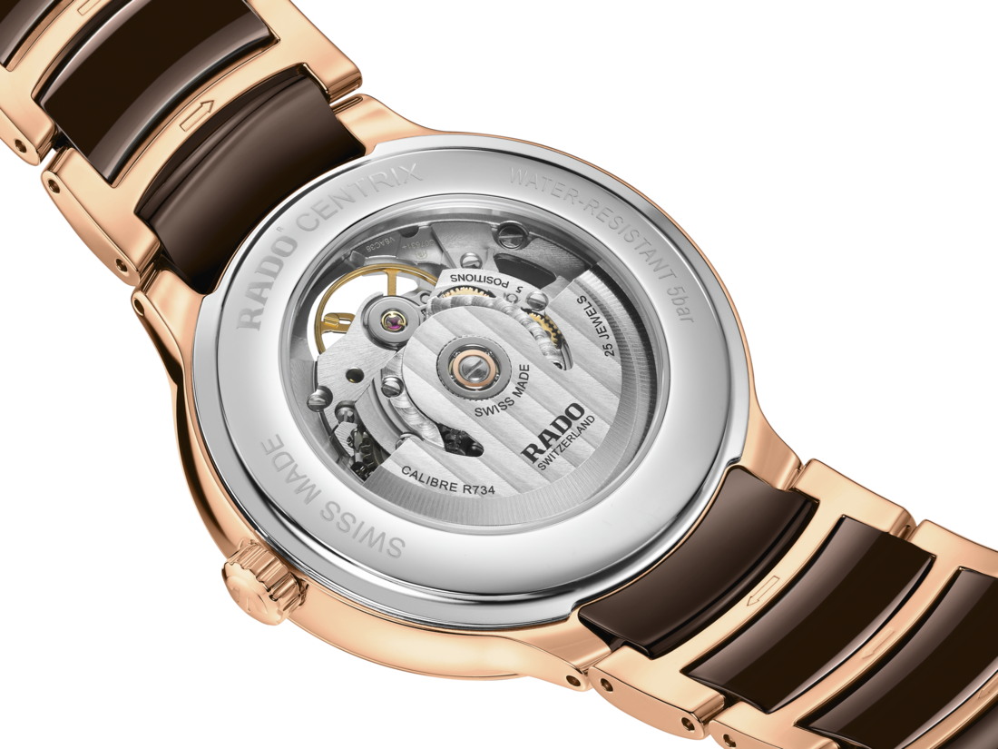 Discover the perfect harmony of innovation and aesthetics with the Rado Centrix Automatic Open Heart. At the heart of this masterpiece beats the Automatic Rado calibre R734 movement, producing impeccable precision and reliability. With an impressive 80-hour power reserve, this watch ensures uninterrupted performance. The antimagnetic Nivachron™ hairspring and adjustment in five positions further enhance its accuracy. Encased in a polished rose gold coloured stainless steel case, measuring a refined 39.5 mm, the Centrix Automatic Open Heart showcases meticulous craftsmanship. The polished stainless steel case back, fitted with a sapphire crystal, offers a glimpse into the mesmerizing inner workings of the watch. The dial exhibits a captivating brown gradient, adding depth and allure to the watch's design. Complemented by rose gold coloured hands, the dial ensures excellent legibility and a touch of elegance. The bracelet features polished rose gold coloured stainless steel and brown high-tech ceramic middle links, creating a striking contrast.