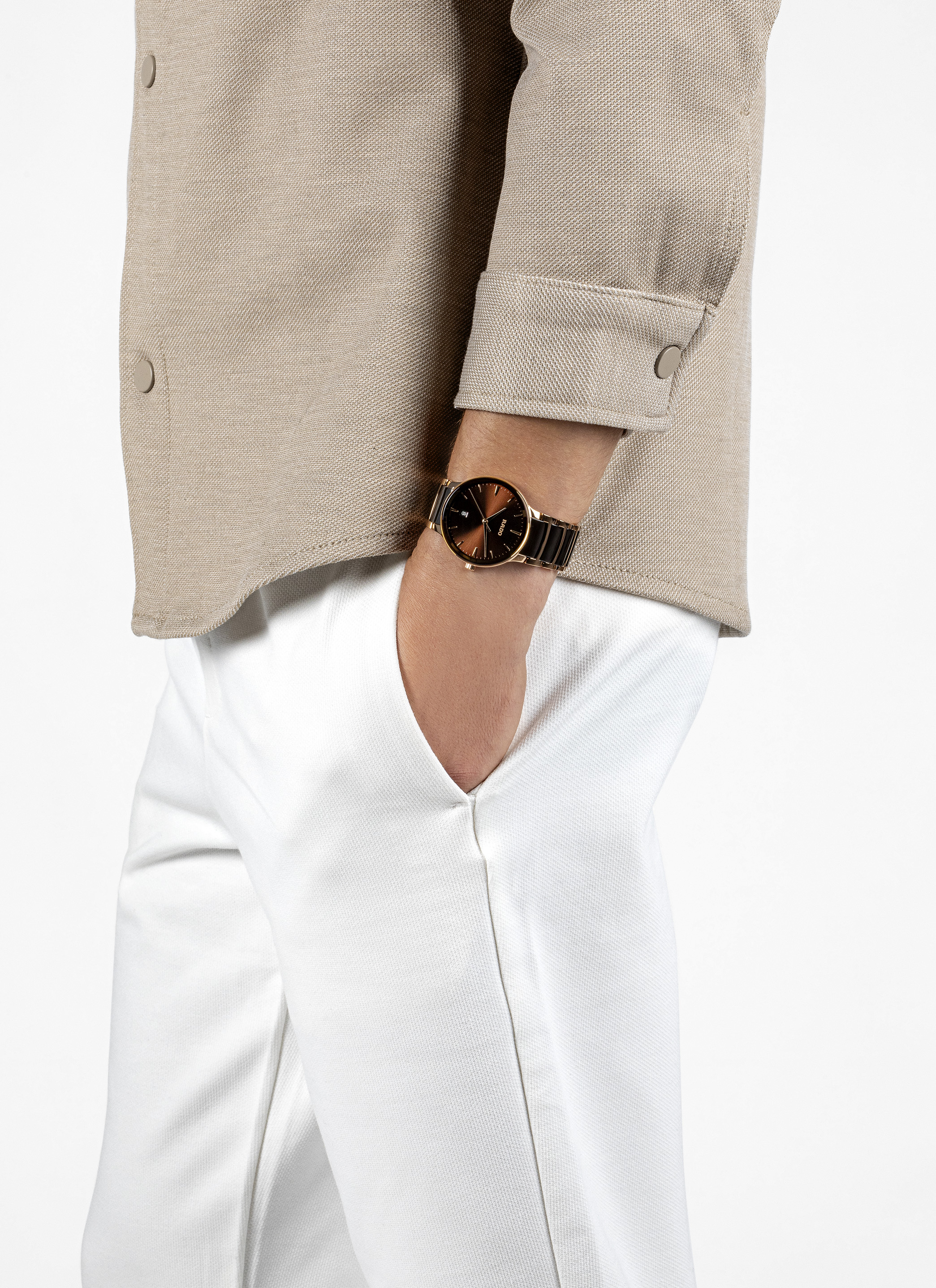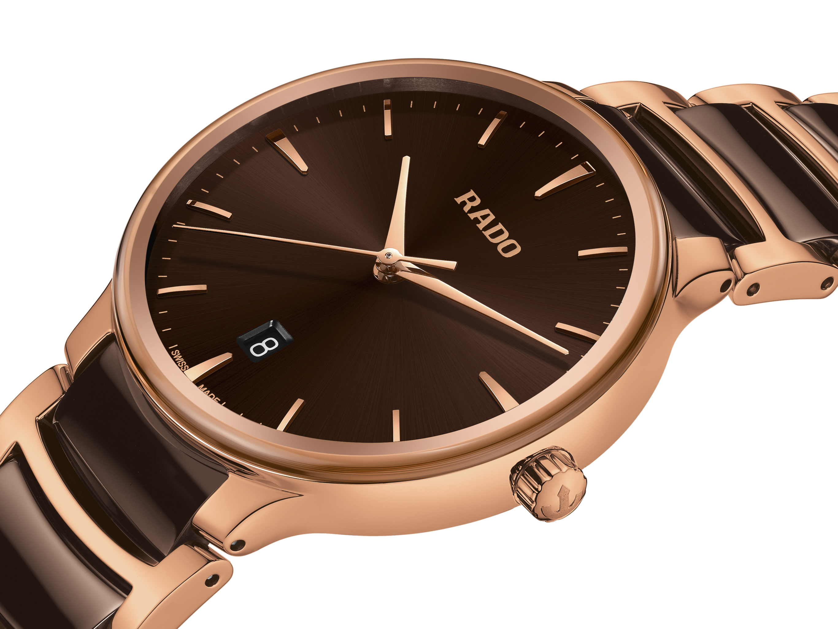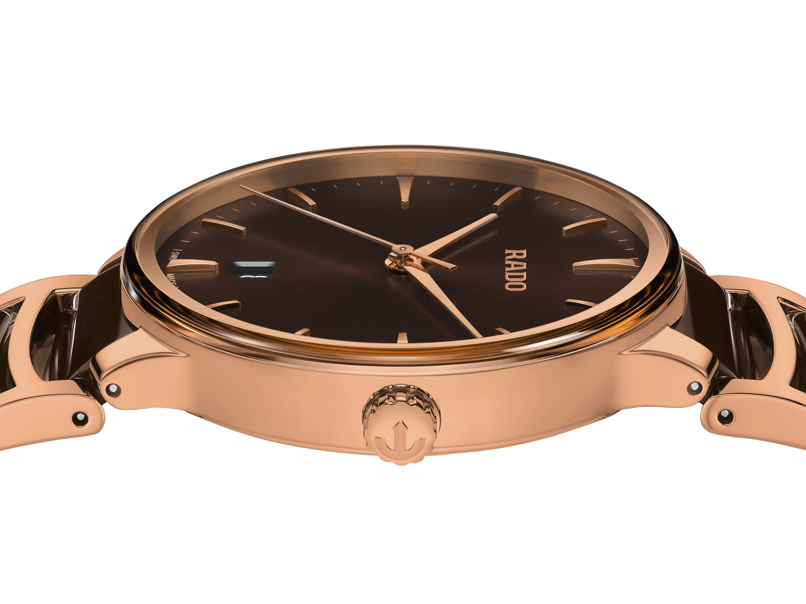 The classic Centrix Quartz has been reworked not only technically, but also aesthetically. The modified model has a rounded sapphire crystal that extends all the way to the edge and a curved case blending with the curved crystal edge. The overall appearance of this iconic timepiece is completed with adjusted case lugs and a bracelet made of polished rose gold-coloured PVD-coated stainless steel with brown high-tech ceramic middle links. The brown sunray dial with rose gold-coloured applied indexes matches perfectly with the rose gold-coloured hands. Thanks to the PreciDrive and HeavyDrive features in the calibre R073 quartz movement, the watch has greater accuracy and resistance to shocks. The watch is water-resistant down to 50 m.