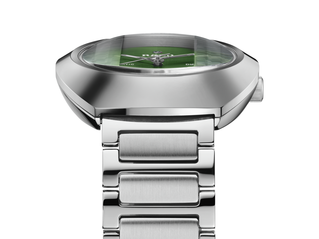 The unique DiaStar Original has a diameter of 38 mm and is water resistant down to 100 m. Framed by an ultra-shiny Ceramos™ coiffe with polished angles and detailing set over a matching, monochrome stainless-steel case, this beautiful watch is rounded off with a parallel-stripe-faceted sapphire crystal. Specifications include a green brushed dial with two directions, rhodium coloured hands with white Super-LumiNova®, and a day date display matching the colour of the dial. Inside, the Rado R764 automatic movement with antimagnetic Nivachron™ offers 80 hours of power reserve. The bracelet is made of polished and brushed stainless steel.