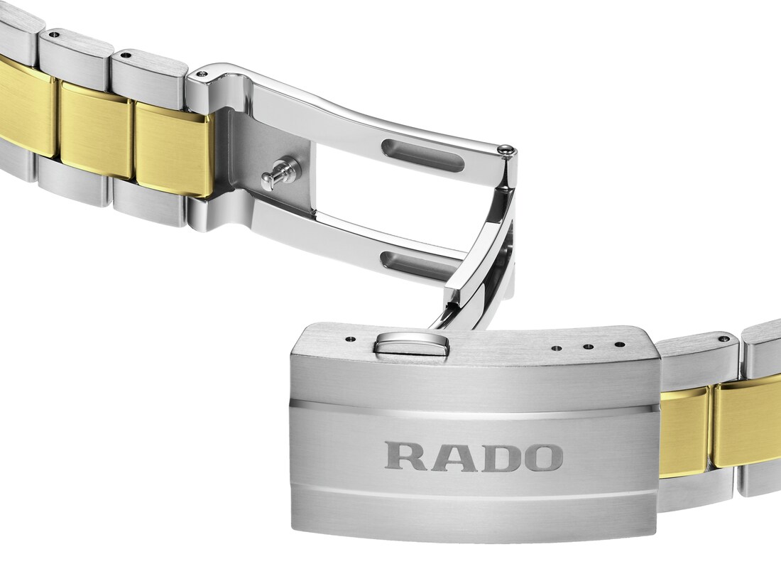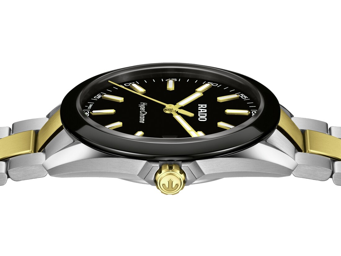 The HyperChrome Quartz is a contemporary expression of precision and material mastery, combining advanced watchmaking technology with a bold and enduring design. The case, sculpted from polished and brushed stainless steel, is encircled by a polished black high tech ceramic bezel—an elemental combination of strength and refinement. Topping this resilient construction is a curved sapphire crystal with anti-reflective coating on the inner side, offering exceptional scratch resistance and crystal-clear legibility. With water resistance to 15 bar (150 metres), every element of the architecture is designed for lasting precision, durability, and confidence in any setting. At the heart of the watch, the Rado calibre R292 ensures exceptional accuracy and reliability. This 3-jewel quartz movement combines PreciDrive and HeavyDrive technologies, enabling precise regulation of each impulse and maintaining a deviation of no more than ±10 seconds per year. A discreet date window at 3 o’clock integrates seamlessly into the dial’s balanced design. The black lacquered dial offers a refined contrast to the yellow gold-coloured hands and indices, all treated with white Super-LumiNova® for optimal legibility in low light. At night, the twelve o’clock index and the minute hand emit a green glow, while the remaining indices and the hour hand radiate blue, ensuring quick, intuitive time reading in any lighting condition. Completing the case is a three-row stainless steel bracelet, featuring brushed outer links and yellow gold-coloured PVD coated middle links accented with polished bevels, creating a refined interplay of textures. It is secured by a triple-fold clasp with a three-position quick adjustment system, ensuring a precise and comfortable fit at all times.
