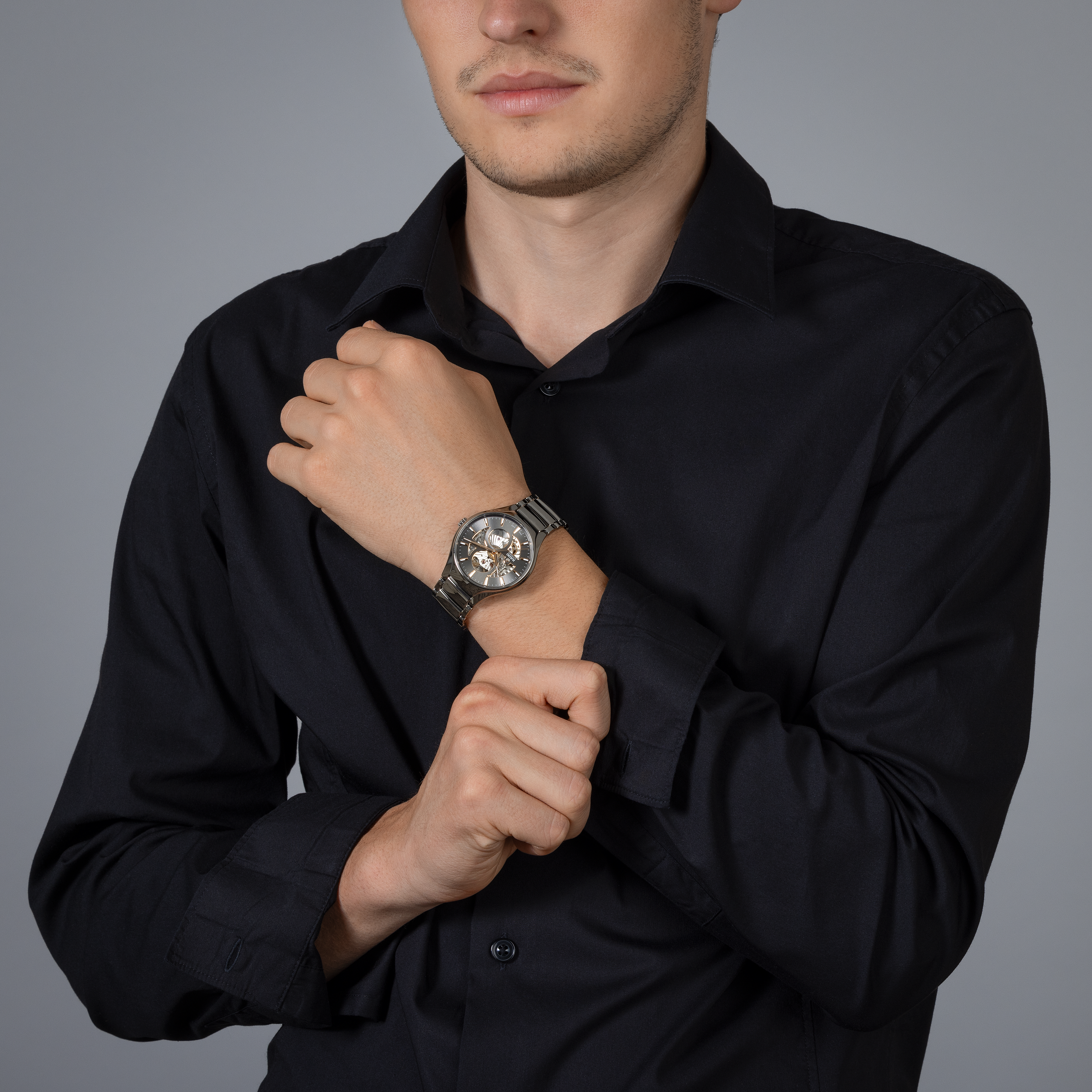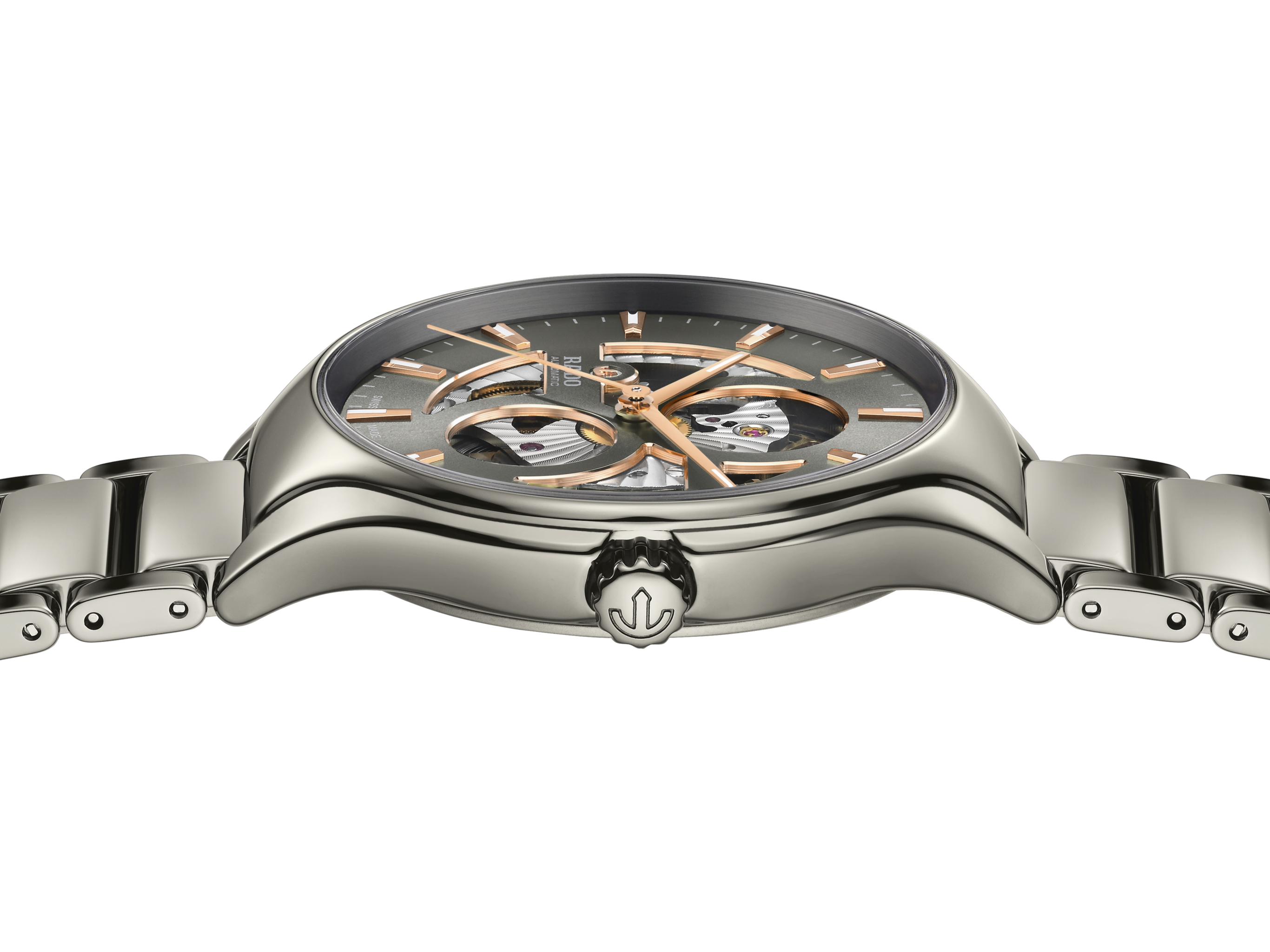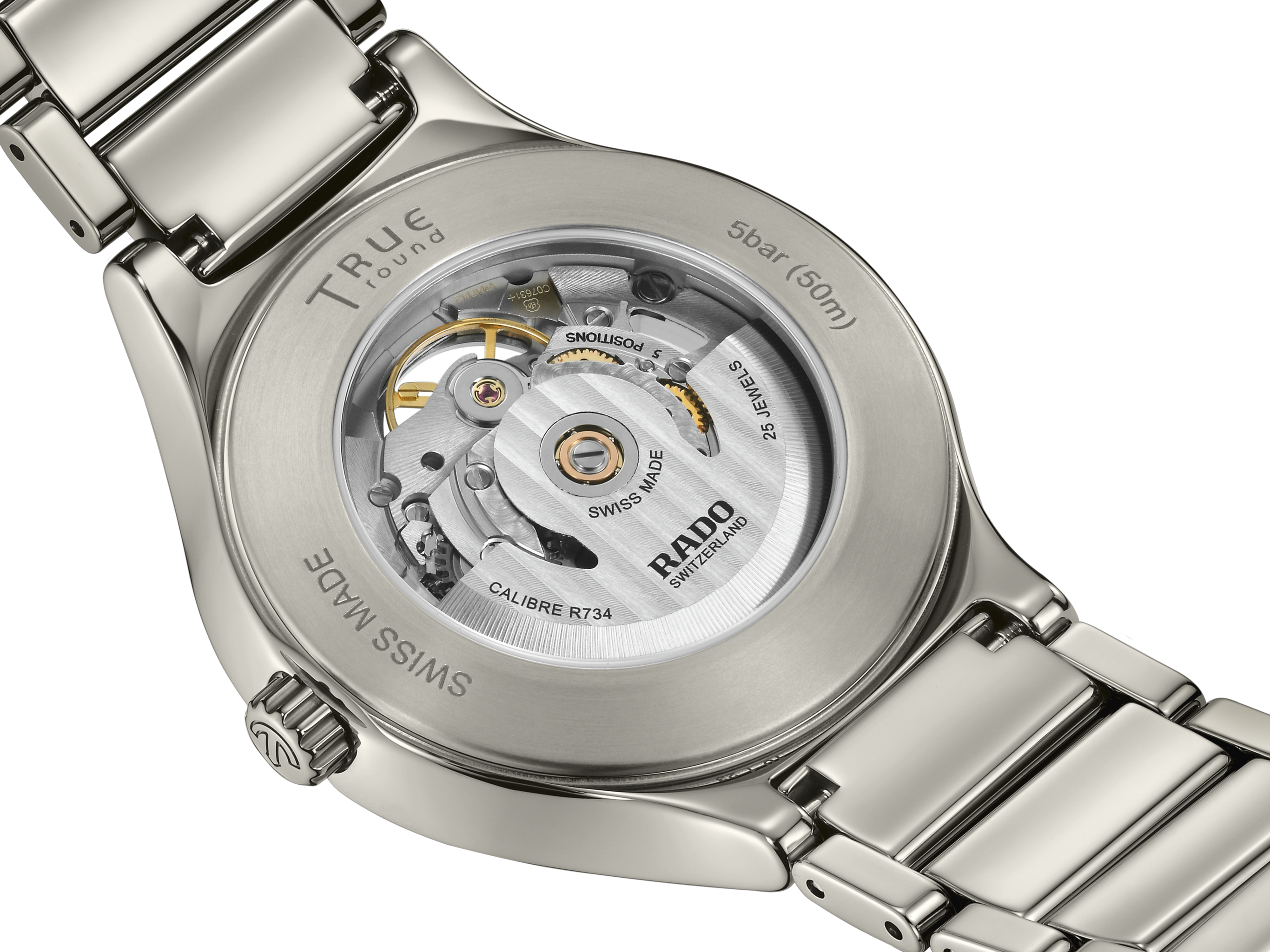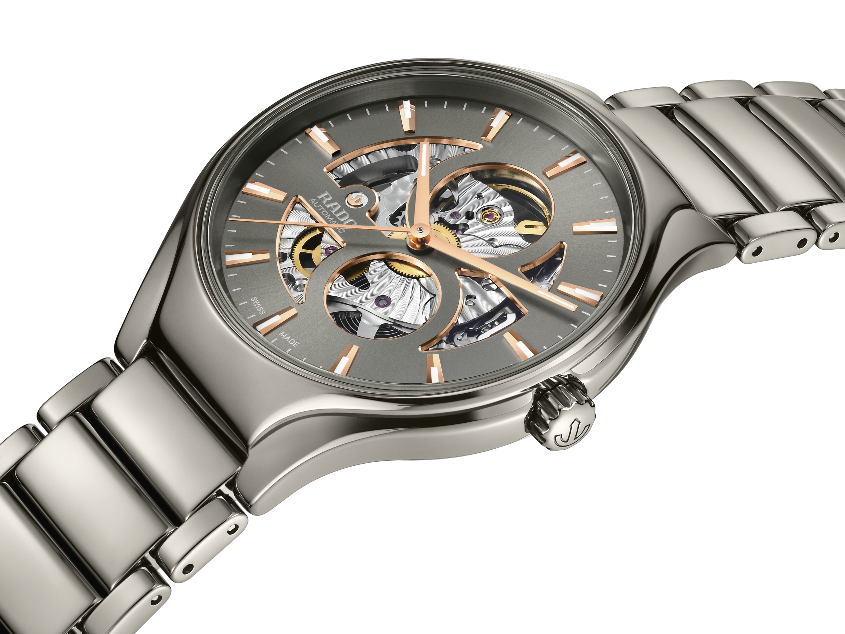 Experience the perfect blend of design excellence and material mastery with the Rado True Round Open Heart. This remarkable timepiece showcases a captivating open heart design, allowing you to admire the intricate movements of the automatic Rado caliber R734, a pure expression of the art of watchmaking. Fitted with an antimagnetic Nivachron™ hairspring, it delivers a power reserve of 80 hours. It has a polished plasma high-tech ceramic monobloc case and crown and a titanium case back whose sapphire crystal reveals an eye-catching view of the movement. It features a gray sunray dial with rose gold-colored bevels and a gray printed minute track. Fittingly, this study in gray is delivered on a polished plasma high-tech ceramic bracelet with a titanium 3-fold clasp. The watch is water-resistant down to 50 m. The Rado True Round Open Heart is drawn to watches that are relentlessly contemporary, but which also have a timelessness and style that make them true keepsakes.