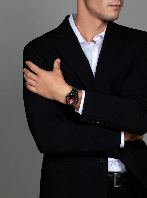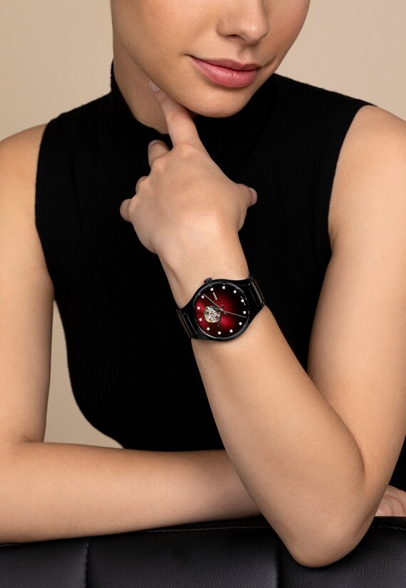 The True Secret Automatic has a particularly sensual effect, giving up its secret through a window in the deep red dial and permitting a glance at the balance spring, the oscillating heart of the mechanical movement. Twelve diamonds replace the numerals and signal pure luxury – a genuine declaration of love in red.