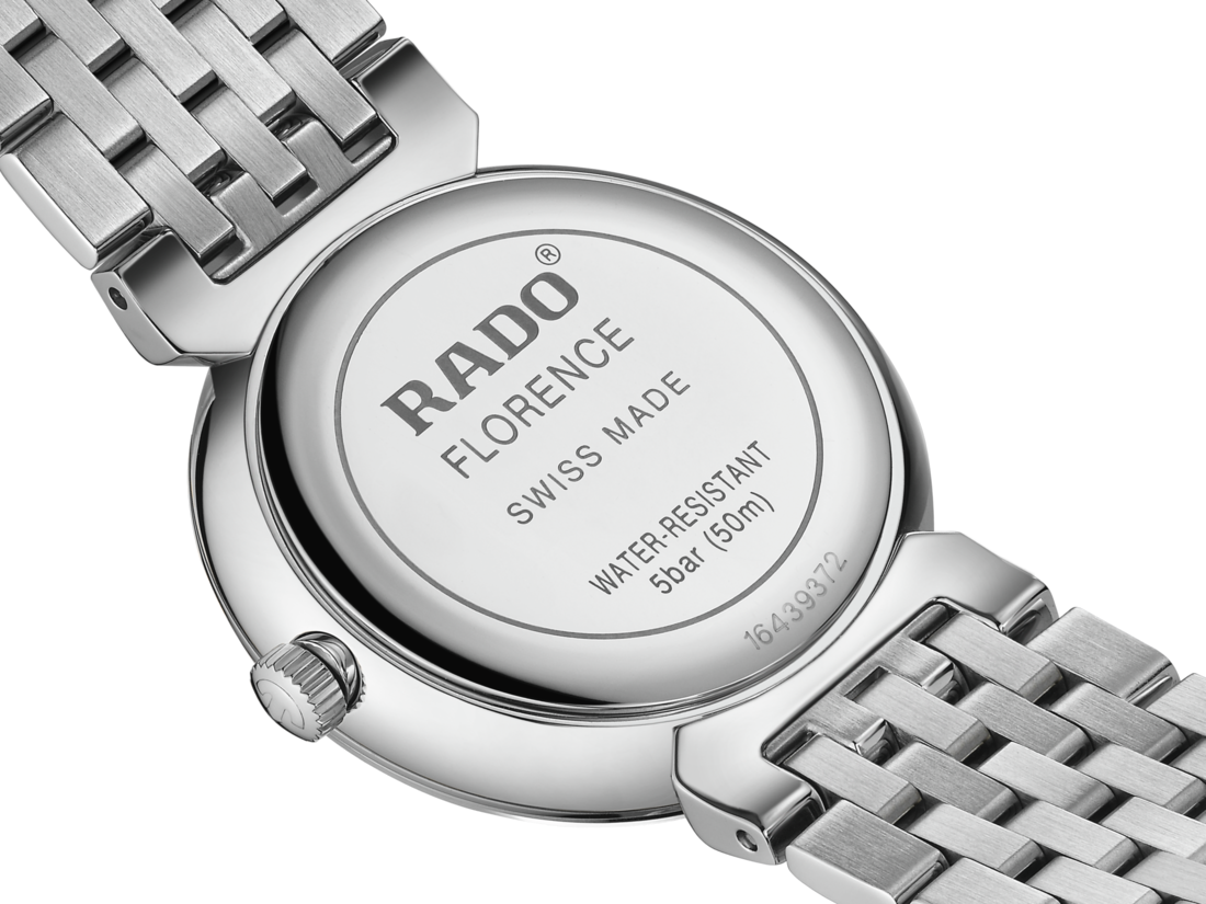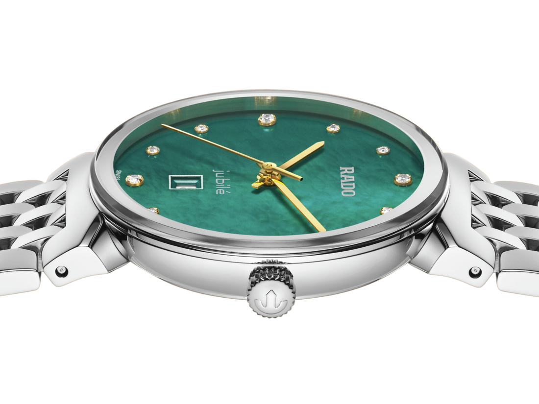 Le design harmonieux de la collection Florence de Rado rappelle les tours et les dômes caractéristiques de la ville dont la collection tire son nom. Cette montre animée par un mouvement à quartz Rado calibre R079 à 3 aiguilles est encore plus précise et résistante aux chocs. Le modèle 30 mm présente un verre saphir bombé et biseauté bord-à-bord. Le boîtier, la couronne, la lunette et le fond de boîtier sont en acier inoxydable poli. Le bracelet également en acier inoxydable poli complète l’apparence globale de ce garde-temps classique. Le cadran en nacre vert incrusté de 12 diamants et arborant le logo « jubilé » imprimé couleur argent se marie à la perfection avec les aiguilles couleur or jaune. La montre est résistante jusqu’à 50 m et également disponible en taille L, ce qui en fait une montre couple idéale.