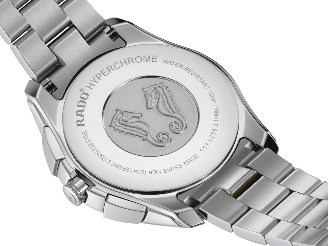 Ce modèle HyperChrome Chronograph de 45 mm doté d’un mouvement à quartz Rado R312 est composé d’un cadran vert parfaitement assorti au bracelet en acier inoxydable à 3 rangées avec maillons intermédiaires brossés jaune. Les aiguilles et les index couleur jaune avec Super-LumiNova® blanc assurent une excellente visibilité. Le boîtier est réalisé en acier inoxydable poli et brossé, tandis que la lunette avec tachymètre gravé est en céramique haute technologie verte polie. L’HyperChrome Chronograph est étanche jusqu’à 100 m.