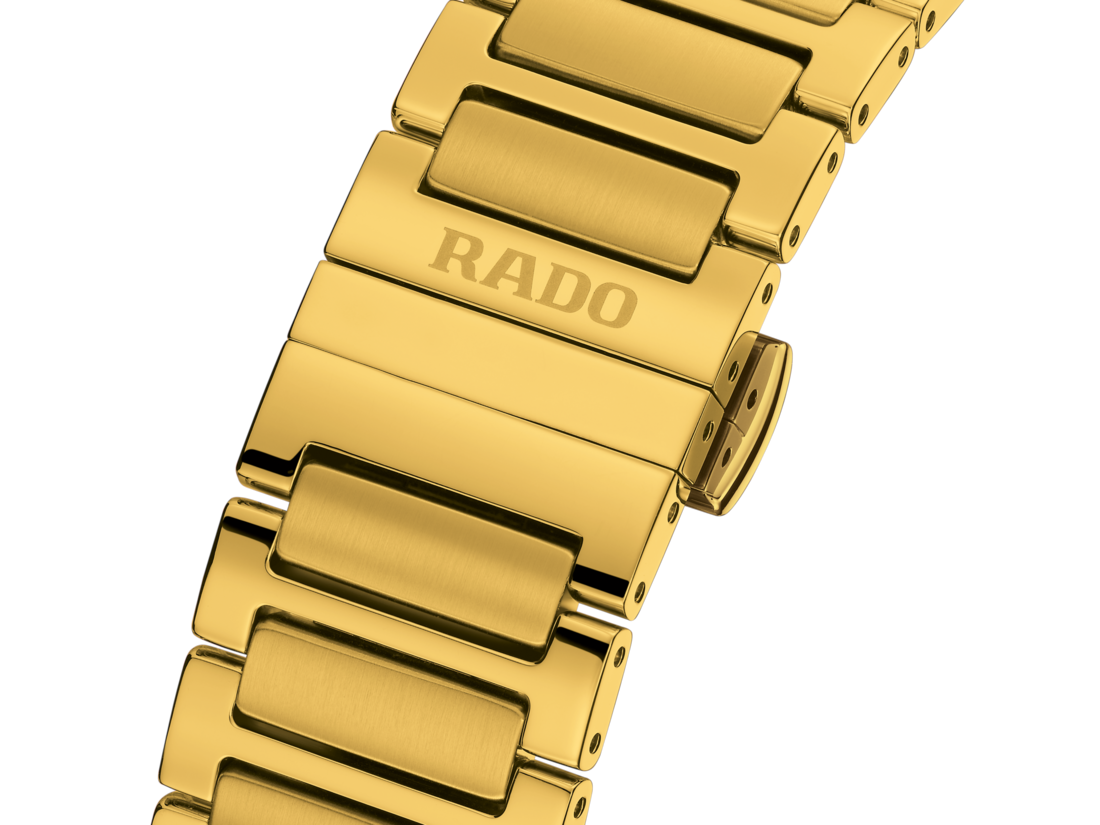 La DiaStar Original affiche un diamètre de 38 mm et une étanchéité jusqu’à 100 m. Surmontée d’une coiffe en Ceramos™ couleur or jaune ultra-brillant avec des angles polis et des détails parsemés sur un boîtier en acier inoxydable avec traitement PVD couleur or jaune assorti, cette montre sublime est complétée par un verre saphir facetté vertical. Les caractéristiques comprennent des aiguilles couleur jaune avec Super-LumiNova® blanc, un affichage blanc du jour et un affichage noir de la date. Le cadran est orné de onze zircons cubiques clairs, sur un motif harmonieux de couleur jaune avec un décor en poudre de diamant. Le mouvement automatique Rado R764, doté d’un spiral Nivachron™ amagnétique, offre une réserve de marche de 80 heures. Enfin, le bracelet est fabriqué en acier inoxydable brossé et poli avec traitement PVD couleur or jaune.