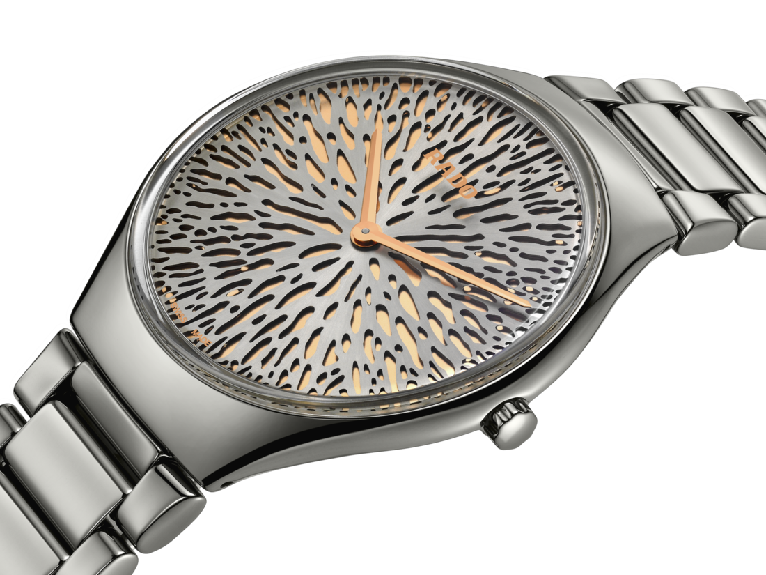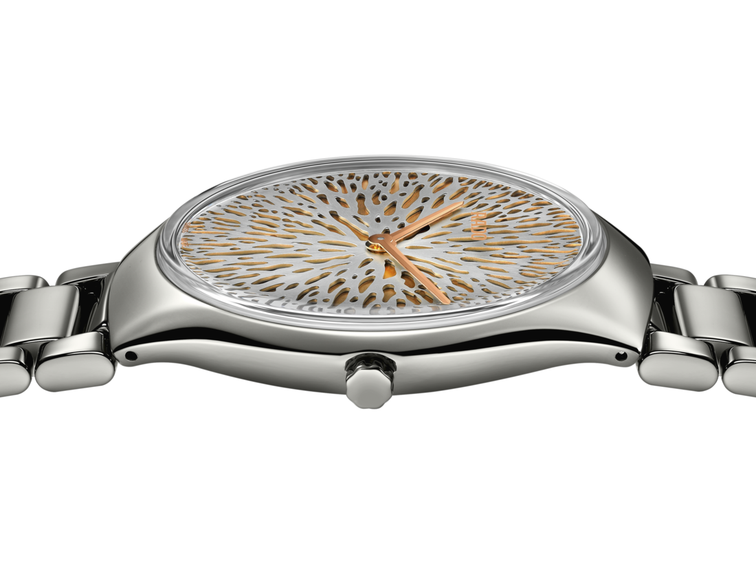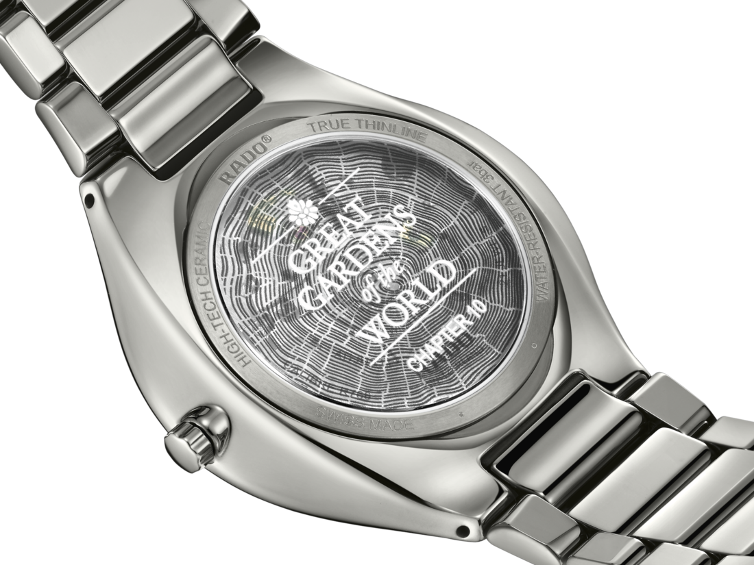 La True Thinline x Great Gardens of the World Chapter 10 (Dragonnier de Socotra) présente un boîtier monobloc en céramique haute technologie plasma dans les tons de gris mystérieux typiques du traitement plasma. Le cadran, une création splendide en deux couches, se compose d’un fond couleur or rose qui transparaît au travers d’une couche supérieure squelettée, finement découpée selon des formes organiques rappelant les majestueuses branches enchevêtrées du dragonnier de Socotra. Les aiguilles des heures/minutes de couleur or rose apportent une touche raffinée au talent de l’horloger. À l’intérieur se trouvent le mouvement Rado R766 premium offrant une généreuse réserve de marche de 72 heures. et un spiral en Nivachron™ amagnétique pour une précision extrêmement fiable. Les chapitres 8, 9 et 10 de cette nouvelle gamme de produits Rado « Great Gardens of the World » sont disponibles individuellement ou comme trio en édition spéciale dans un coffret collector limité à 99 unités.