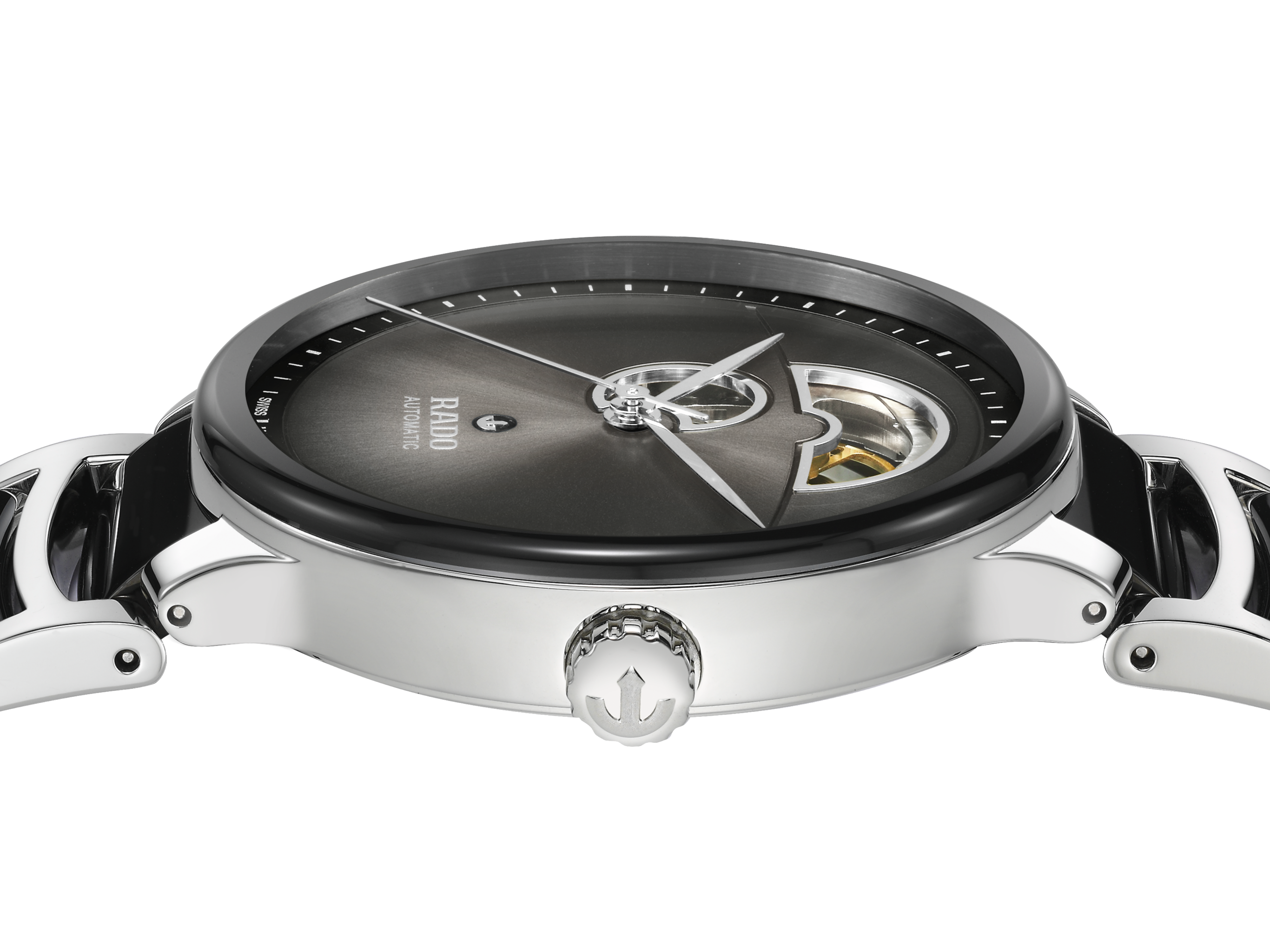 Scopri la perfetta armonia tra innovazione ed estetica con il Rado Centrix Automatic Open Heart. Nel cuore di questo capolavoro, pulsa il movimento automatico Rado calibro R734 che garantisce una precisione e un'affidabilità impeccabili. Provvisto di un’eccezionale riserva di carica di 80 ore, questo segnatempo garantisce un funzionamento duraturo. La spirale antimagnetica Nivachron™ e la regolazione in cinque posizioni ne migliorano ulteriormente la precisione. Dotato di cassa in acciaio lucido dall’elegante diametro di 39,5 mm, il Centrix Automatic Open Heart è il frutto di un’accurata lavorazione artigianale. Il fondello in acciaio lucido con oblò in cristallo zaffiro offre un affascinante colpo d’occhio sul meccanismo all’interno dell'orologio. Il quadrante è caratterizzato da una sfumatura argentea tendente al nero che aggiunge profondità e fascino al design del segnatempo. Arricchito da sfere color rodio, il quadrante garantisce un'ottima leggibilità e un tocco di eleganza. Il bracciale in acciaio lucido dispone di maglie centrali in ceramica high-tech nera che creano un sorprendente contrasto.