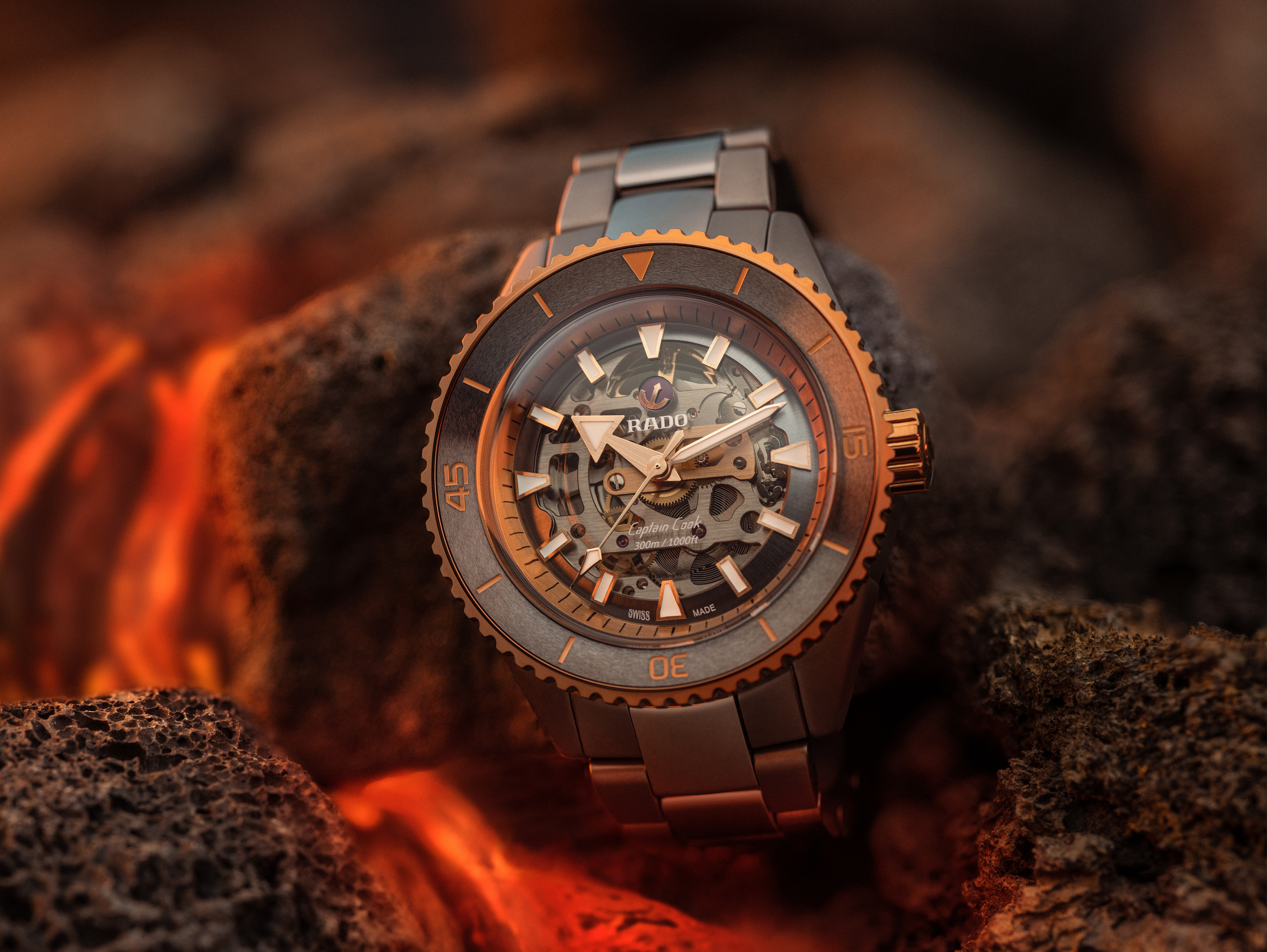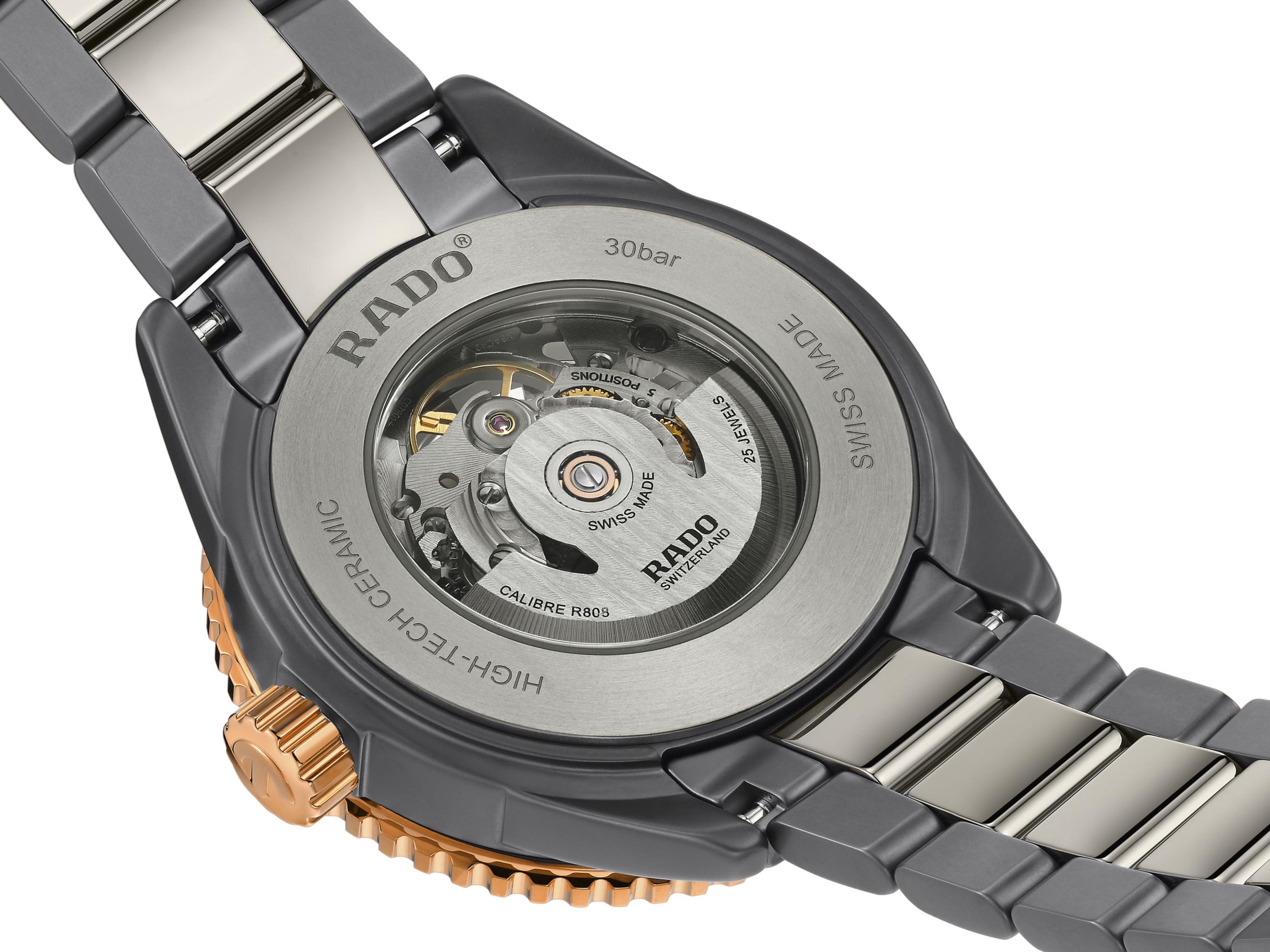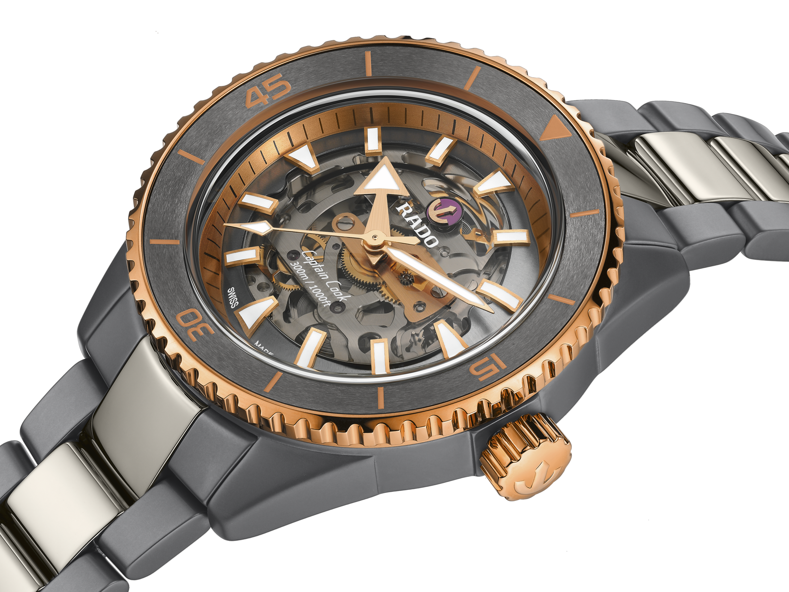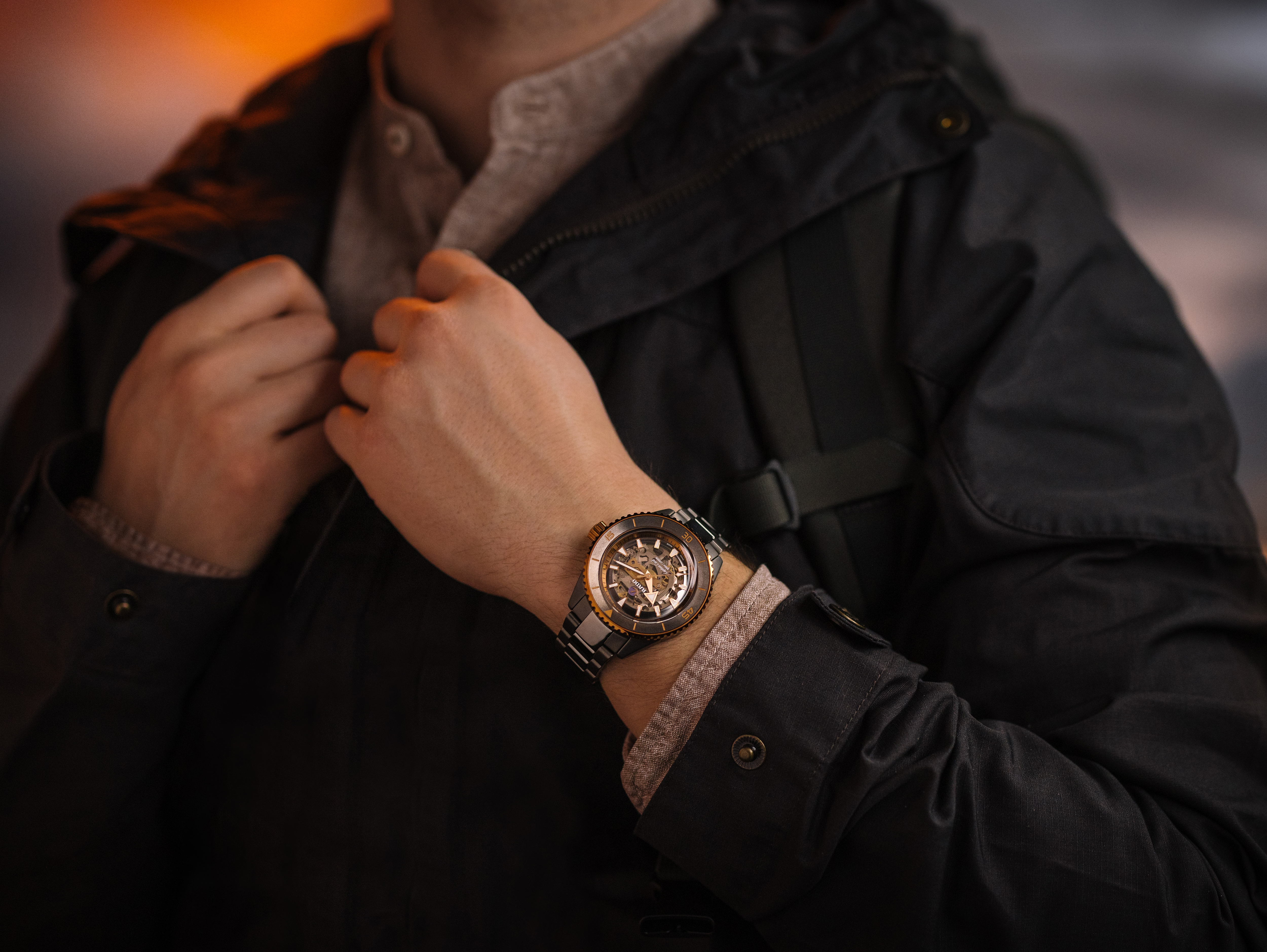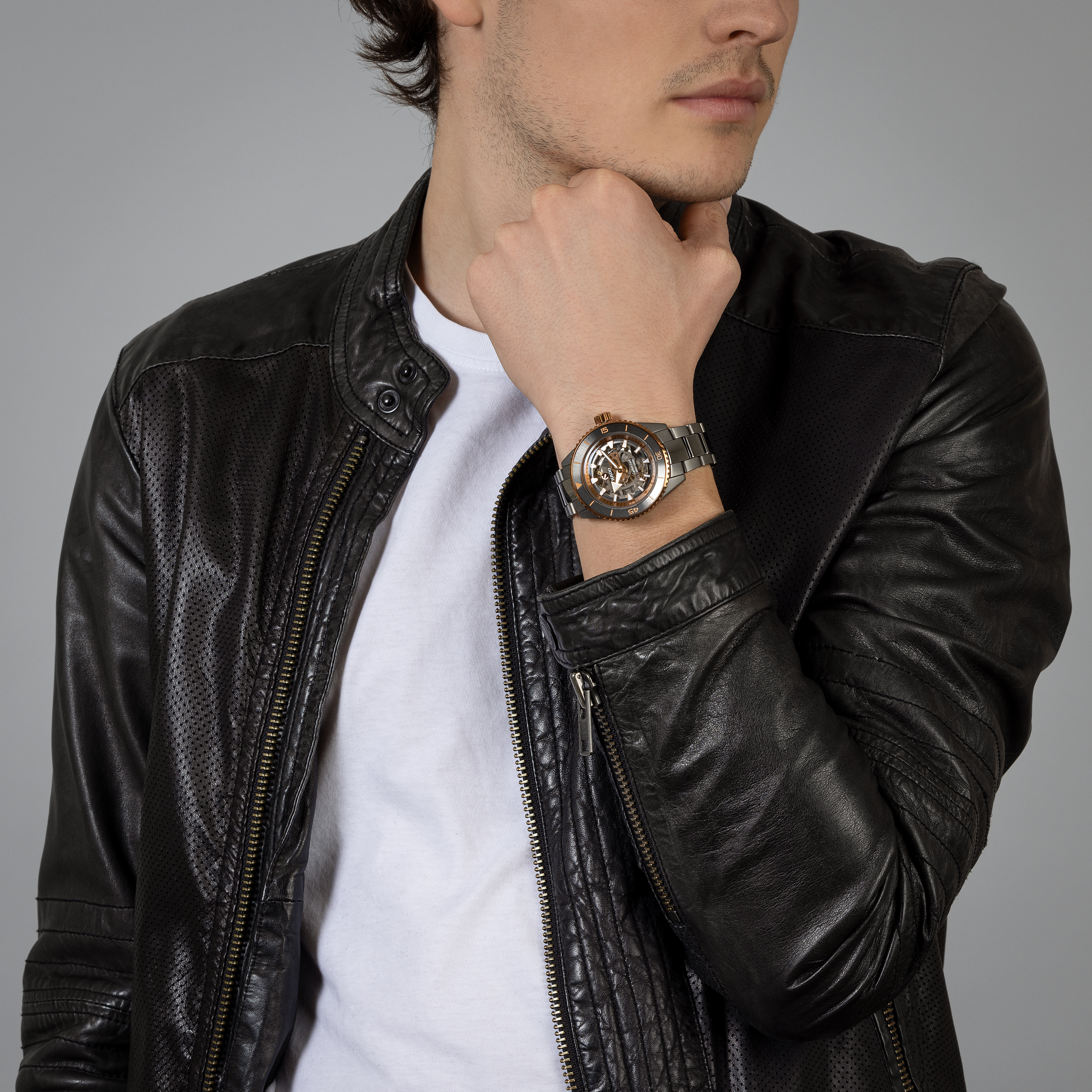 Il Captain Cook High-Tech Ceramic Skeleton vanta l’innovativo movimento R808, meraviglioso connubio di contrasti, know-how e ingegnosa geometria che consente una chiara visione dei vari componenti. È dotato di una spirale antimagnetica Nivachron™ altamente affidabile che è stata accuratamente testata in cinque posizioni e fornisce fino a 80 ore di riserva di carica. La superba cassa monoblocco con finitura opaca è incorniciata da un inserto della lunetta in ceramica hi-tech al plasma spazzolata in senso circolare abbinata alle tonalità della cassa e alle maglie esterne del bracciale. All'interno della lunetta girevole, un anello con indici di un colore oro rosa caldo e luminoso esalta i contrasti, fondendosi al cristallo zaffiro squadrato con rivestimento antiriflesso su entrambi i lati. Il quadrante stesso è volutamente sobrio, con sfere trattate con Super-LumiNova® bianca per migliorare la leggibilità in condizioni di scarsa illuminazione.