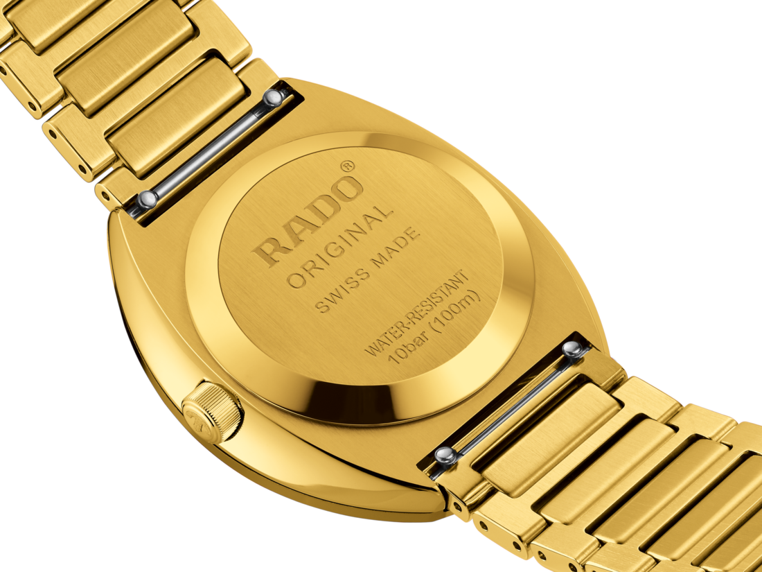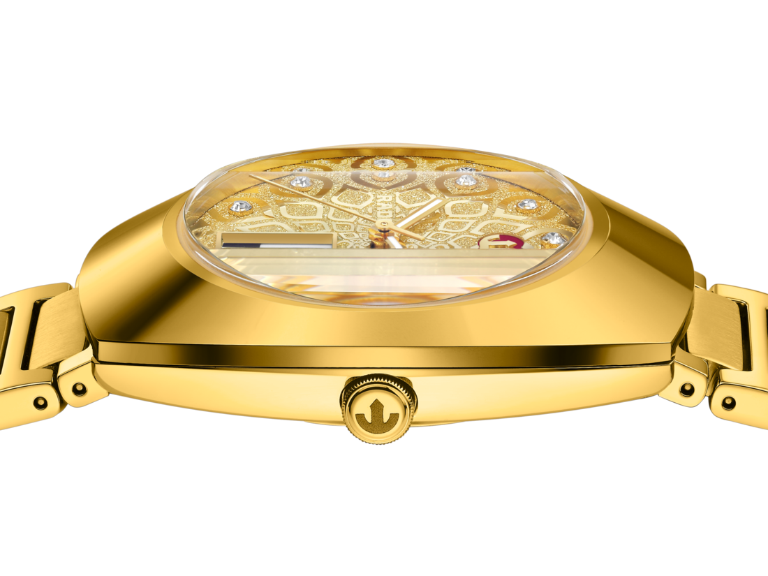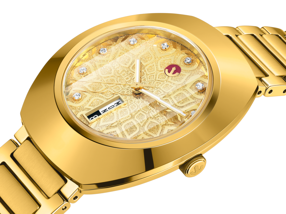 個性的なDiaStar Original(ダイヤスター オリジナル)は38 mm径で、最大100 m防水。ポリッシュ仕上げのアングルとディテール付きで、特別な光沢を備えたイエローゴールドカラーのCeramos™のフレームが、ぴったりマッチしたイエローゴールドカラーPVDコーティングのステンレススチール製ケースの上に収まっています。縦にファセットカットされたサファイアクリスタルがこの美しい時計を見事な仕上げにしています。ホワイトSuper-LumiNova ®を施したイエローカラーの針、そしてホワイトの曜日表示とブラックの日付表示が付いています。ダイアルには11個のライトキュービックジルコニアがあしらわれ、イエローカラーのハーモニックパターンとダイヤモンドパウダーによる装飾が施されています。R764自動巻ムーブメントは耐磁性Nivachron™(ニバクロン)ひげぜんまいを搭載し、最大80時間のパワーリザーブを備えています。ブレスレットは、ポリッシュ仕上げとサテン仕上げを施したイエローゴールドPVDコーティングステンレススチール製です。