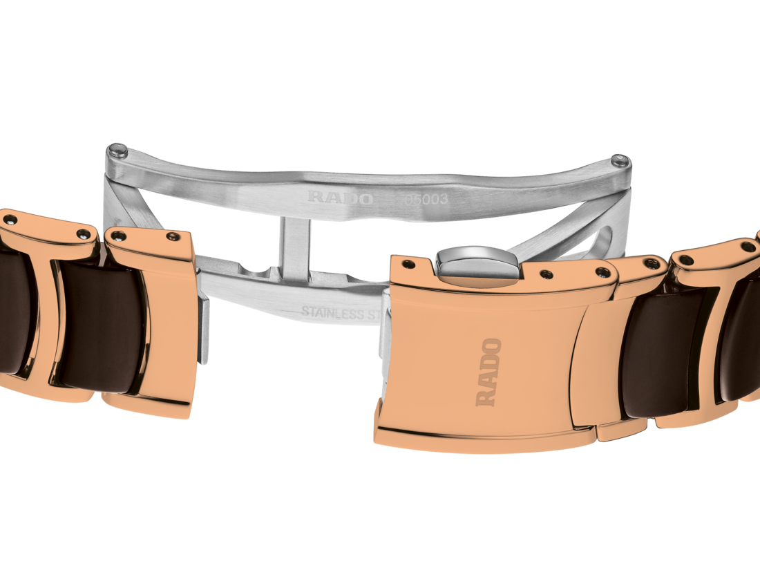 클래식한 디자인이 돋보이는 센트릭스 쿼츠 다이아몬드 시계로 향상된 기술과 더욱 아름다운 디자인이 적용된 것이 특징입니다. 업그레이드된 이 모델에는 엣지까지 전부 둥글게 마감된 사파이어 크리스털과 더불어 곡선형 크리스털 엣지와 어우러지는 곡선형 케이스가 사용되었습니다. 세심하게 조정된 케이스 러그에 브라운 하이테크 세라믹 미들 링크를 사용한 유광 로즈 골드 컬러의 PVD 코팅 스테인리스 스틸 소재 브레이슬릿을 더해 전체적으로 아이코닉한 디자인의 타임피스를 완성했습니다. 브라운 래커 처리한 다이얼을 4개의 다이아몬드로 장식한 후 ‘Jubilé’ 로고 프린트를 더해 포인트를 준 시계로, 로즈 골드 컬러의 핸즈와 환상적인 컬러 매치를 자랑합니다. 또한, 시계에 PreciDrive 및 HeavyDrive 기술이 적용된 칼리버 R079 쿼츠 무브먼트를 탑재하여 정확도와 충격 방지 기능을 향상하는 한편, 방수 기능을 더해 최대 50m까지 견딜 수 있도록 했습니다.