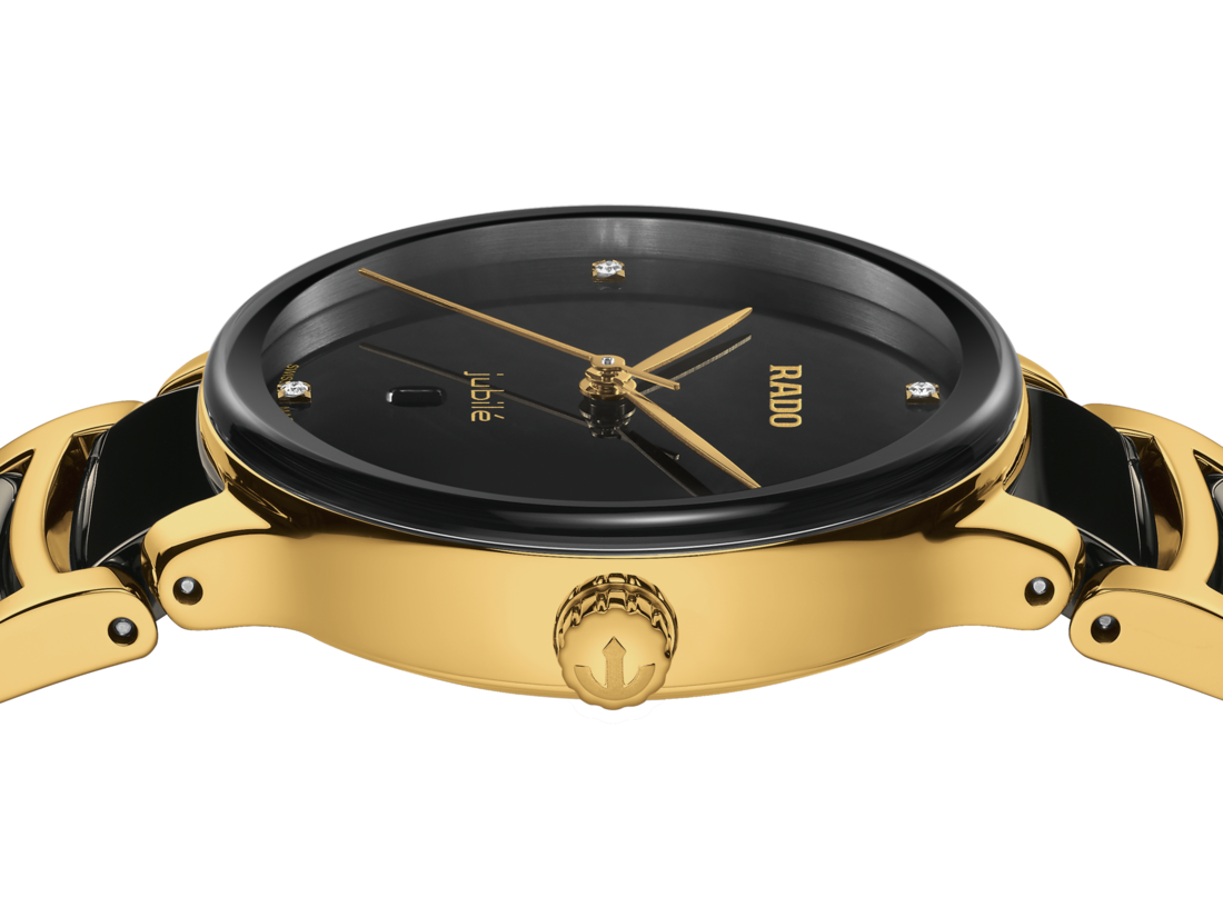 클래식한 디자인이 돋보이는 센트릭스 쿼츠 다이아몬드 시계로 향상된 기술과 더욱 아름다운 디자인이 적용된 것이 특징입니다. 업그레이드된 이 모델에는 에지까지 전부 둥글게 마감된 사파이어 크리스털과 더불어 곡선형 크리스털 에지와 어우러지는 곡선형 케이스가 사용되었습니다. 세심하게 조정된 케이스 러그에 블랙 하이테크 세라믹 미들 링크를 사용한 유광 옐로우 골드 컬러의 PVD 코팅 스테인리스 스틸 소재 브레이슬릿을 더해 전체적으로 아이코닉한 디자인의 타임피스를 완성했습니다. 블랙 래커 처리한 다이얼을 4개의 다이아몬드로 장식한 후 ‘Jubilé’ 로고 프린트를 더해 포인트를 준 시계로, 옐로우 골드 컬러의 핸즈와 환상적인 컬러 매치를 자랑합니다. 또한, 시계에 PreciDrive 및 HeavyDrive 기술이 적용된 칼리버 R079 쿼츠 무브먼트를 탑재하여 정확도와 충격 방지 기능을 향상하는 한편, 방수 기능을 더해 최대 50m까지 견딜 수 있도록 했습니다.