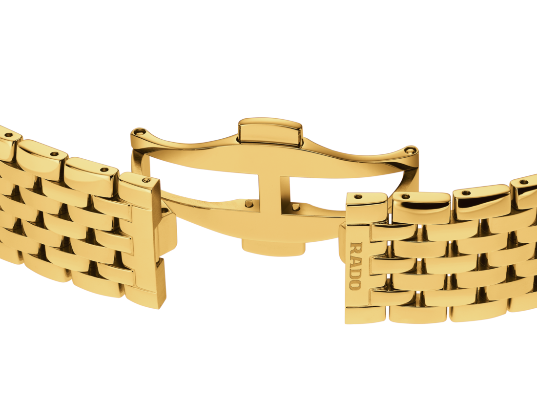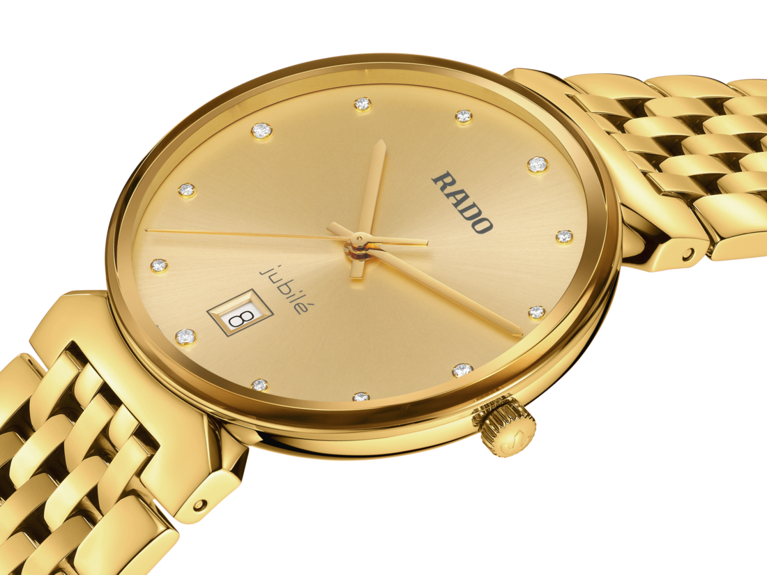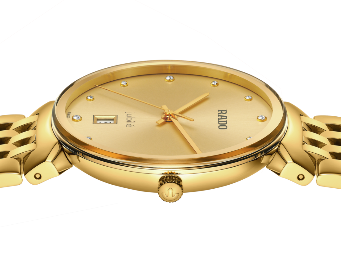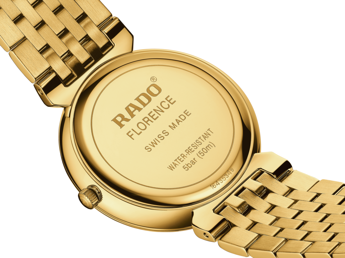 Rado Florence의 조화로운 디자인은 컬렉션 이름이 유래한 도시인 플로렌스의 우아한 돔과 타워를 연상케 합니다. 시계 구동 장치로 신뢰할 수 있는 3핸즈 Rado 칼리버 R073 쿼츠 무브먼트를 사용하여 정확도와 충격 방지 기능을 향상했습니다. 베벨 방식으로 가공한 에지 투 에지 커브드 사파이어 크리스털이 적용된 38mm 시계입니다. 케이스, 크라운, 베젤, 케이스백에 유광 옐로우 골드 컬러로 PVD 코팅된 스테인리스 스틸 소재를 사용한 것이 특징입니다. 여기에 유광 옐로우 골드 컬러로 코팅된 스테인리스 스틸 소재 브레이슬릿을 더해 전체적으로 클래식한 디자인의 타임피스를 완성했습니다. 옐로우 골드 컬러의 다이얼은 'jubilé' 로고 프린트로 12개의 다이아몬드 장식을 강조했으며, 옐로우 골드 컬러의 핸즈와 완벽한 조화를 이룹니다. 50m까지 방수가 되며, S 사이즈도 출시되어 있어 커플 시계로 적합한 모델입니다.