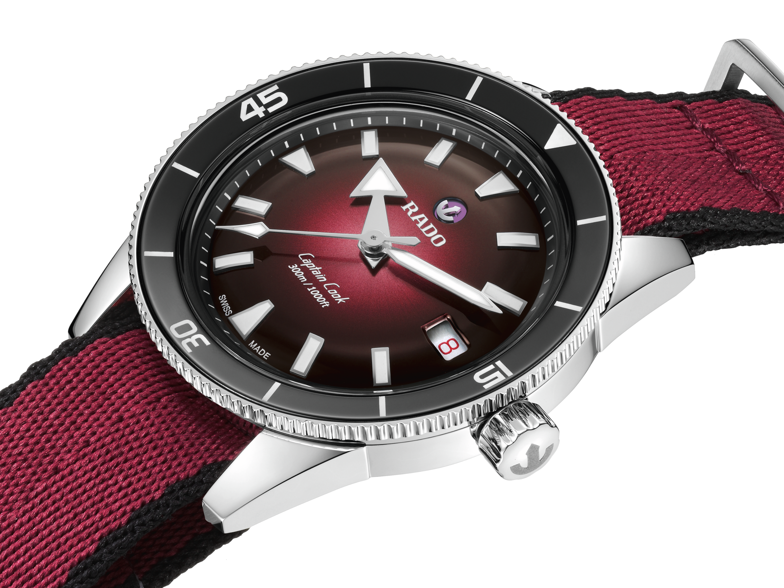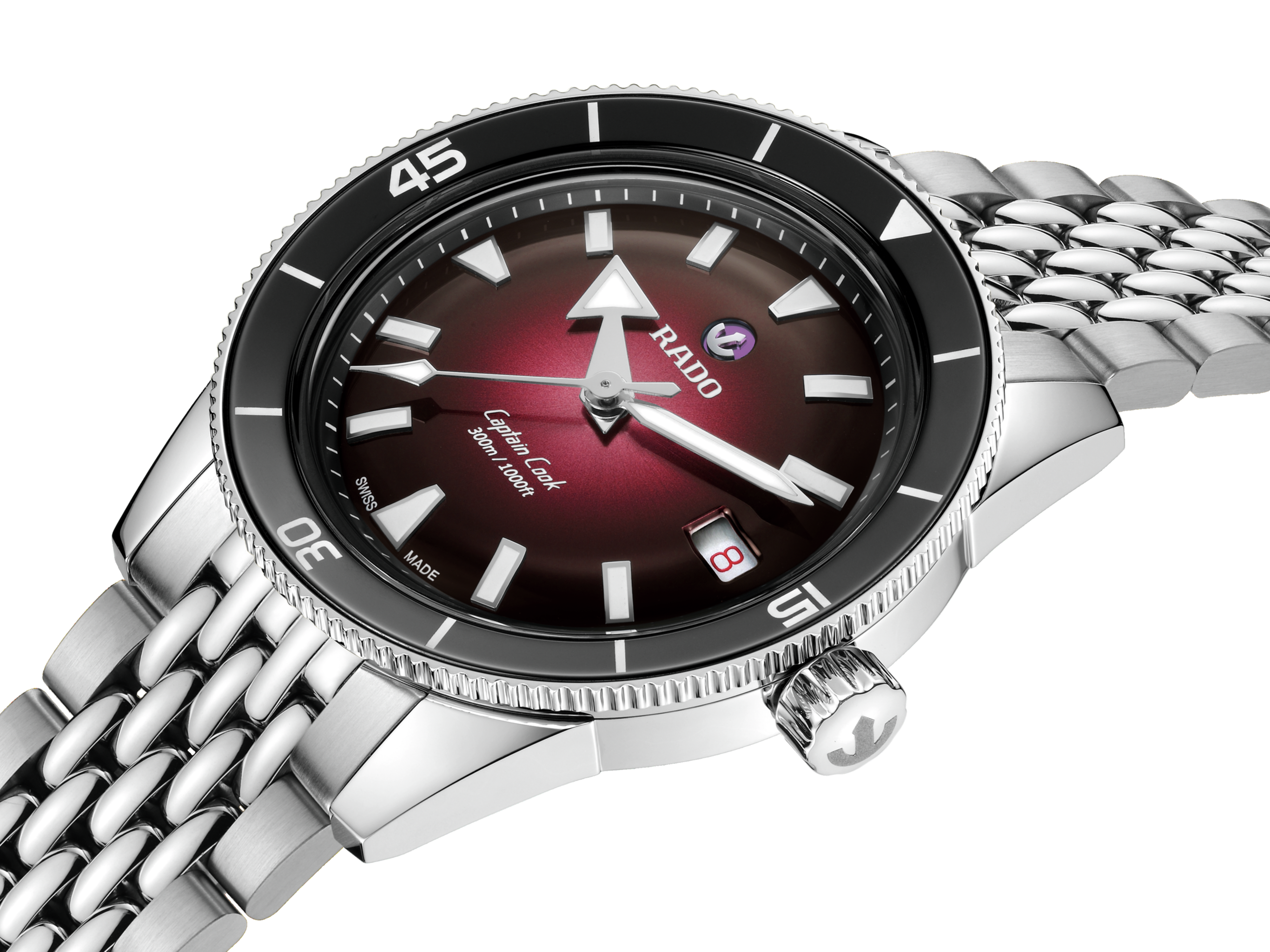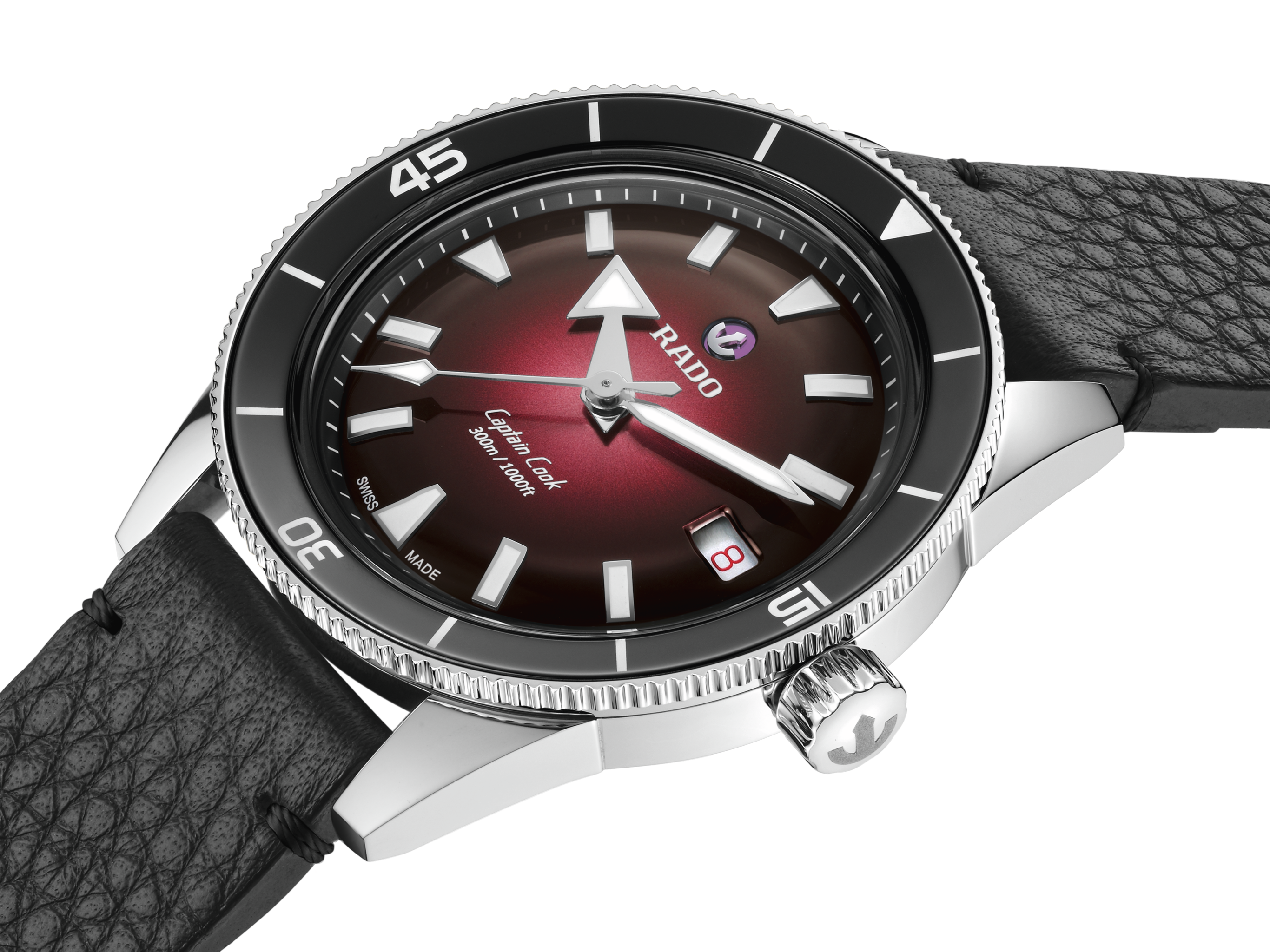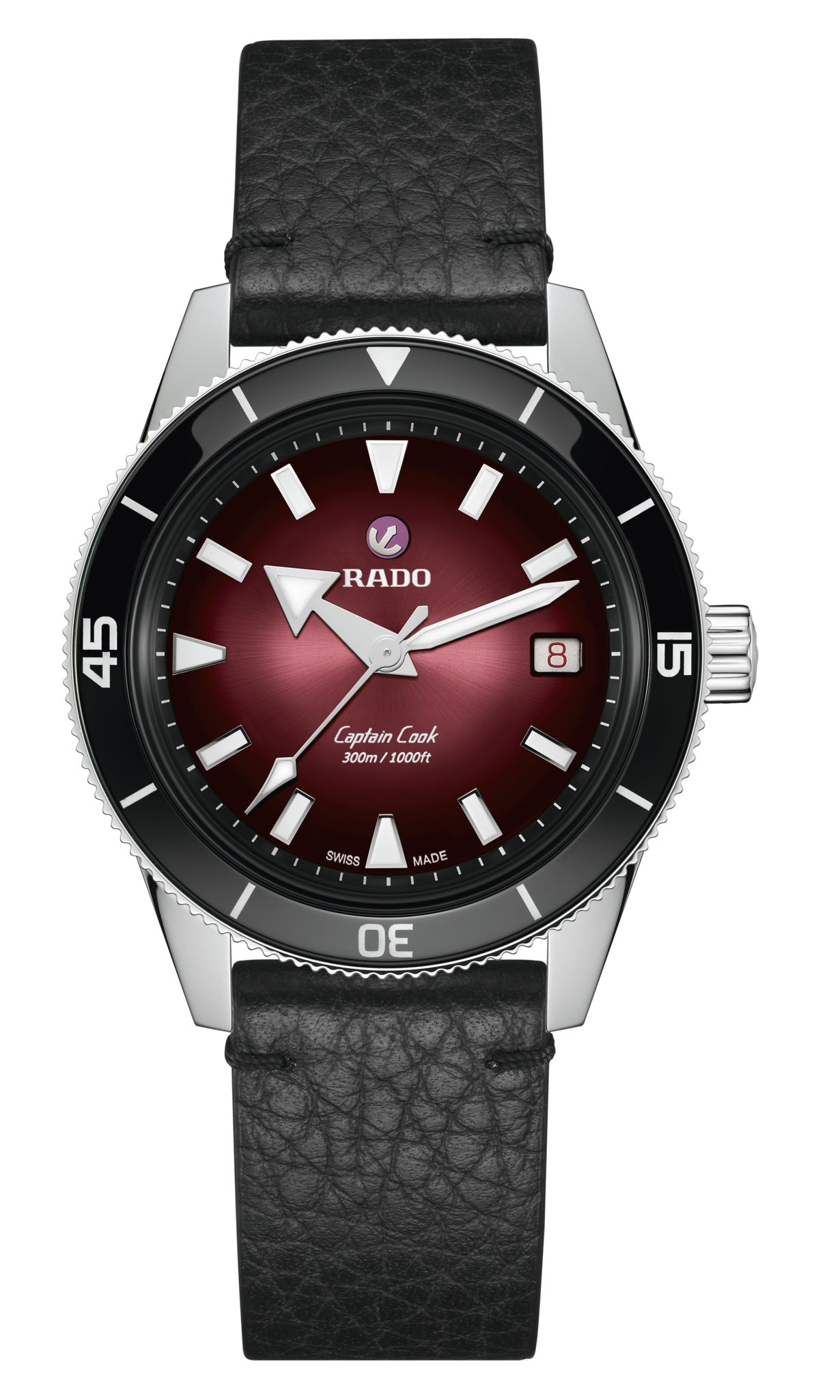 This captivating Captain Cook, inspired by the original 1962 edition, gives pride of place to the black-to-burgundy gradient dial shimmering beneath a box-shaped sapphire crystal. The striking look is enhanced by rhodium-coloured applied indexes and hands with Super-LumiNova, and by the polished black bezel insert in Rado’s signature high-tech ceramic. The watch is powered by Rado calibre R763, a 25-jewel, three-hand automatic movement with an antimagnetic Nivachron hairspring for enhanced reliability and accuracy. Water-resistant to 30 bar (300m), the 39mm diameter case in stainless steel complements the existing 37mm and 42 mm case sizes, extending the appeal of the Captain Cook range to accommodate wrists of all sizes. The watch is worn with a vintage-style rice grain stainless steel bracelet for classic occasions, easily exchanged for two additional straps: a burgundy NATO-style textile strap with black border, and a black leather strap. Rich, robust and reliable – a perfect companion for active adventurers.