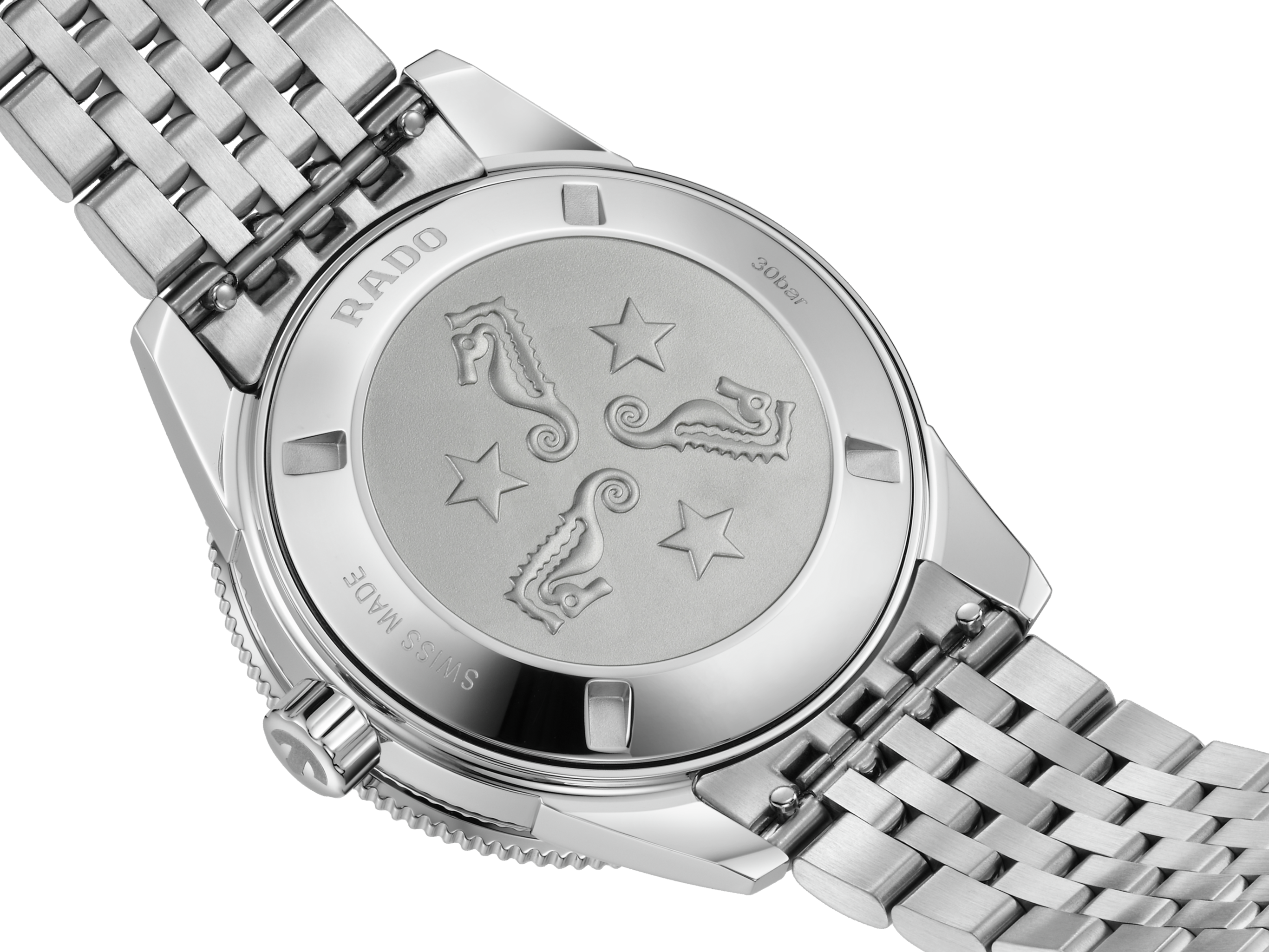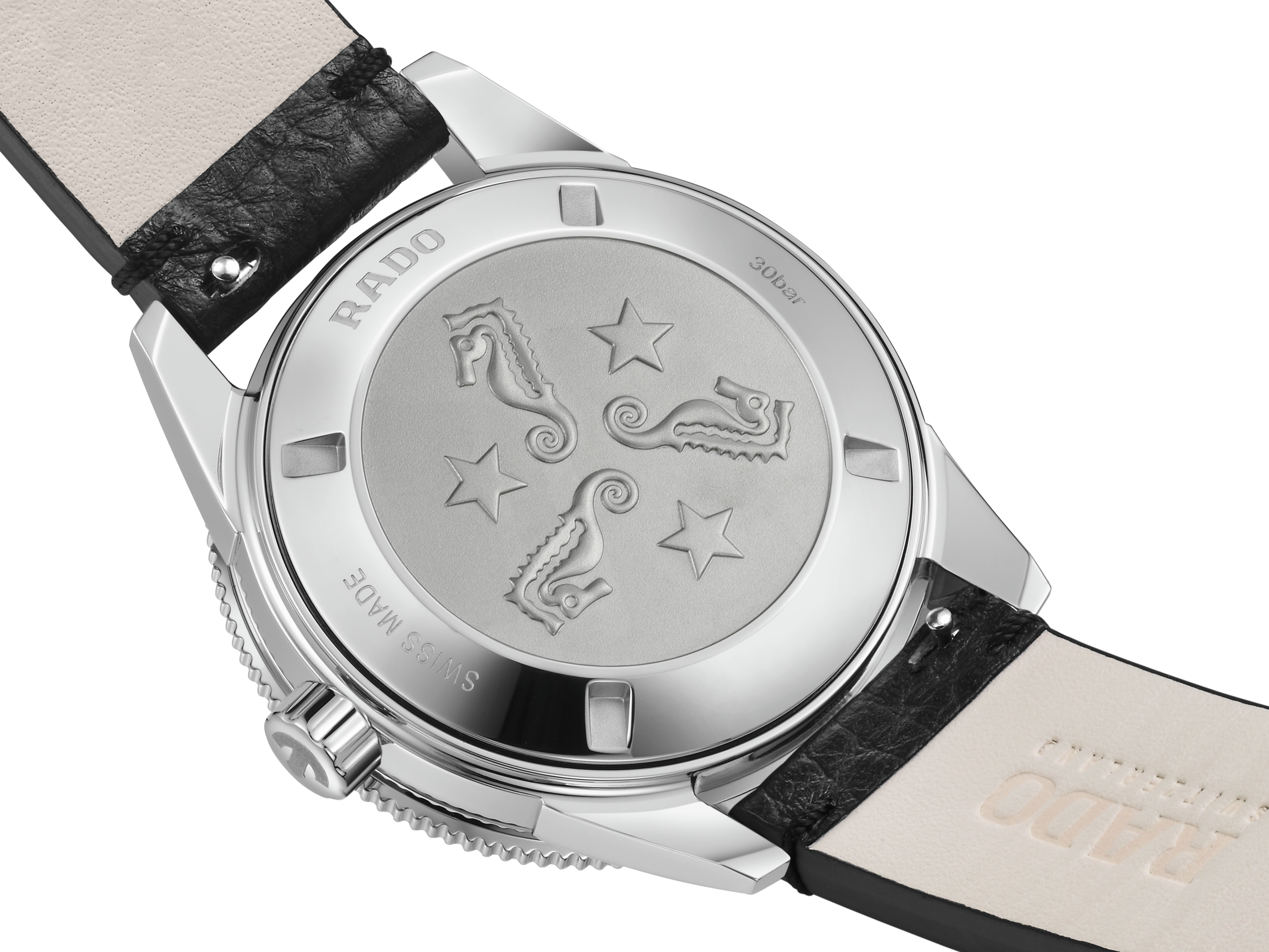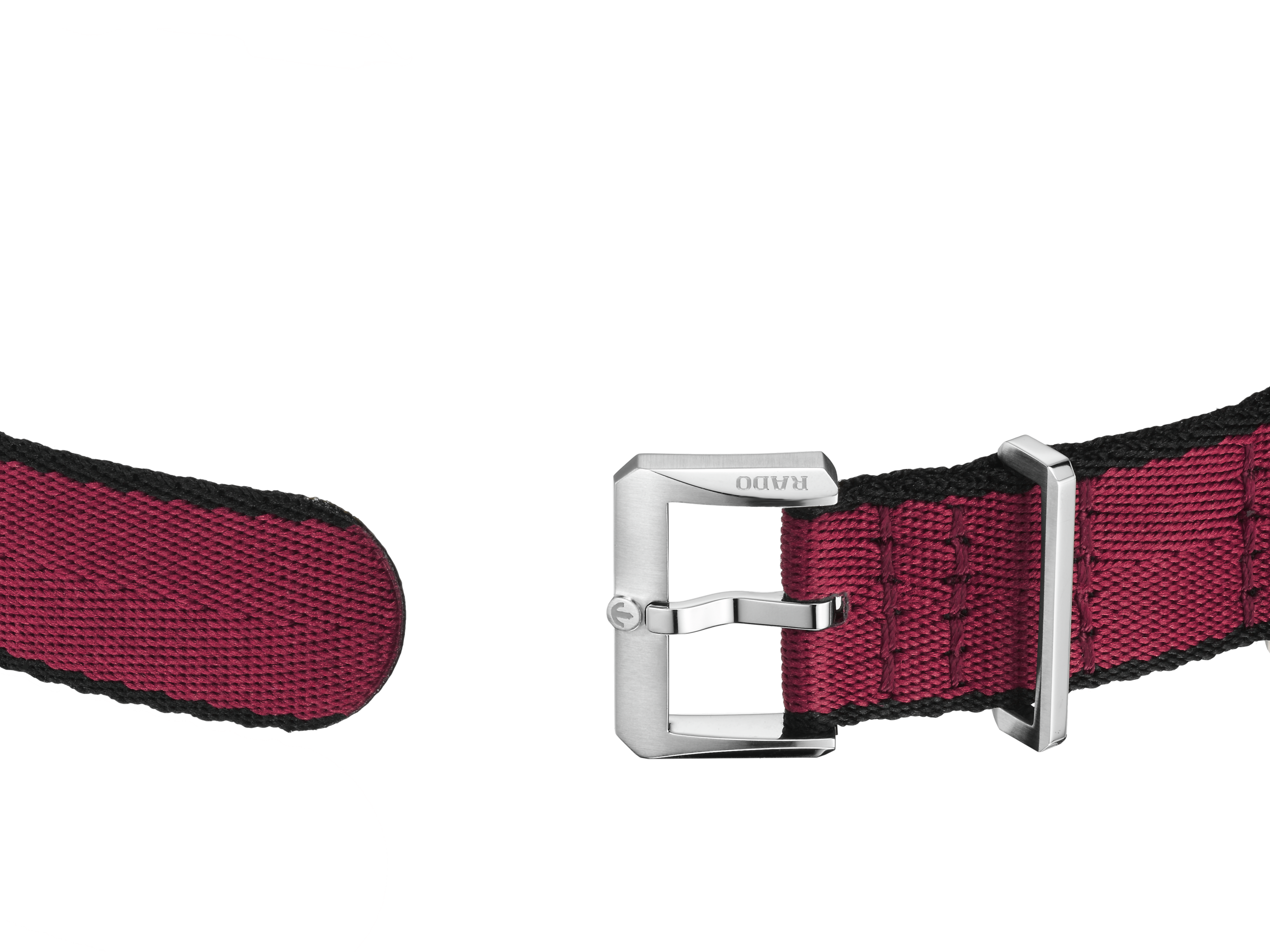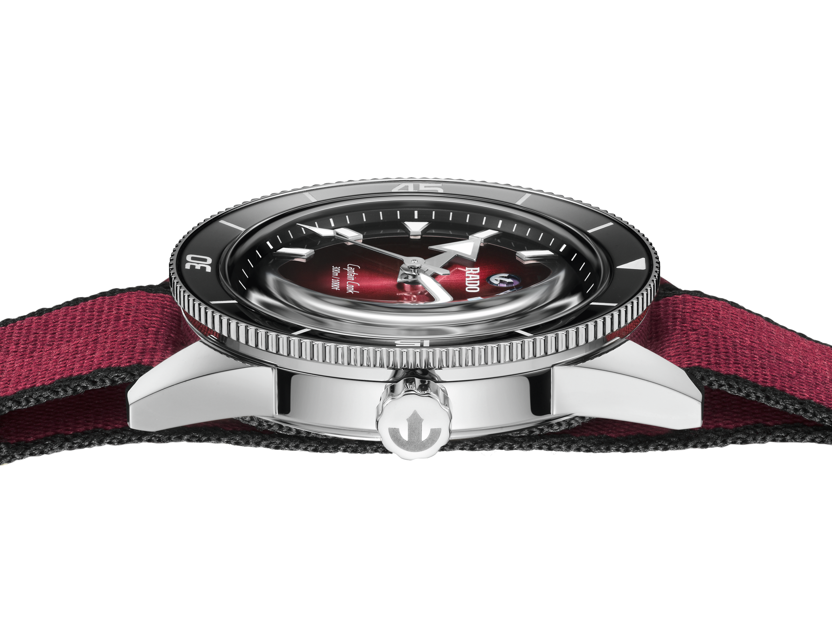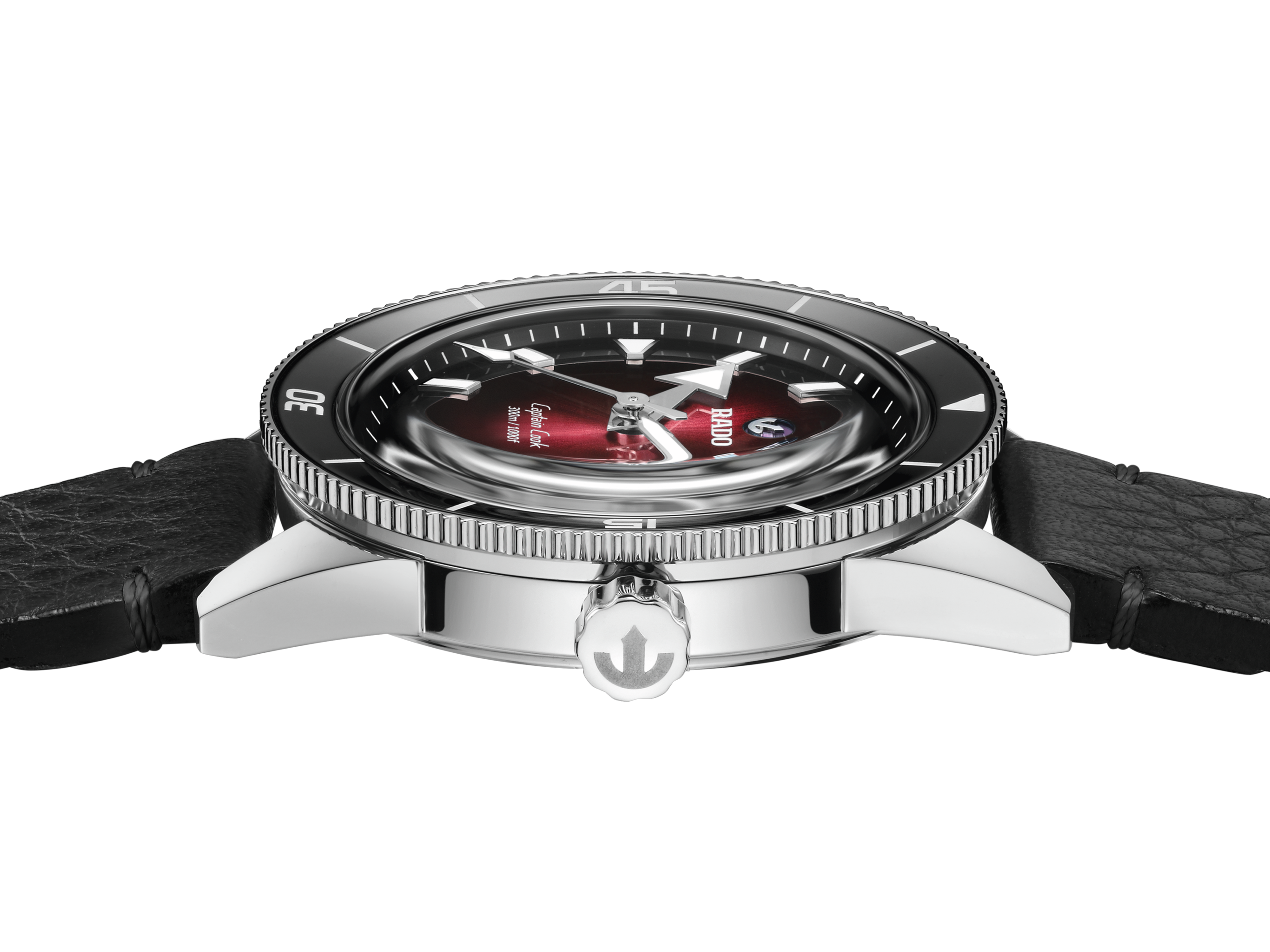 This captivating Captain Cook, inspired by the original 1962 edition, gives pride of place to the black-to-burgundy gradient dial shimmering beneath a box-shaped sapphire crystal. The striking look is enhanced by rhodium-coloured applied indexes and hands with Super-LumiNova, and by the polished black bezel insert in Rado’s signature high-tech ceramic. The watch is powered by Rado calibre R763, a 25-jewel, three-hand automatic movement with an antimagnetic Nivachron hairspring for enhanced reliability and accuracy. Water-resistant to 30 bar (300m), the 39mm diameter case in stainless steel complements the existing 37mm and 42 mm case sizes, extending the appeal of the Captain Cook range to accommodate wrists of all sizes. The watch is worn with a vintage-style rice grain stainless steel bracelet for classic occasions, easily exchanged for two additional straps: a burgundy NATO-style textile strap with black border, and a black leather strap. Rich, robust and reliable – a perfect companion for active adventurers.