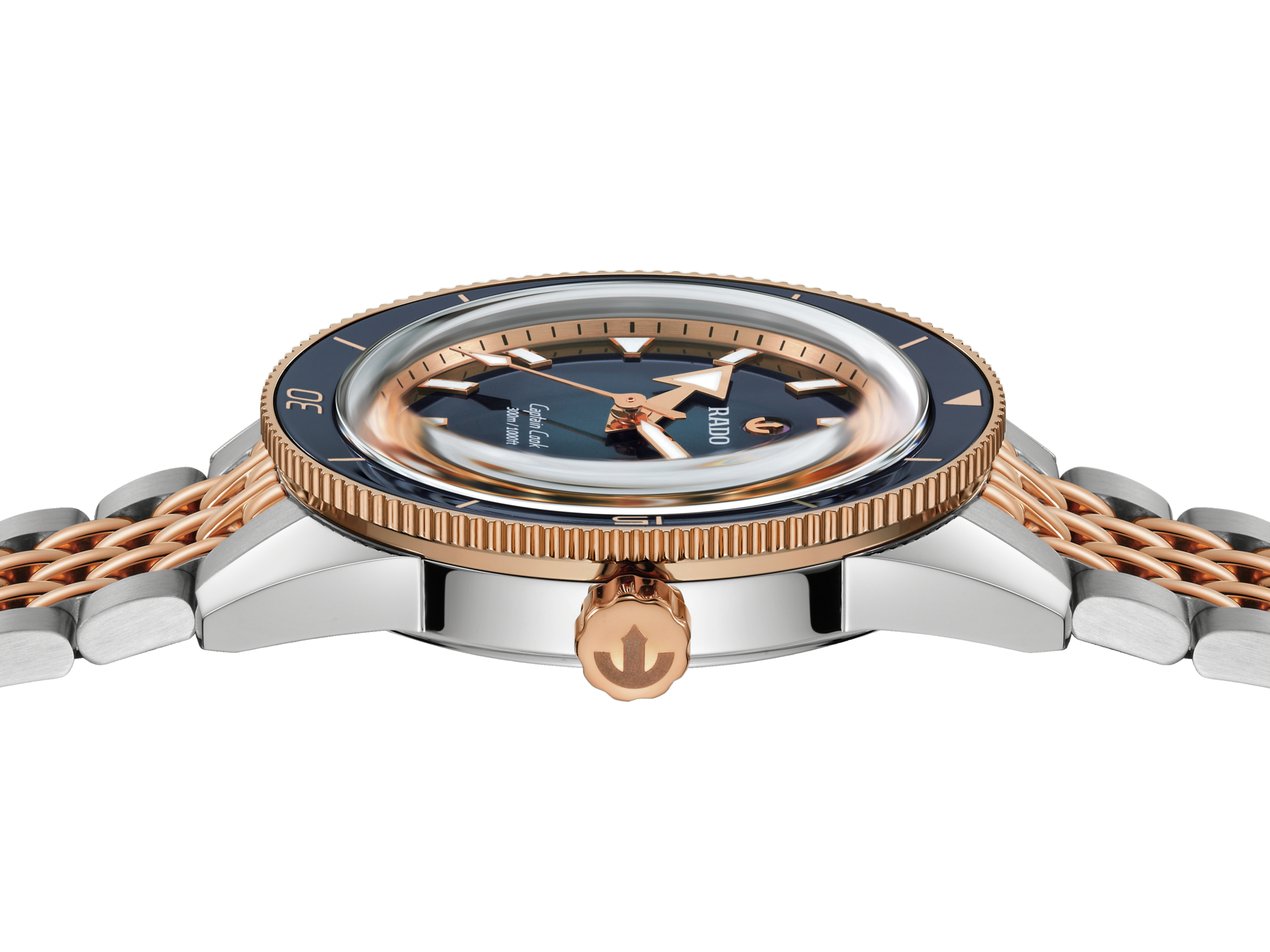 The first Captain Cook appeared in 1962, and remains an inspiration for today’s new versions. The vintage dive watch look seduces with colour: The rose gold-coloured middle links on the stainless steel bracelet and rose gold-coloured turning bezel and crown add lustre to the polished blue high-tech ceramic insert. The box-shaped sapphire crystal frames a splendid black-to-blue gradient dial with rose gold-coloured indexes and hands with Super-LumiNova highlights. This alluring interpretation of the iconic original is powered by the Rado calibre R763, a 25-jewel, three-hand automatic movement with an antimagnetic Nivachron hairspring for proven reliability and enhanced accuracy. Water-resistant to 30 bar (300m), the 39mm diameter case in stainless steel complements the existing 37mm and 42 mm case sizes, extending the appeal of the Captain Cook range to accommodate wrists of all sizes. Fitted with a rice grain style stainless steel bracelet, this contemporary Captain Cook sounds a timeless call to adventure.
