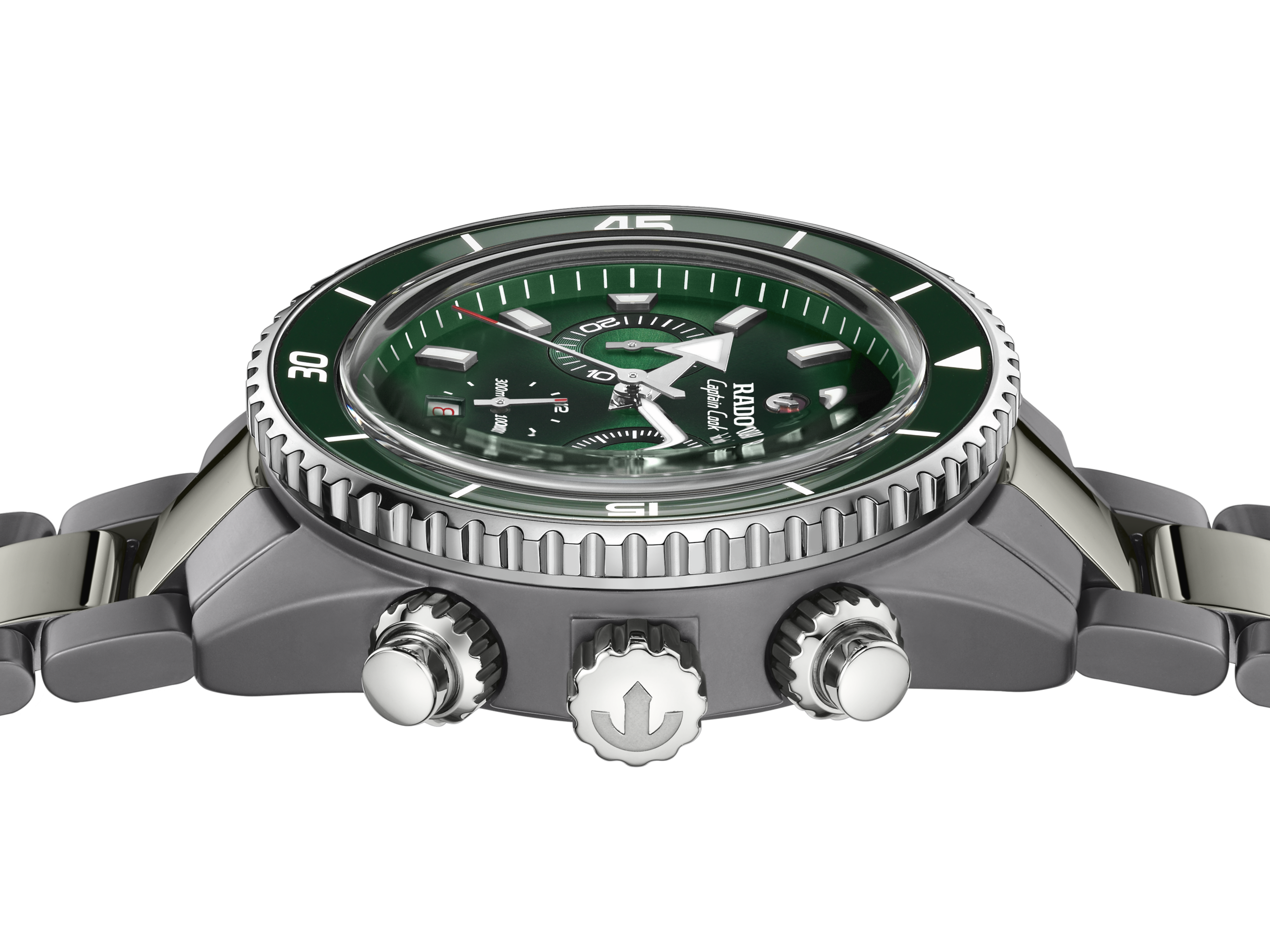 Precision forged through extreme engineering—the Captain Cook High-Tech Ceramic Chronograph is the result of uncompromising processes and material innovation. Born from pressure, heat, and technical mastery, its construction pushes the boundaries of what’s possible in modern watchmaking. The 43 mm monobloc case is crafted from plasma high tech ceramic, the result of an extreme transformation process where white ceramic is exposed to gases activated at 20,000 degrees Celsius. In this searing environment, its molecular structure is altered, giving rise to a unique metallic finish—achieved without a single particle of metal. A feat of pure material science, paired with a stainless-steel turning bezel and a polished green ceramic insert, engraved with white Super-LumiNova® markers.