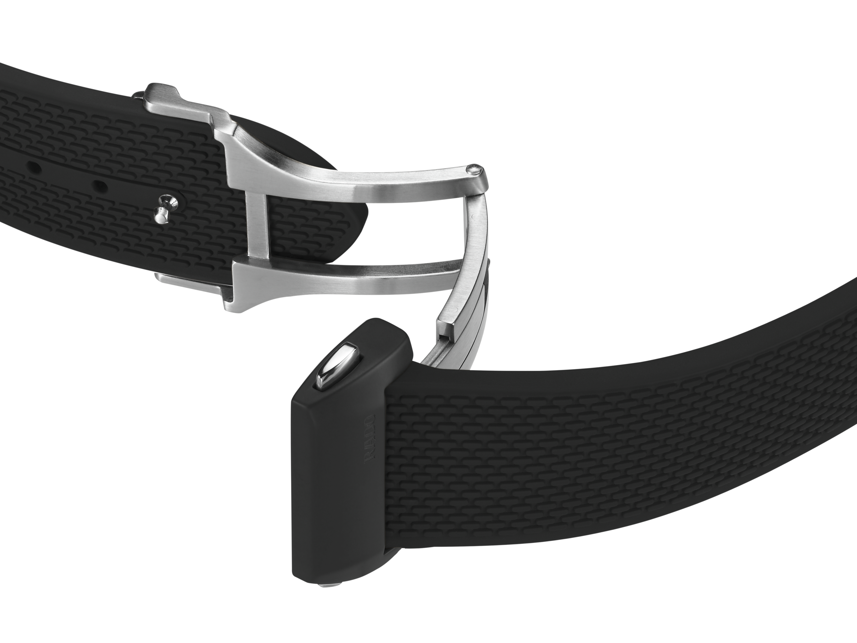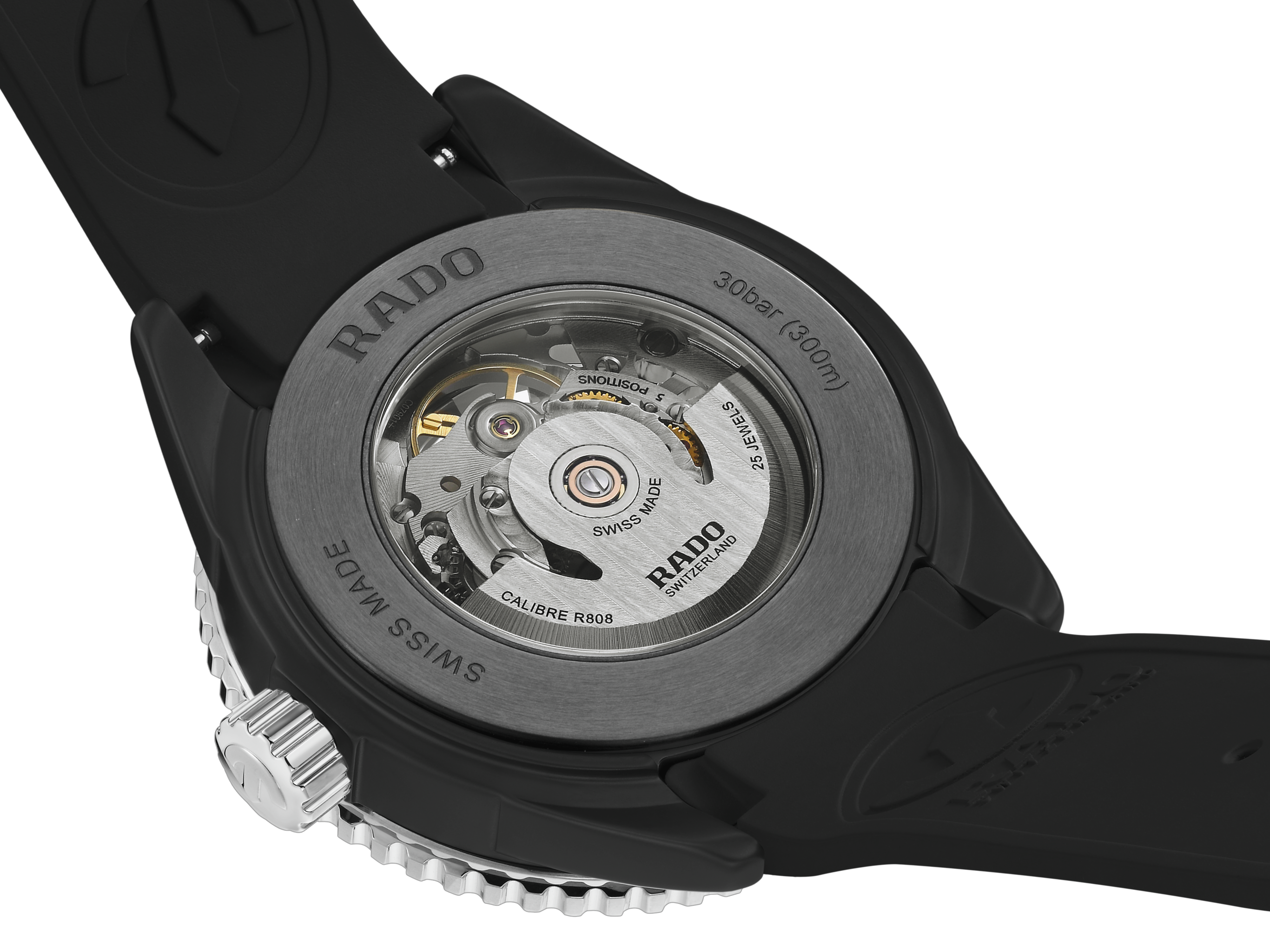 A distinguished 43mm tribute to the original Captain Cook from 1962, this skeleton watch enhances comfort and durability thanks to a matt black monobloc high-tech ceramic case and box-shaped sapphire crystal. The hardened stainless steel turning bezel holds a polished black high-tech ceramic insert with engraved white lacquer markers and triangle in white Super-LumiNova. Beneath the tinted black sapphire crystal, a black flange backs a white minute track; white Super-LumiNova highlights at five-minute intervals and on the polished rhodium indexes make the watch easy to read under all lighting conditions. The striking, black-on-black design showcases the intricate skeletonized movement, its mesmerising rhythms inviting the wearer into the heart of the watch. The Rado calibre R808 is a three-hand, 25 jewel automatic movement, fitted with a Nivachron hairspring and 80-hour power reserve, adjusted in five positions to ensure optimal performance. The watch is worn with a matt black rubber strap for a casual, sporting look and robust comfort.