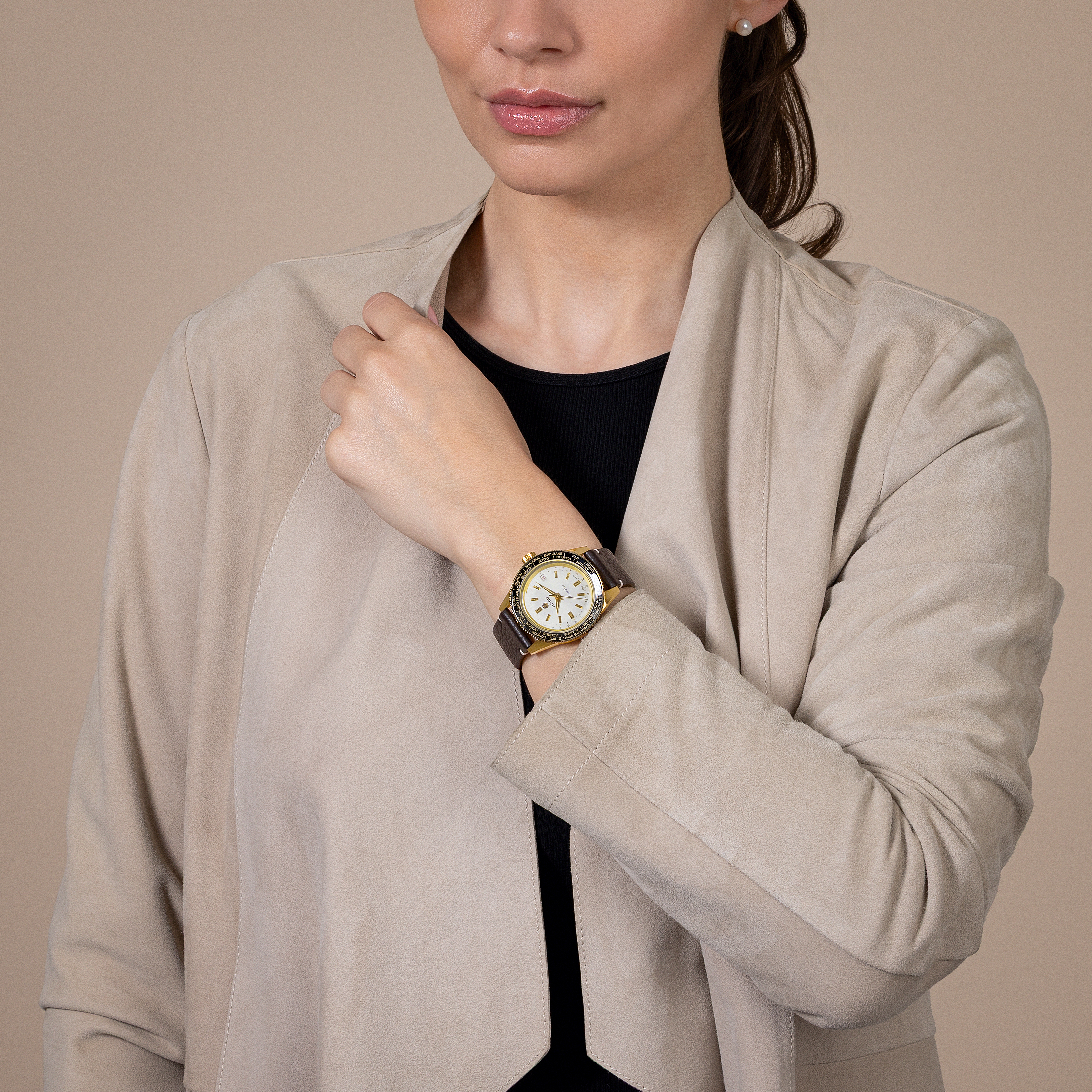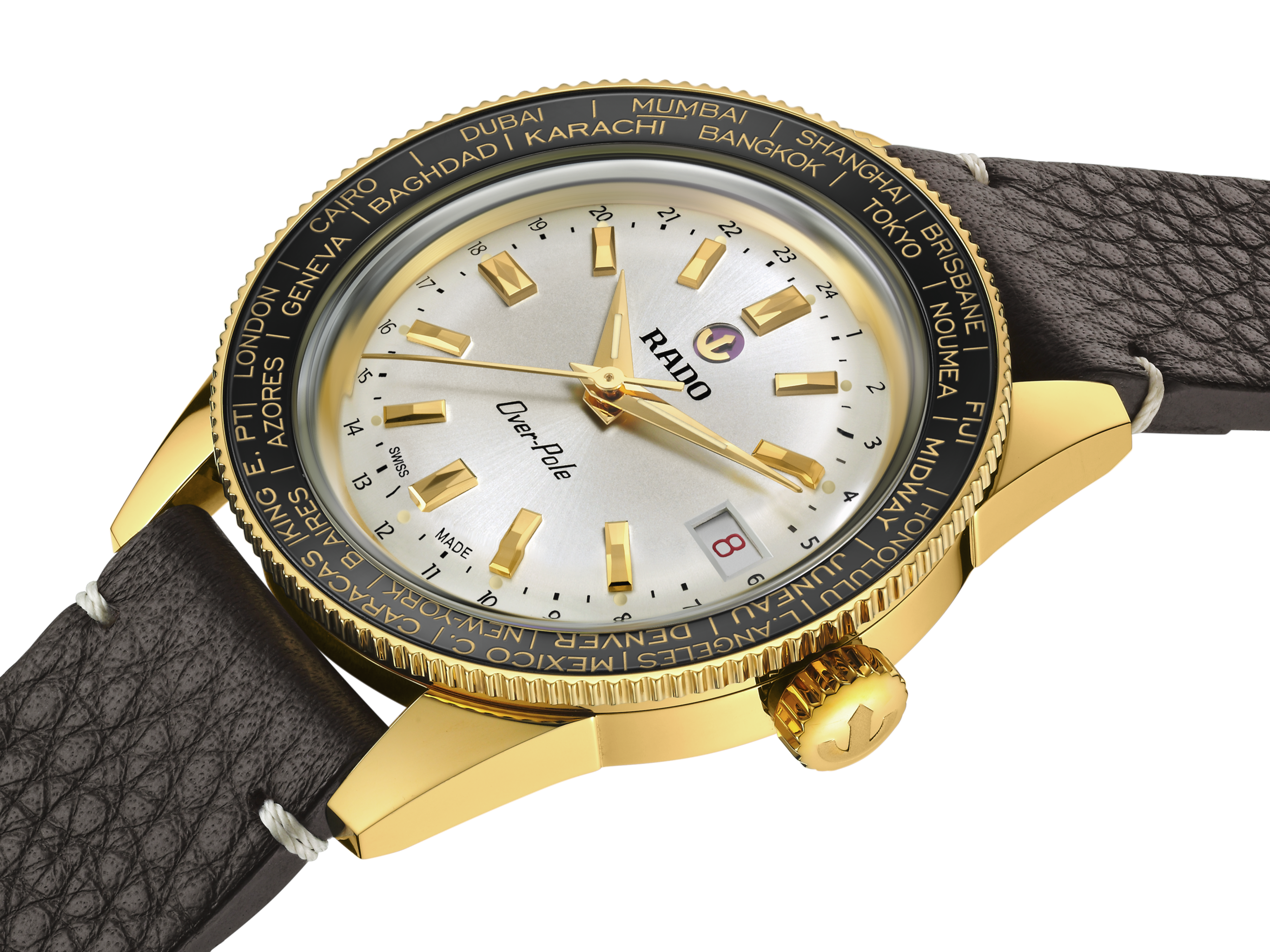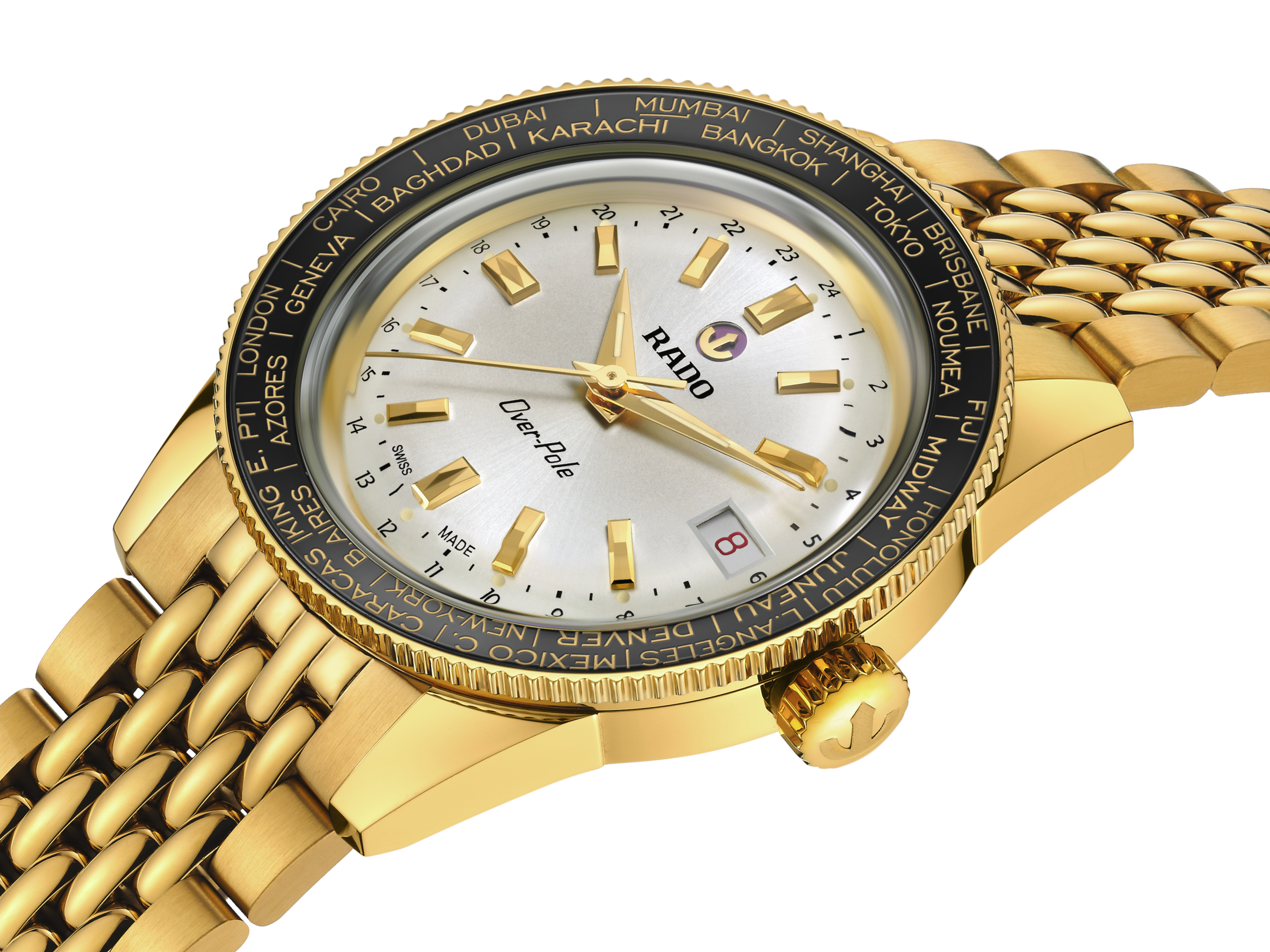 The Captain Cook Over-Pole is back! A stunning new Limited Edition reprises the key features of previous versions, in particular the R862 Worldtimer manual-winding movement. Robust, precise, and guaranteed to perform thanks to rigorous in-house testing in 5 separate positions, it is mounted within a bold 39 mm case. Côtes-de-Genève surface finishing, blued screws and gold-coloured details are easily admired through the sapphire crystal on the back. As sleek as it handsome, the new version comes with a stylish yellow gold PVD stainless steel bracelet with three-fold clasp. The bracelet is easily exchanged with a rugged brown leather strap thanks to Rado’s Easy-Clip system. In addition, the new Over-Pole comes with a practical leather pouch to store the watch and extra strap, and is accompanied by an official Limited Edition Certificate.