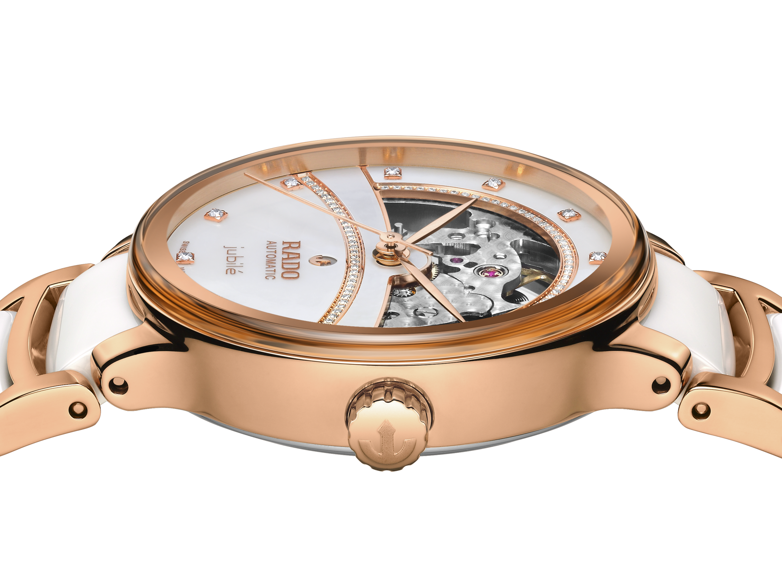 Experience the harmonious blend of artistic expression and design stylings with the Rado Centrix Open Heart watch. A large window, reminiscent at once of dawn and dusk, beautifully frames a state-of-the-art R734 automatic movement with 80 hours of power reserve and an antimagnetic NivachronTM hairspring, as well as a deeply elegant rippled-sunlight "ondulé soleil" motif on chosen component surfaces. The overall appearance of this iconic timepiece is completed with adjusted case lugs and a bracelet made of polished rose-gold-coloured PVD-coated stainless steel with white high-tech ceramic middle links. The white mother-of-pearl dial with 12 diamonds, emphasised with the rose gold coloured printed “jubilé” logo, matches perfectly with the hands. The Super Jubilé version adds a further sparkling stream of 86 diamonds along the lower arch of the bridge, as an ultimate statement of love-struck sophistication and finesse. The watch is water resistant down to 50 m.