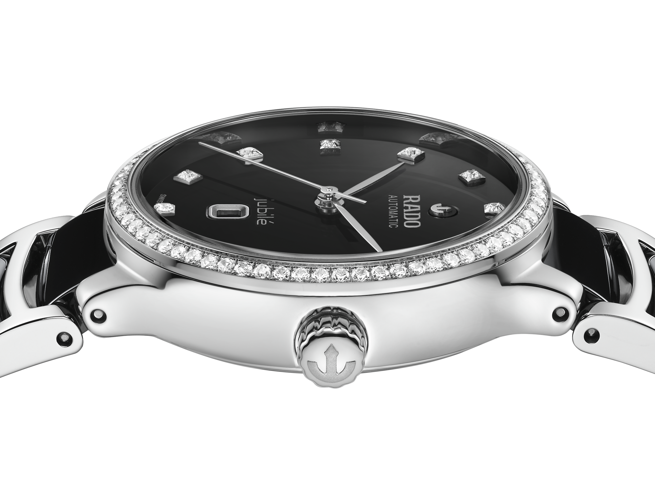 Experience the Centrix Super Jubilé – a blend of artistic expression and refined design. Crafted in stainless steel, the 30.5 mm case is refined with a luxurious bezel set with 68 Top Wesselton, VS-SI, brilliant cut diamonds. In addition, the curved sapphire crystal features an anti-reflective coating on both sides, ensuring unmatched readability. At the heart of this watch beats the R582 automatic calibre, which is visible through the sapphire crystal case back. The movement is equipped with an antimagnetic Nivachron™ hairspring, delivering exceptional accuracy and a 48-hour power reserve. The black lacquered dial is adorned with 12 Top Wesselton, VS-SI, brilliant cut diamond indexes and a date window at 6 o’clock. The neat look is completed with a stainless-steel bracelet with black high-tech ceramic middle links. Finally, the bracelet features a triple-fold stainless steel clasp.