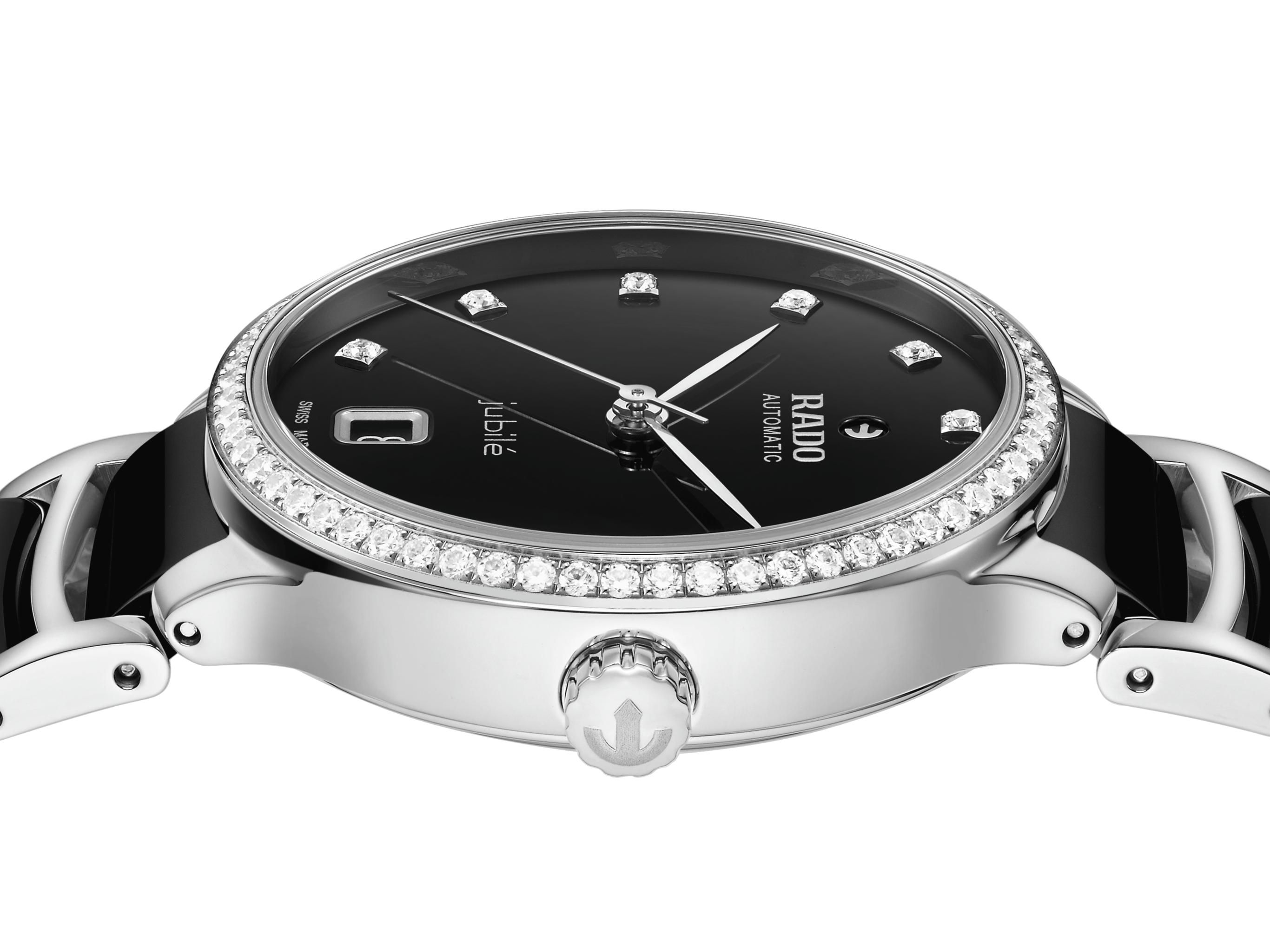The black lacquered dial, adorned with 11 Top Wesselton VS-SI full-cut diamond indexes and a date window at 6 o’clock, radiates timeless elegance. The overall appearance of this iconic timepiece is completed with elegantly adjusted case lugs and a bracelet made of polished stainless steel with black high-tech ceramic middle links, secured by a triple-fold stainless steel clasp.