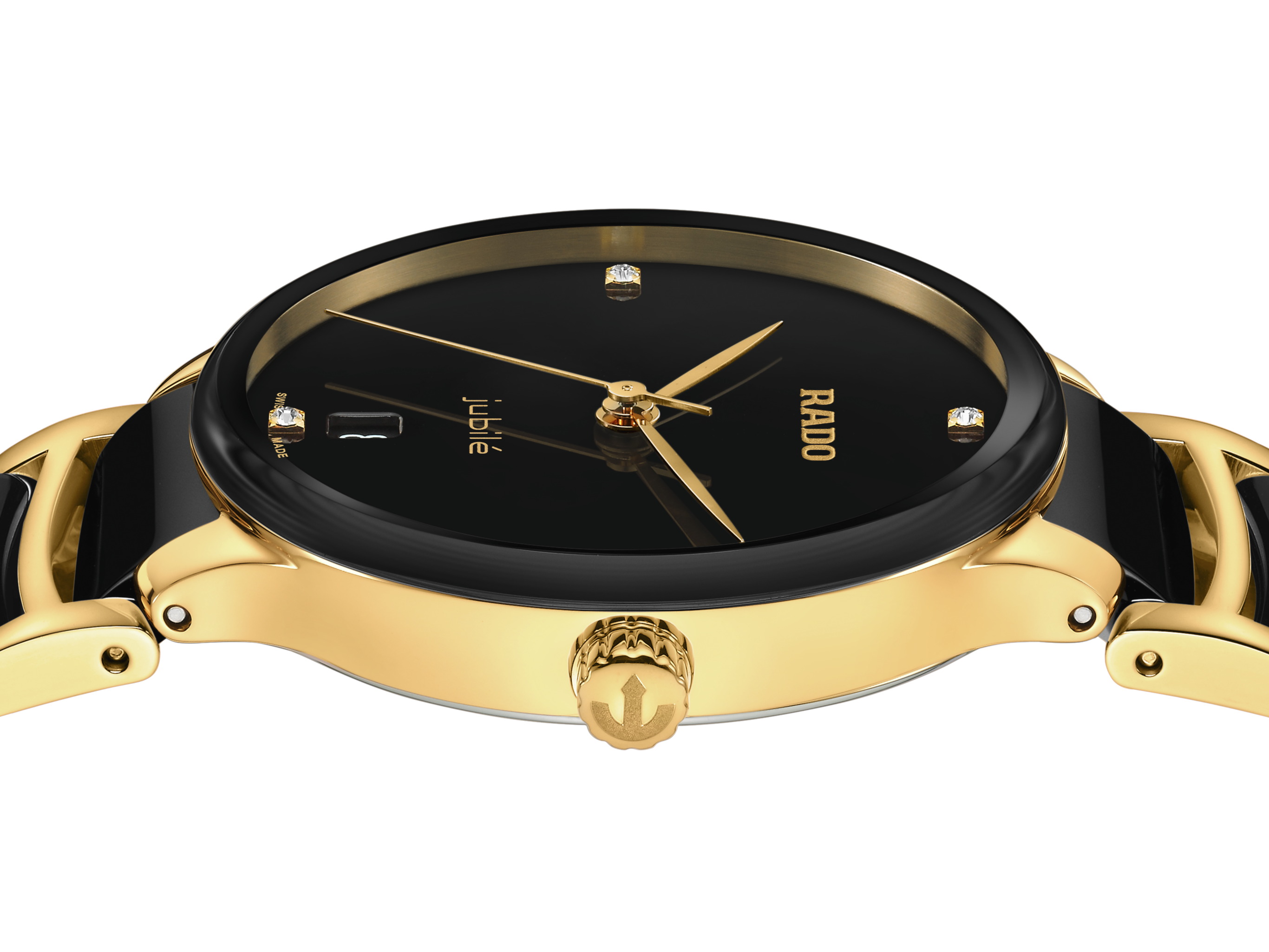 The classic Centrix Quartz Diamonds watch has been reworked not only technically, but also aesthetically. The modified model has a rounded sapphire crystal that extends all the way to the edge and a curved case blending with the curved crystal edge. The overall appearance of this iconic timepiece is completed with adjusted case lugs and a bracelet made of polished yellow gold-coloured PVD-coated stainless steel with black high-tech ceramic middle links. The black lacquered dial with 4 diamonds, emphasised with the printed “jubilé” logo, matches perfectly with the yellow gold-coloured hands. Thanks to the PreciDrive and HeavyDrive features in the calibre R073 quartz movement, the watch has greater accuracy and resistance to shocks. The watch is water-resistant down to 50 m.