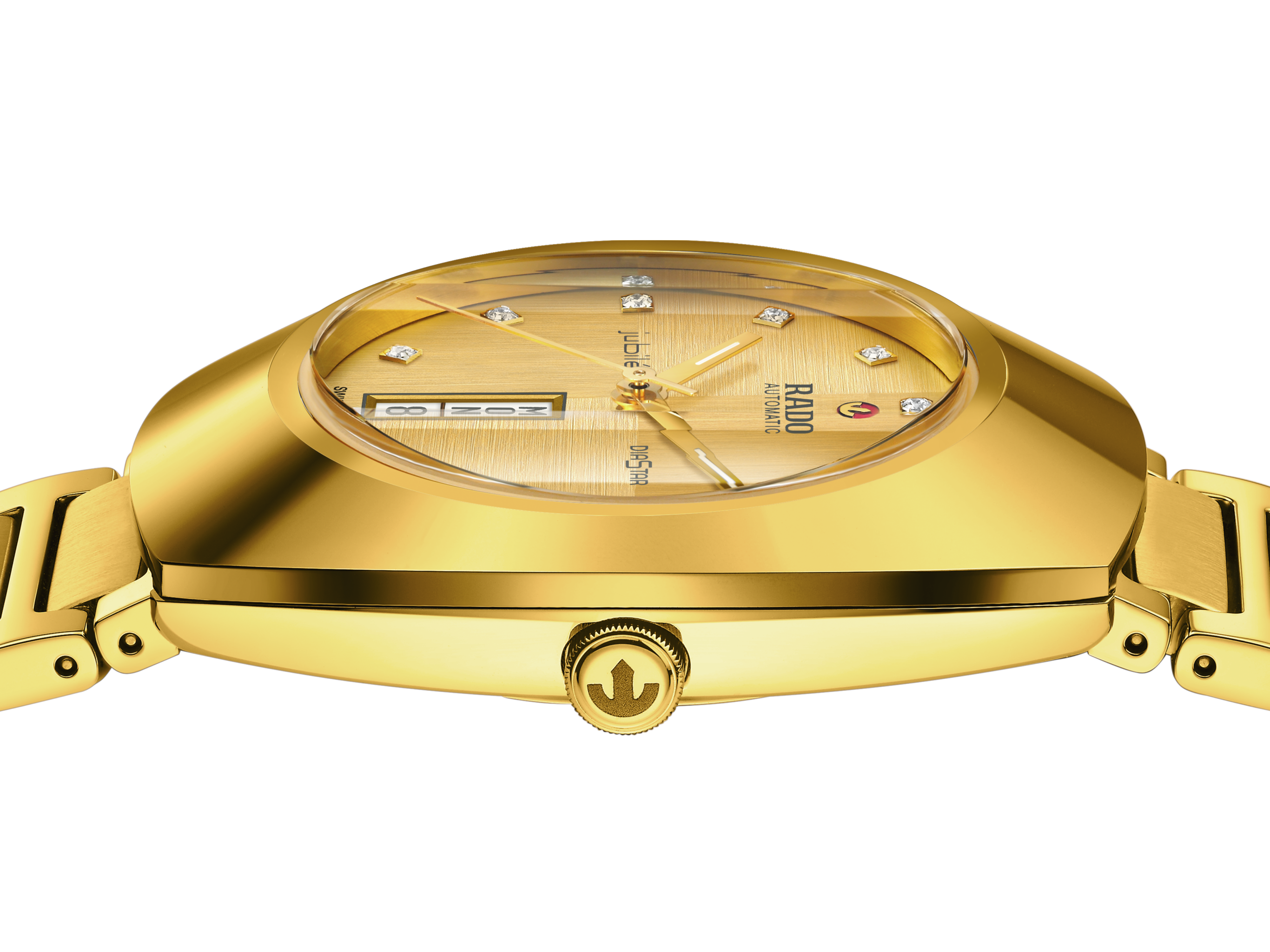 The unique DiaStar Original has a diameter of 38 mm and is water resistant down to 100 m. Framed by an ultra-shiny yellow gold coloured Ceramos™ coiffe with polished angles and detailing set over a matching, yellow gold coloured PVD coated stainless-steel case, this beautiful watch is rounded off with a parallel-stripe-faceted sapphire crystal. Specifications include a gold brushed dial with two directions, yellow gold coloured hands with white Super-LumiNova®, and a white day date display. The dial features eleven full cut diamonds, emphasised with the dark grey coloured printed “jubilé” logo. The Rado R764 automatic movement offers 80 hours of power reserve, with an antimagnetic Nivachron™ balance spring. The bracelet is made of yellow gold PVD coated polished and brushed stainless steel.