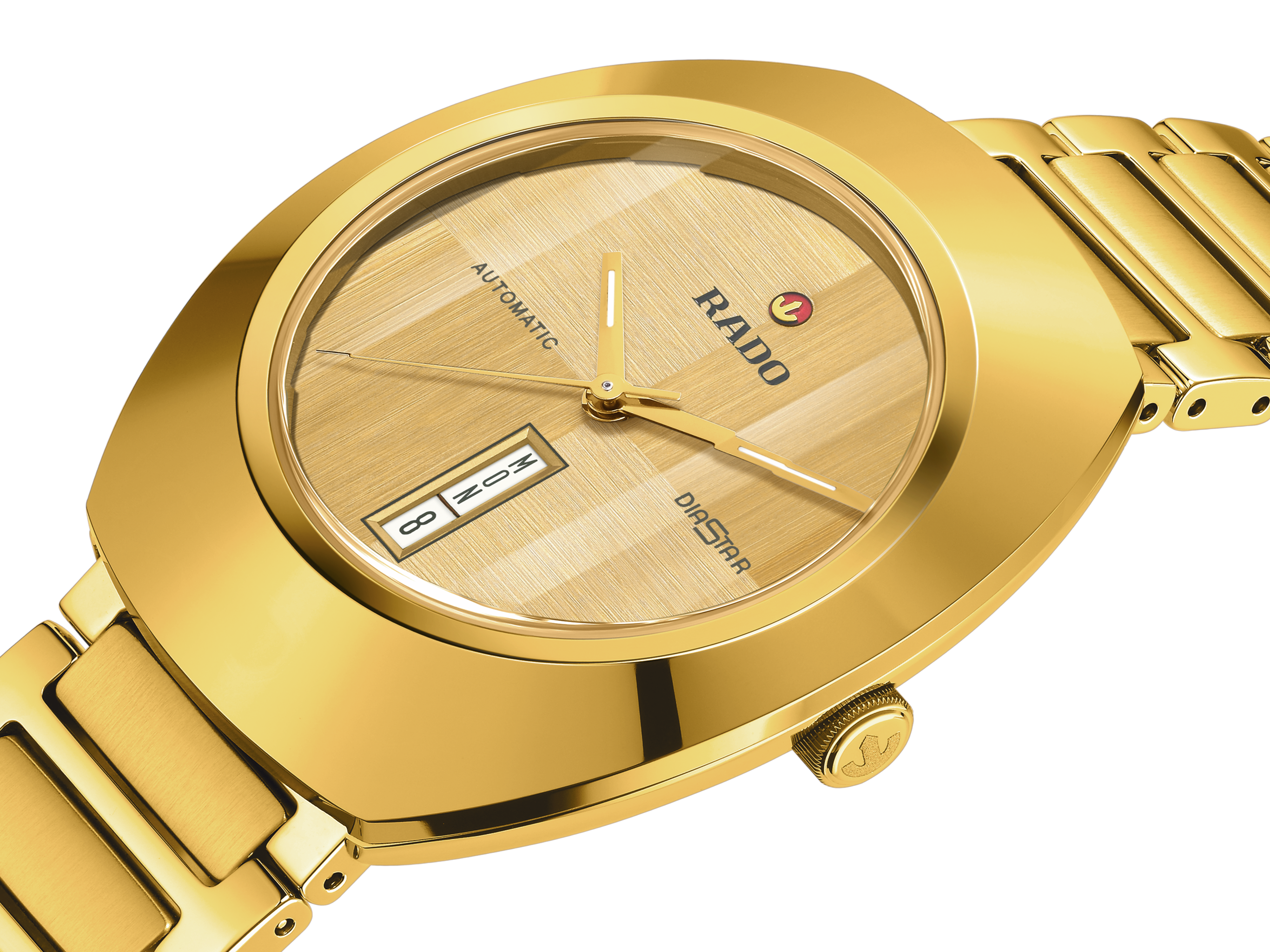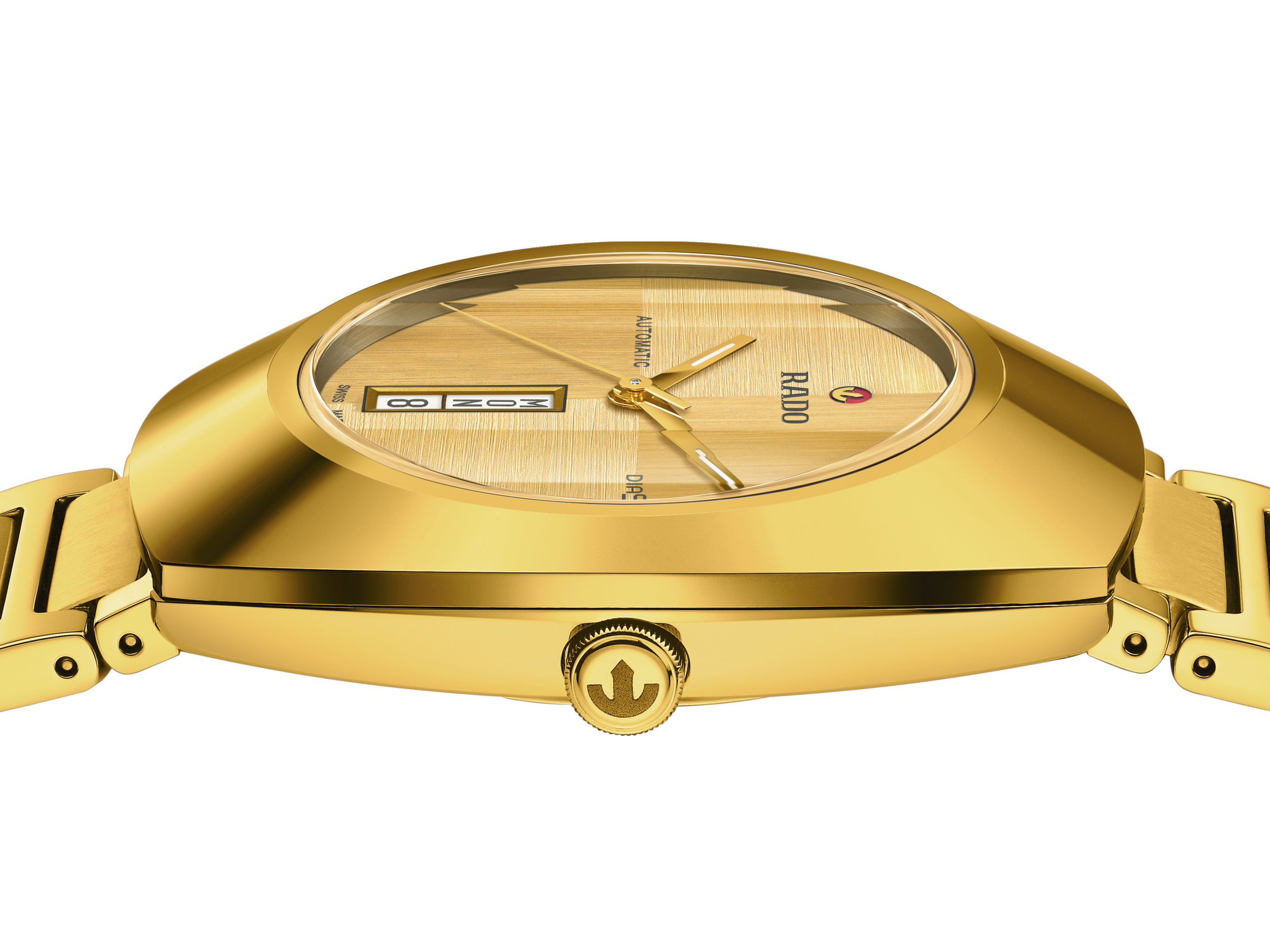 The unique DiaStar Original has a diameter of 38 mm and is water resistant down to 100 m. Framed by an ultra-shiny yellow gold-coloured Ceramos™ coiffe with polished angles and detailing set over a matching, yellow gold-coloured PVD coated stainless-steel case, this beautiful watch is rounded off with a parallel-stripe-faceted sapphire crystal. Specifications include a gold brushed dial with two directions, yellow gold-coloured hands with white Super-LumiNova®, and a white day date display. The Rado R764 automatic movement offers 80 hours of power reserve, with an antimagnetic Nivachron™ balance spring. The bracelet is made of yellow gold PVD coated polished and brushed stainless steel.