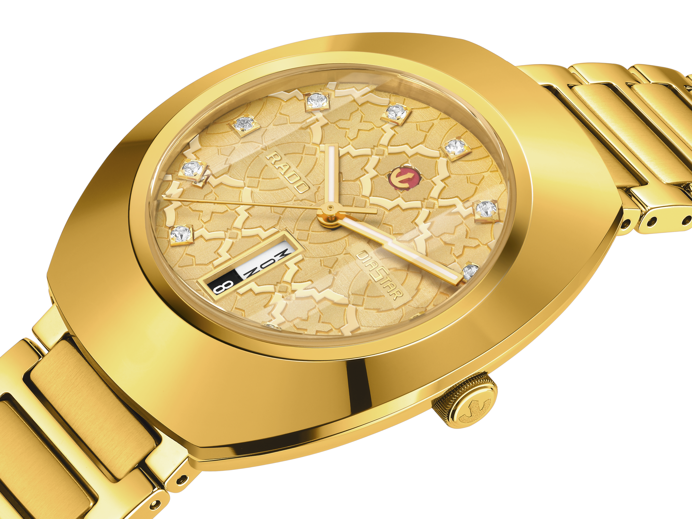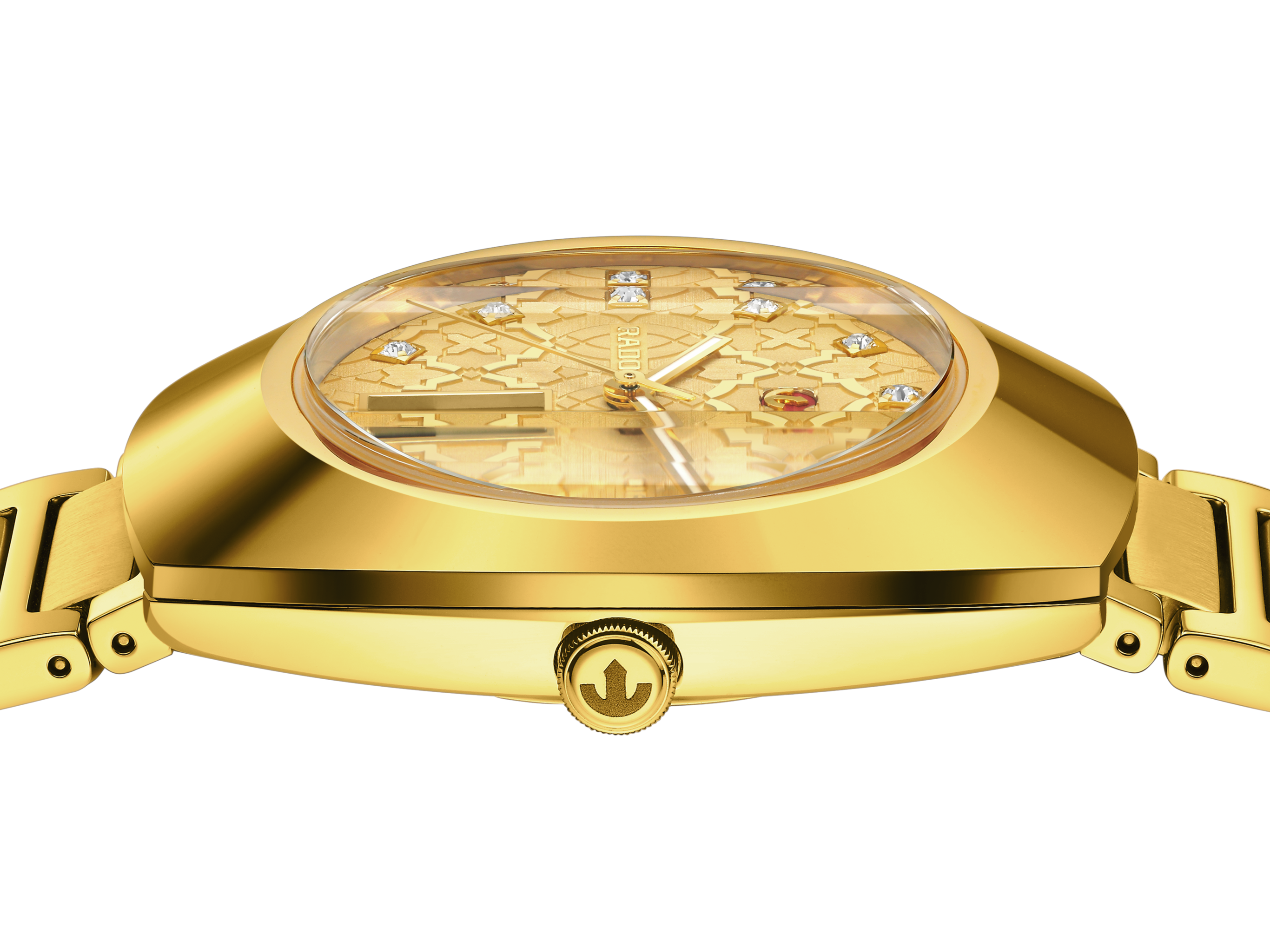 The dial features a mosaic style pattern, with different shapes given different finishes, each finish on a different level. This multi layered effect giving the watch dial depth and intrigue. Eleven, clear, crystal stones complete the look. A design classic from Rado.