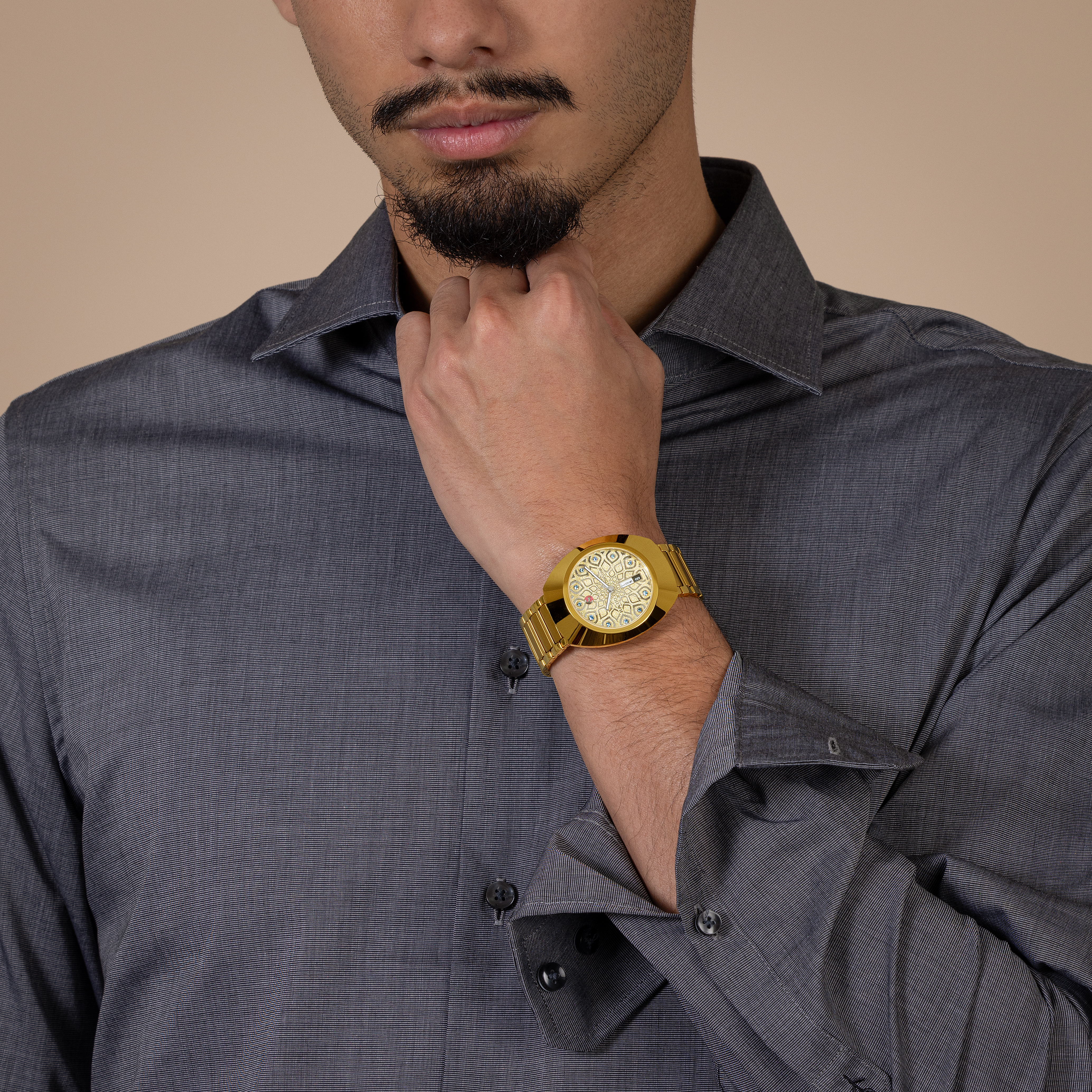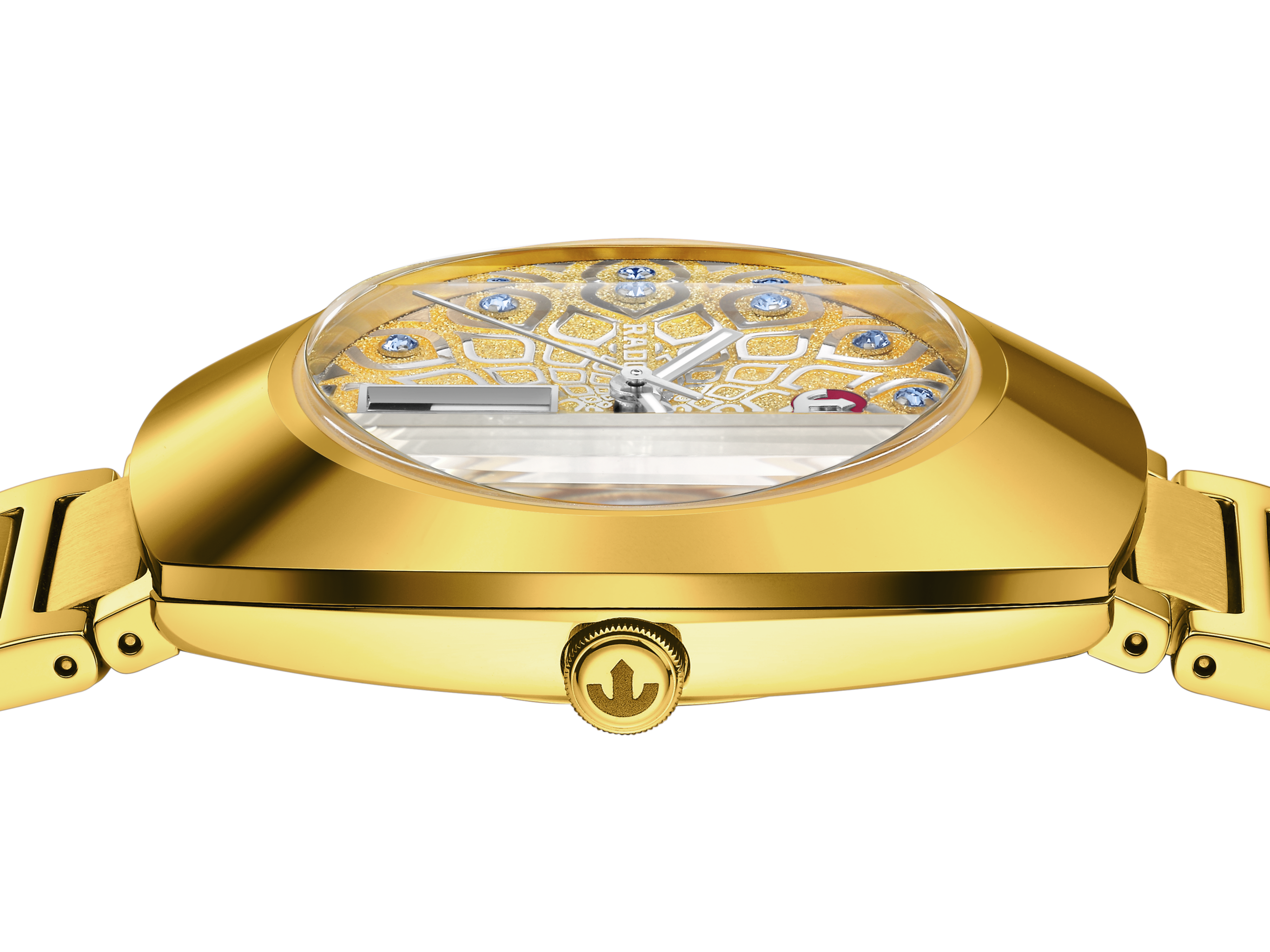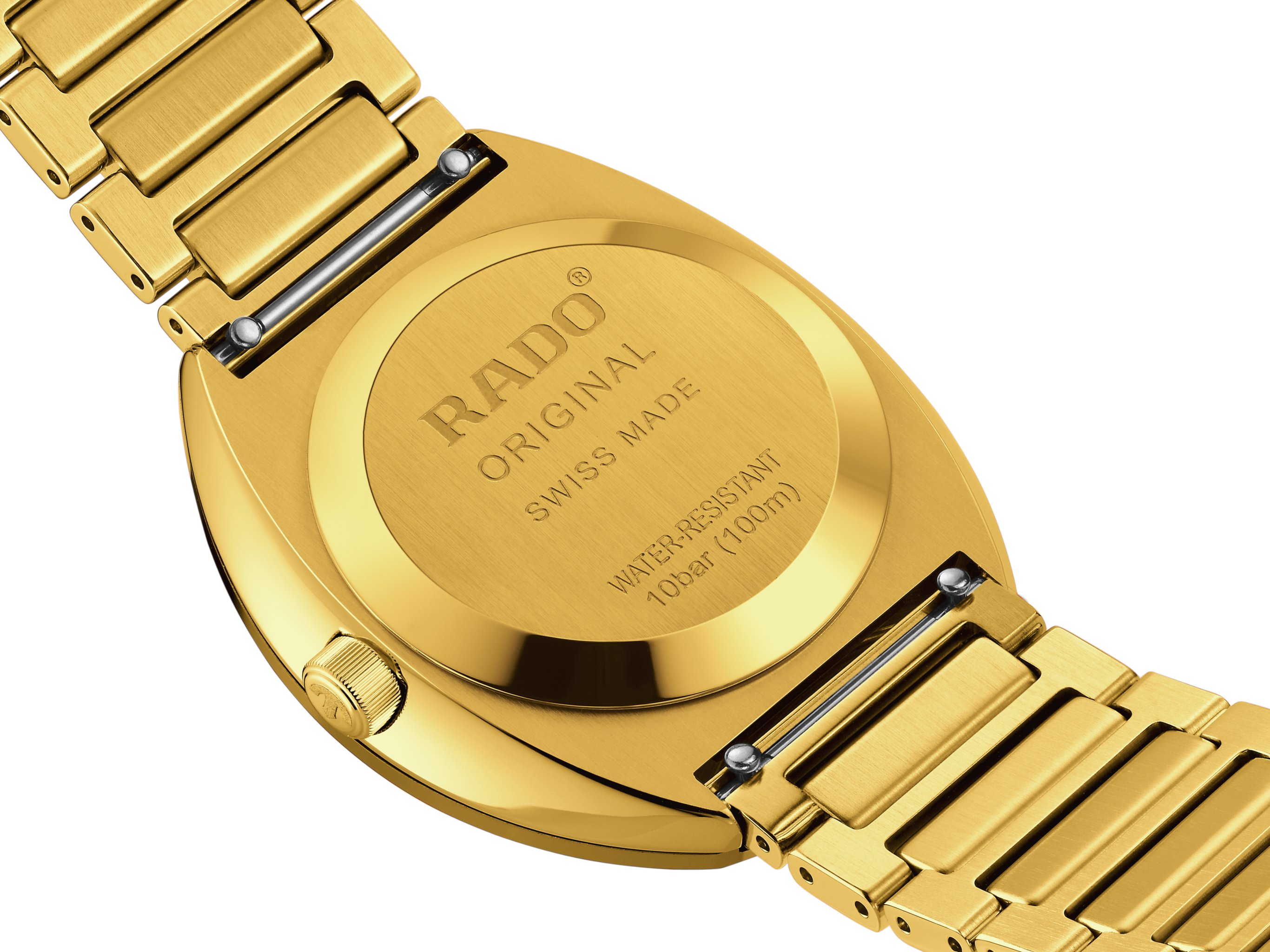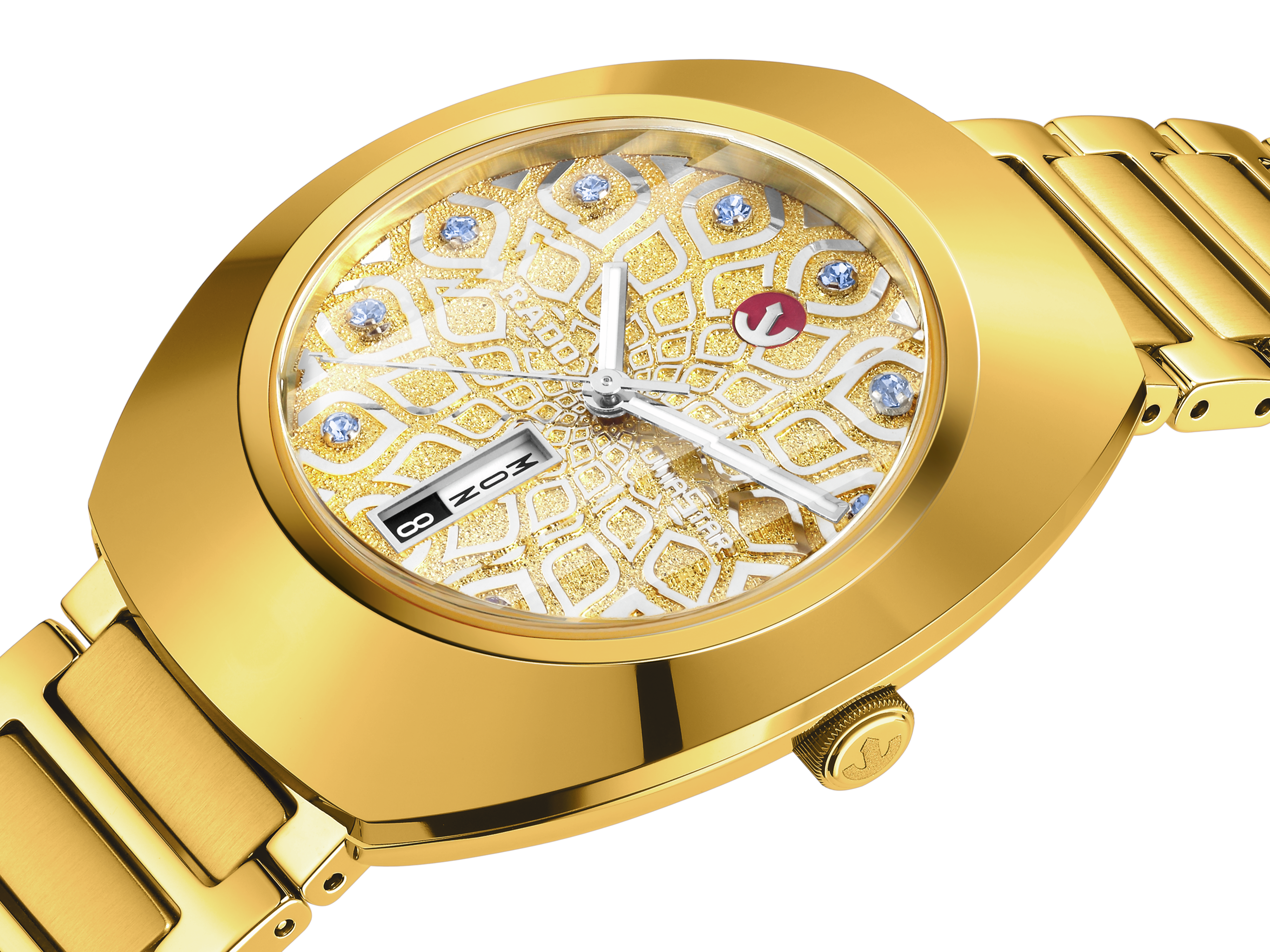 The unique DiaStar Original has a diameter of 38 mm and is water resistant down to 100 m. Framed by an ultra-shiny yellow gold couloured Ceramos™ coiffe with polished angles and detailing set over a matching, yellow gold couloured PVD coated stainless-steel case, this beautiful watch is rounded off with a vertical faceted sapphire crystal. Specifications include rhodium coloured hands with white Super-LumiNova®, and a white day display and a black date display. The dial features eleven light blue cubic zirconia, on a rhodium coloured harmonic pattern on a diamond powder decoration. The Rado R764 automatic movement offers 80 hours of power reserve, with an antimagnetic Nivachron™ balance spring. The bracelet is made of yellow gold PVD coated polished and brushed stainless steel.