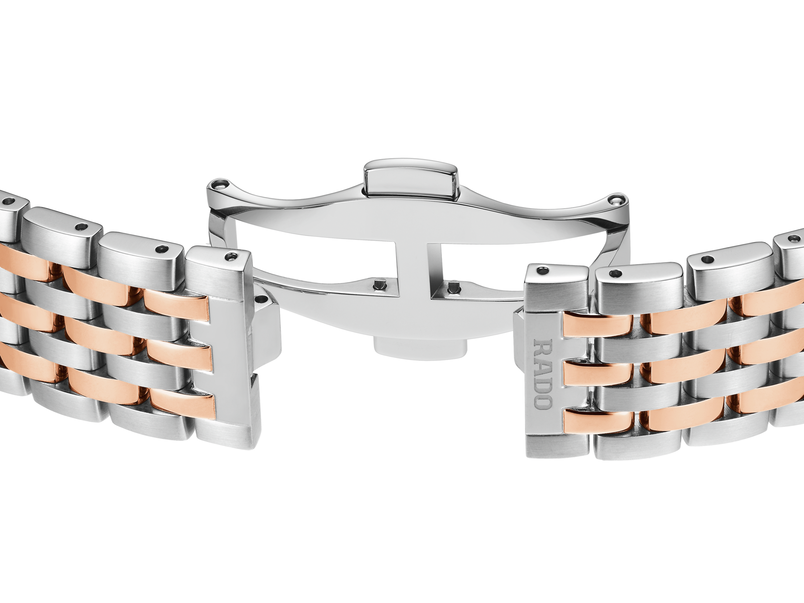 The case is complemented by a bi-tone bracelet combining polished rose gold-coloured PVD-coated stainless steel links with brushed stainless steel links, secured by a stainless steel three-fold clasp. Beneath the box-shaped sapphire crystal case back lies the soul of the Florence: the Automatic R763 calibre. Finely regulated in five positions and featuring a Nivachron™ hairspring, this movement delivers a high level of accuracy and a robust 80-hour power reserve, underlining Rado's commitment to perfection.