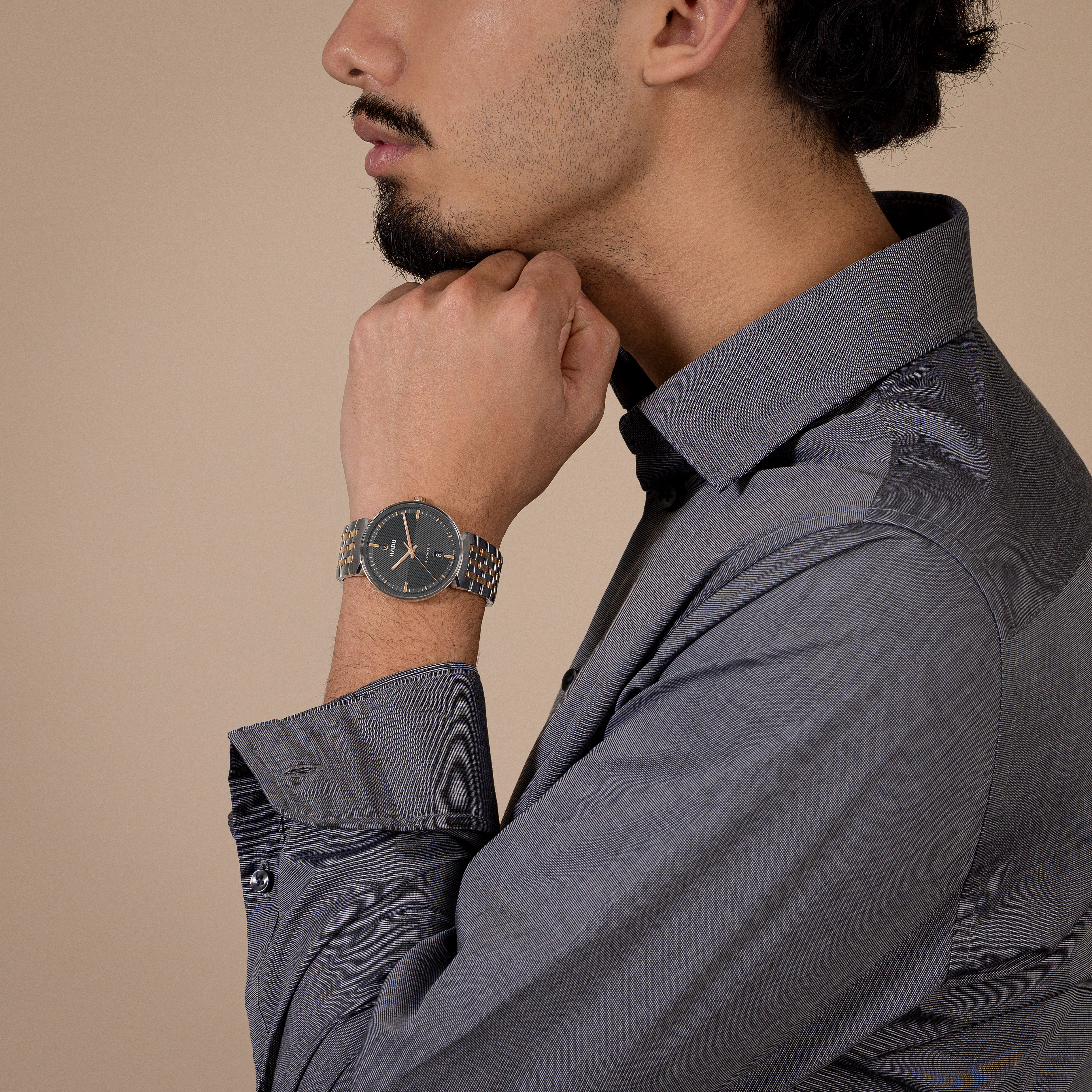 Serving as a theatre scene, the grey dial showcases extreme attention to detail with its sophisticated embossed pattern. The contrasting rose gold-coloured applied hour markers, topped by the moving Rado anchor symbol, finished with brushing and polishing, create a hypnotising contrast against the grey background.