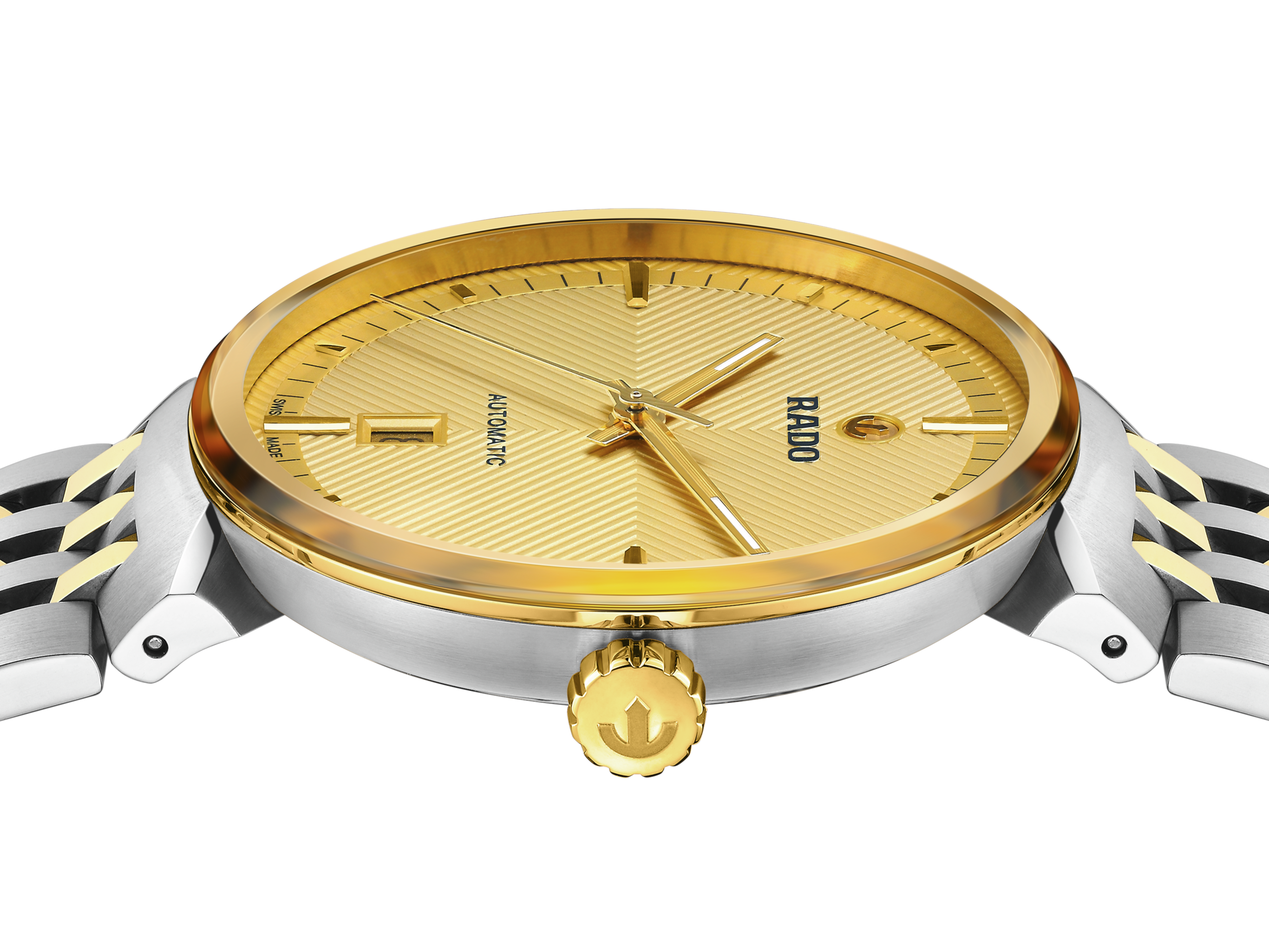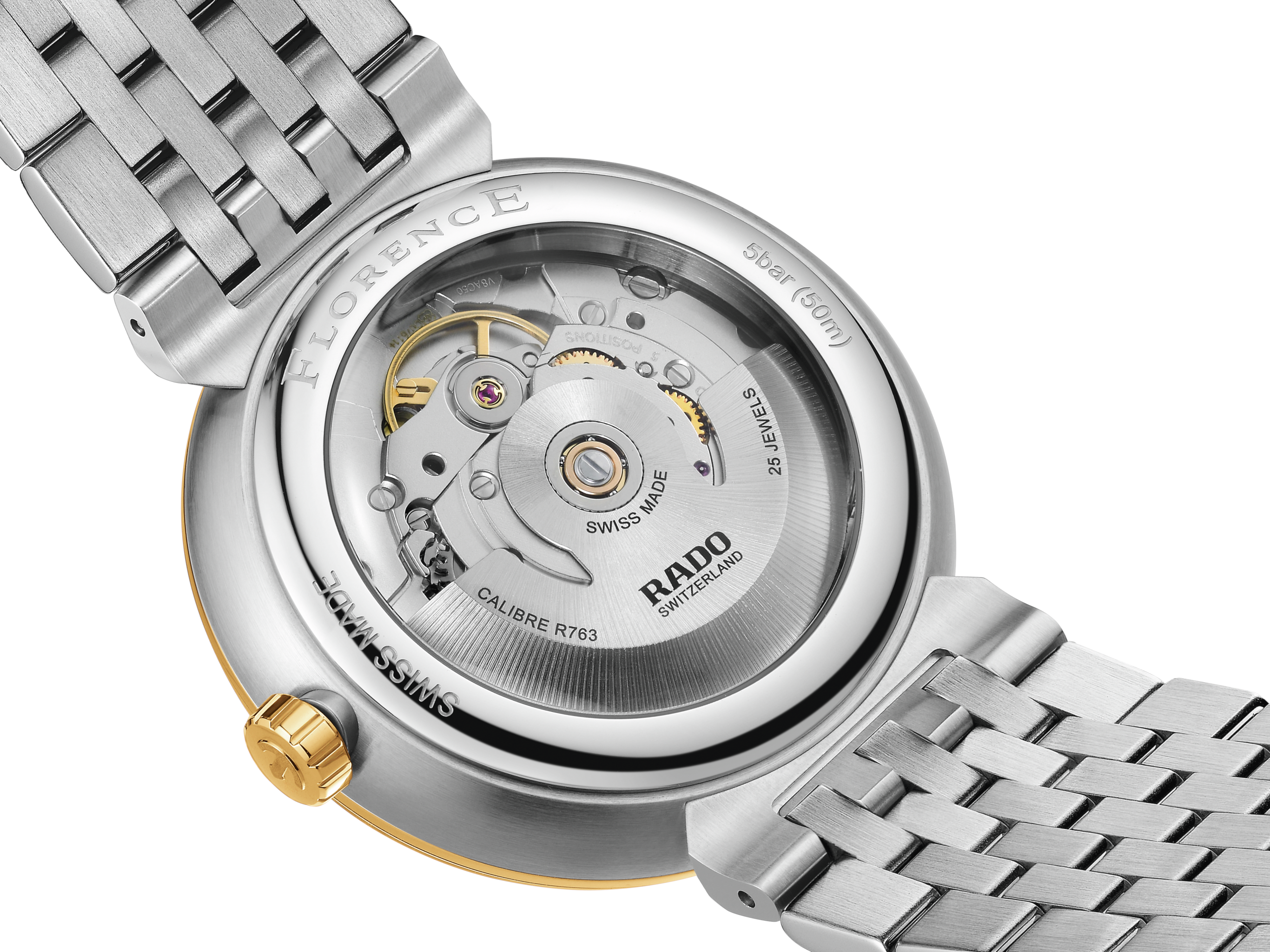 The case is complemented by a bi-tone bracelet combining polished yellow gold-colored PVD-coated stainless steel links with brushed stainless steel links, secured by a stainless steel three-fold clasp. Beneath the box-shaped sapphire crystal case back lies the soul of the Florence : the Automatic R763 caliber. Finely regulated in five positions and featuring a Nivachron™ hairspring, this movement delivers a high level of accuracy and a robust 80-hour power reserve, underlining Rado's commitment to perfection.