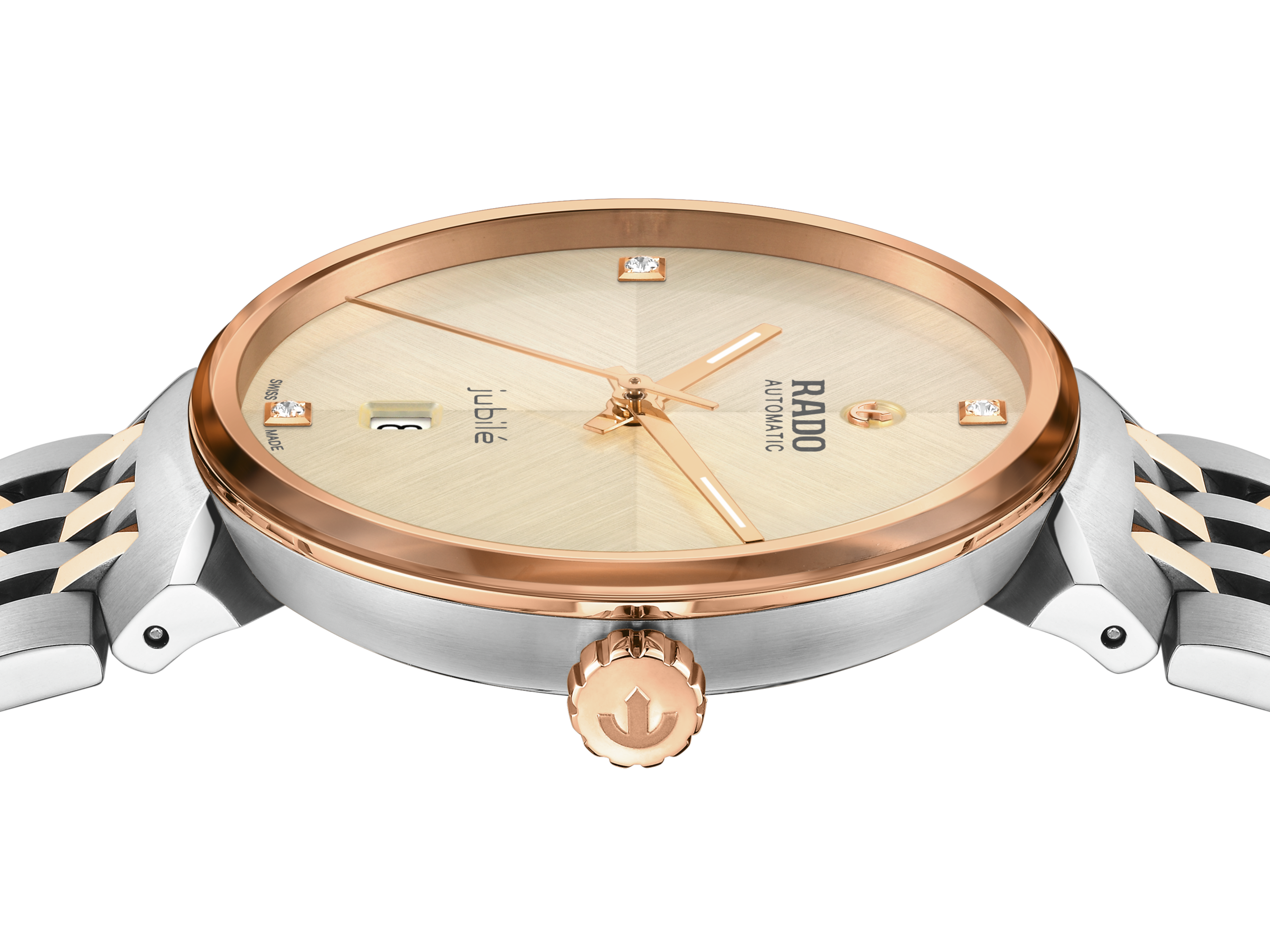 Rado Florence brings the beauty of Renaissance Italy to the wrist. For optimal comfort, a premium seven-link bracelet in brushed stainless steel with polished rose gold-coloured alternate middle links. The slim case in polished and brushed stainless steel holds a polished rose gold PVD-coated bezel framing rose gold-coloured metallisation on the robust, edge-to-edge sapphire crystal glass. Rose gold-coloured hands with white Super-LumiNova® highlights glide above the champagne-coloured dial with the characteristic four diamonds at hours 3, 6, 9 and 12, and a bi-directional brushed finish. Thanks to the box-shaped sapphire crystal exhibition case back, the designers could retain the iconic slim profile. This elegant timepiece is powered by the Rado calibre R763, an automatic 3-hand, 25-jewel movement with an anti-magnetic NivachronTM hairspring for enhanced reliability and precision. The harmonious aesthetic contrasts the sandblasted case with the polished bezel and case back, echoed by the bracelet’s high-contrast sandblasted and polished links.