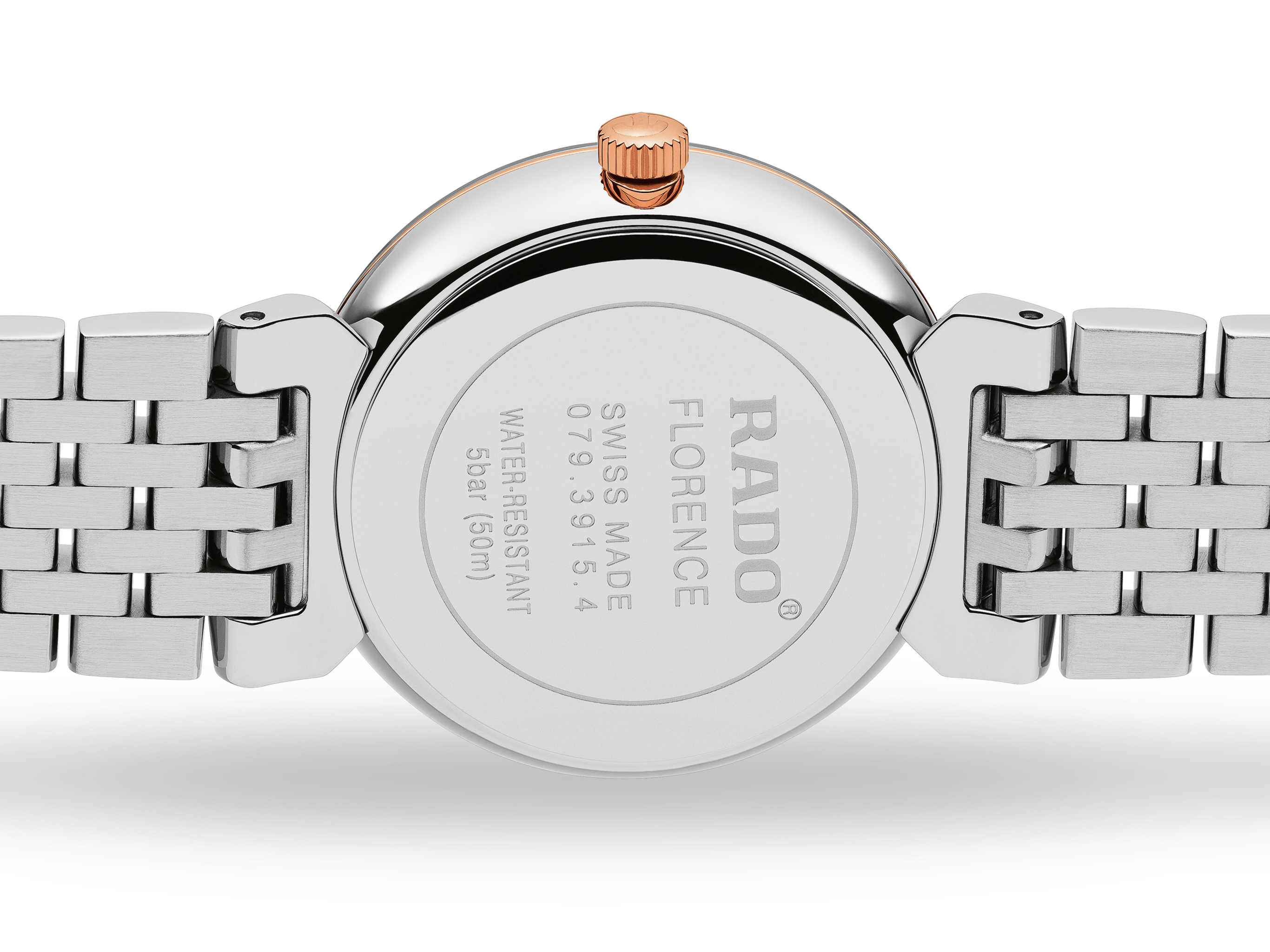 Гармоничный дизайн Rado Florence напоминает об элегантных силуэтах куполов и башенок города, чье название взято за основу названия этих часов. Благодаря качественному кварцевому часовому механизму и инновационному, полностью металлизированному сапфировому стеклу и неблекнущему сиянию бриллиантов, эти швейцарские часы с легкостью пройдут испытание временем. Стрелки с родиевым покрытием скользят по циферблату с бриллиантовыми делениями на 3, 6, 9 и 12 часов. Их сверкающее присутствие в новой коллекции Florence Classic подчеркивается возвращением логотипа Jubilé.