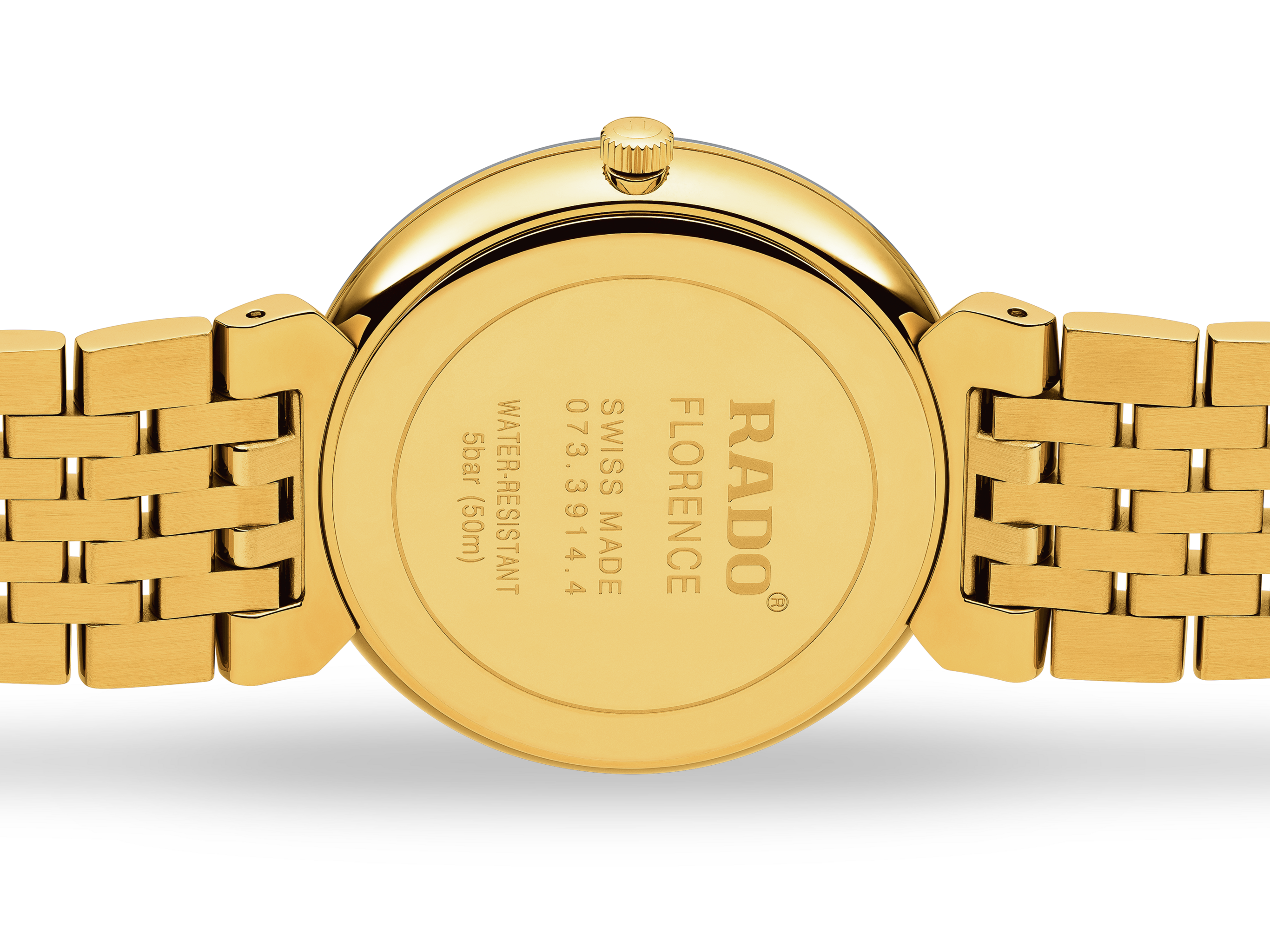 Гармоничный дизайн Rado Florence напоминает об элегантных силуэтах куполов и башенок города, чье название взято за основу названия этих часов. Благодаря качественному кварцевому часовому механизму и инновационному, полностью металлизированному сапфировому стеклу и неблекнущему сиянию бриллиантов, эти швейцарские часы с легкостью пройдут испытание временем. Стрелки с родиевым покрытием скользят по циферблату с бриллиантовыми делениями на 3, 6, 9 и 12 часов. Их сверкающее присутствие в новой коллекции Florence Classic подчеркивается возвращением логотипа Jubilé.