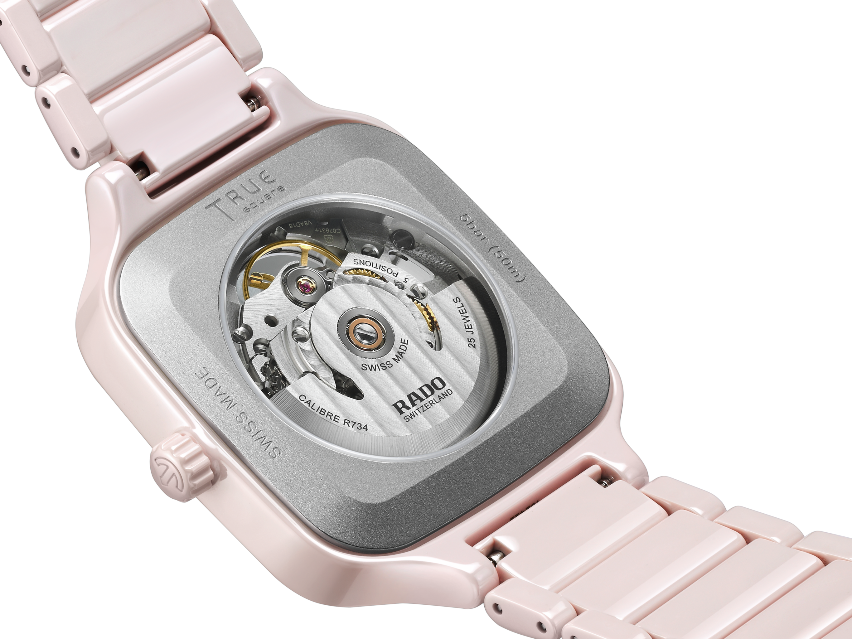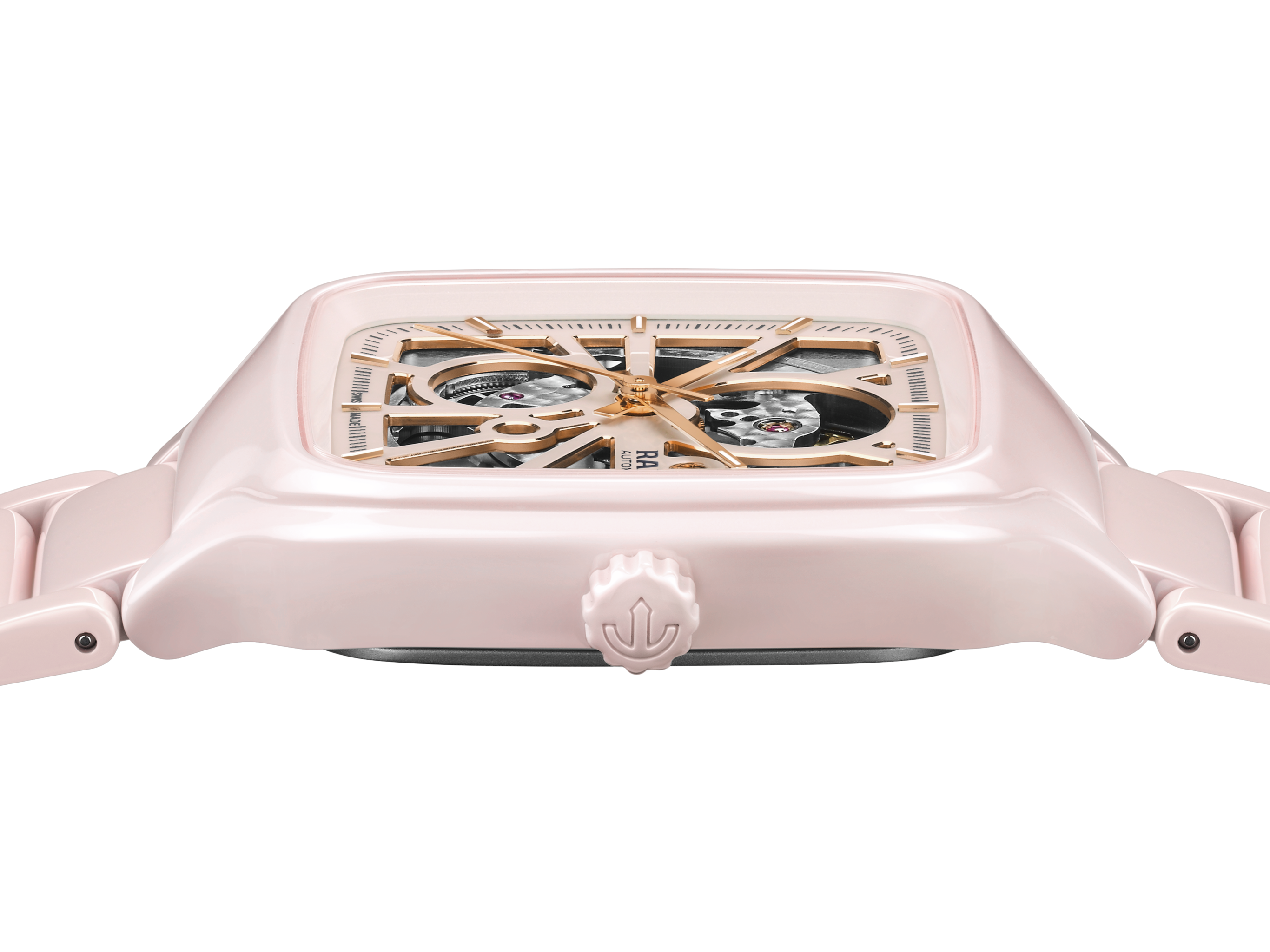 The 38mm polished rose high-tech ceramic monobloc case is lightweight, hypoallergenic with exceptional hardness and durability, rated at 1,250 Vickers. It forms a resilient case for the calibre R734, equipped with 25 jewels, an 80-hour power reserve and an antimagnetic Nivachron™ hairspring.