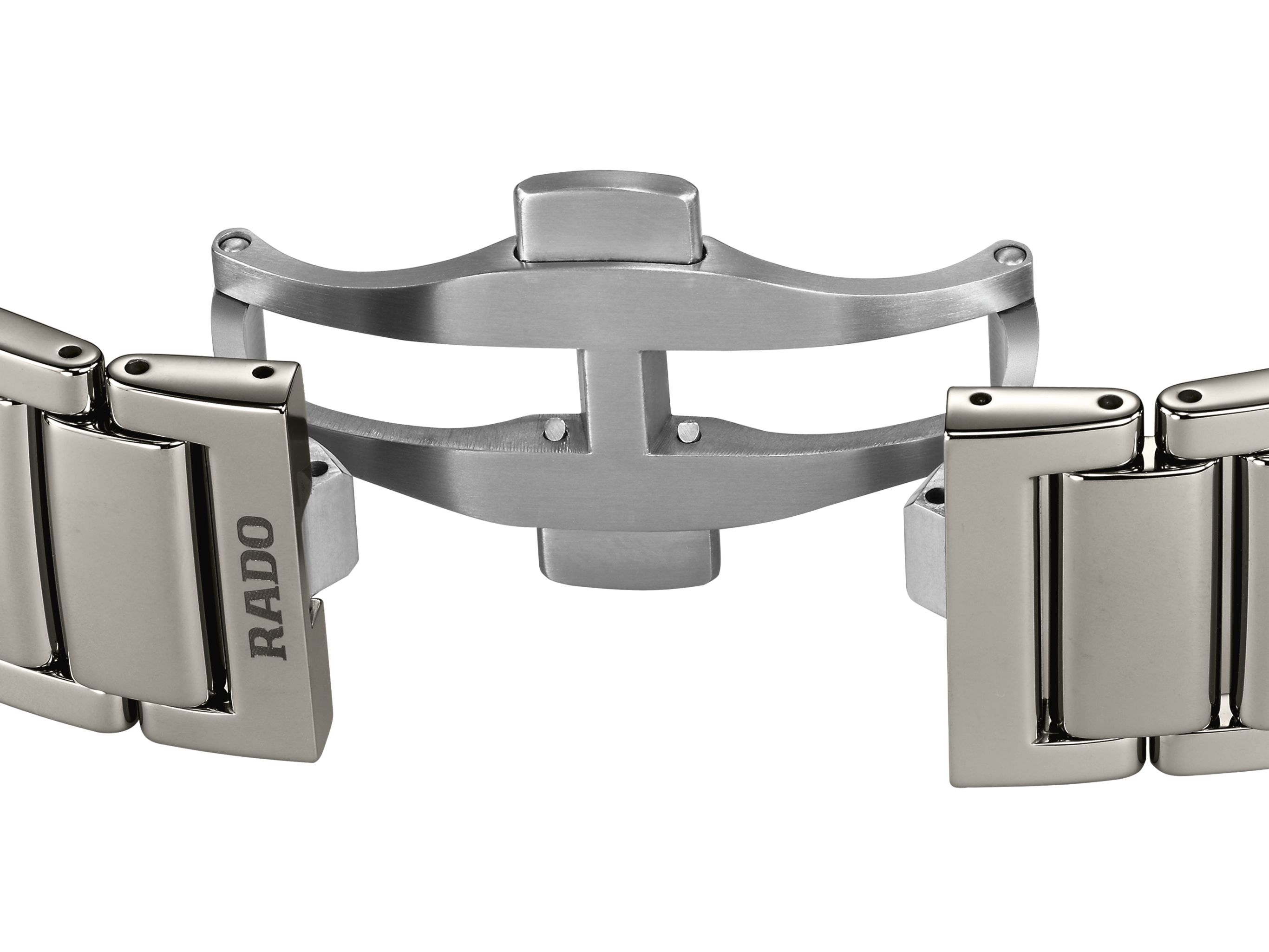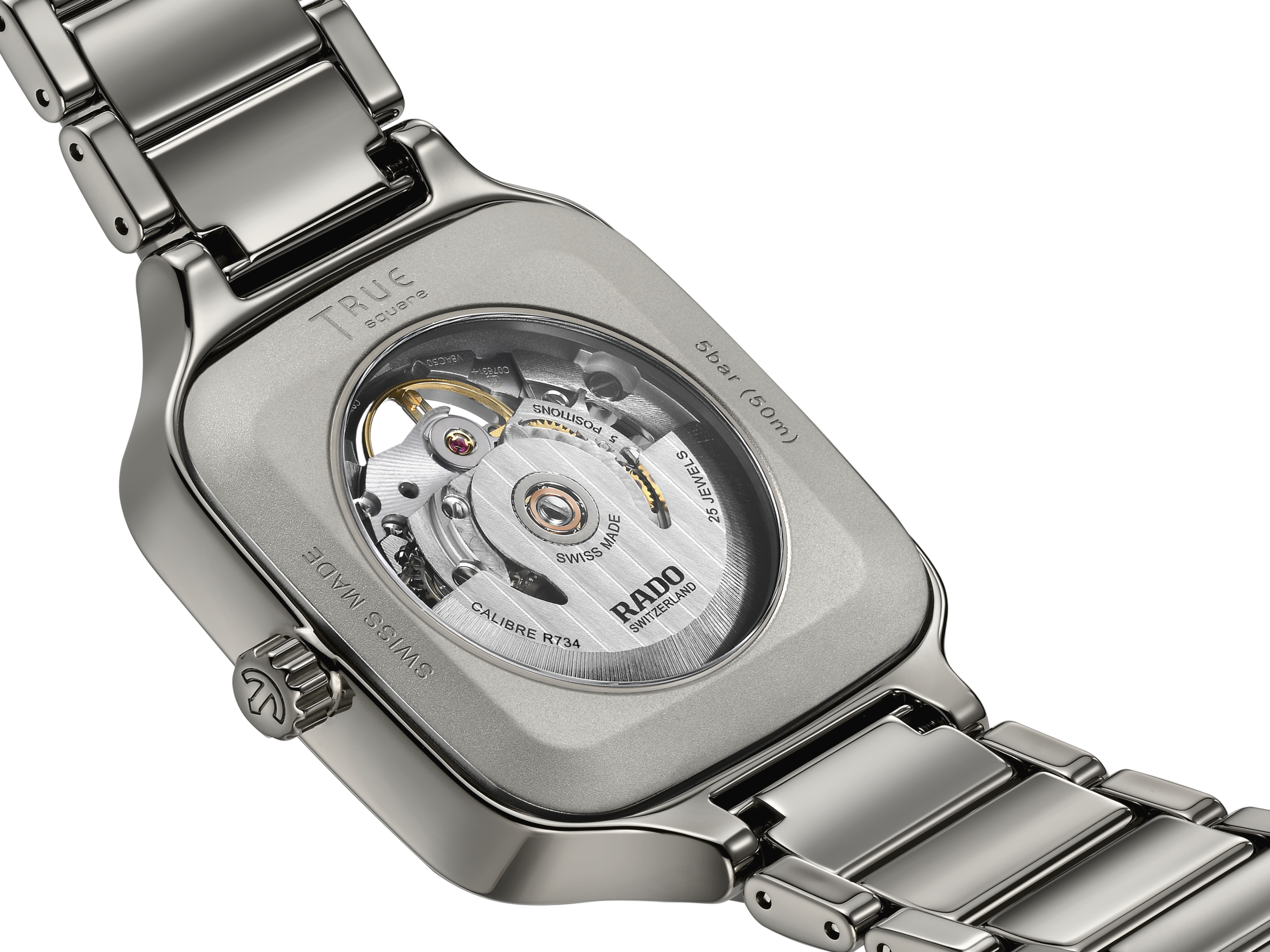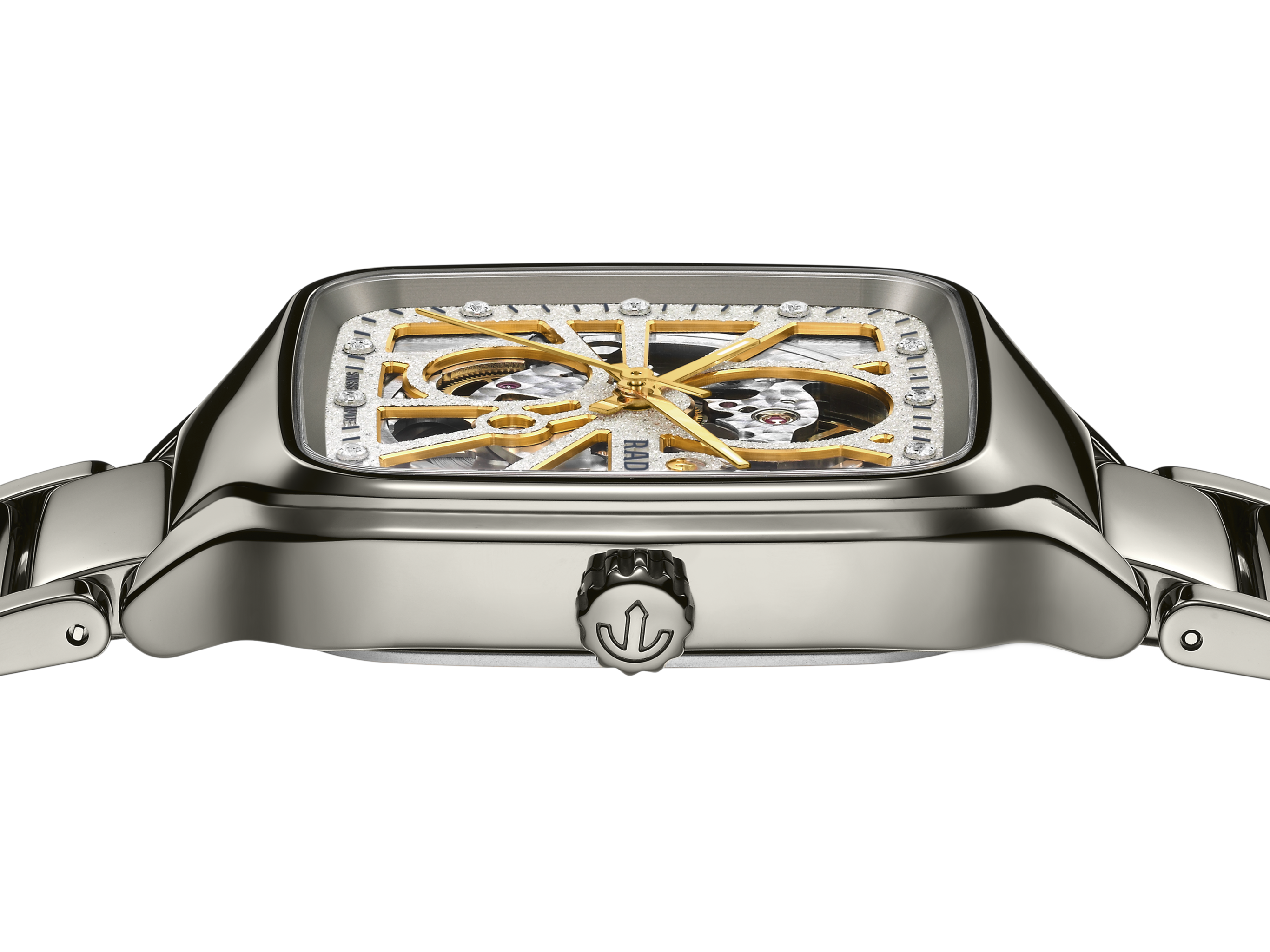This Rado True Square Open Heart lights up with top-class diamonds, a sparkling new dial and a monobloc square case in polished plasma high-tech ceramic. A sapphire crystal glass adds lustre to the dial with 12 diamond indexes and a rhodium-coloured diamond powder-like finish. A low-relief grey minute track circles yellow gold-coloured hour and minute hands with Super-LumiNova® highlights, and a yellow gold-coloured second hand. Cut-away windows draw the eye into the heart of the watch, where the Rado calibre R734 automatic movement delivers reliable accuracy with an anti-magnetic NivachronTM hairspring and a remarkable 80-hour power reserve. The dial was developed using a unique electro-forming process that produces a diamond-powder like finish and permits the Rado logo, markings and minute tracks to be raised in relief from the base of the dial, the end result of galvanic growth. Polished plasma high-tech ceramic, a dazzling dial and 12 jubilé diamonds combine to create irresistible luxury and elegance.